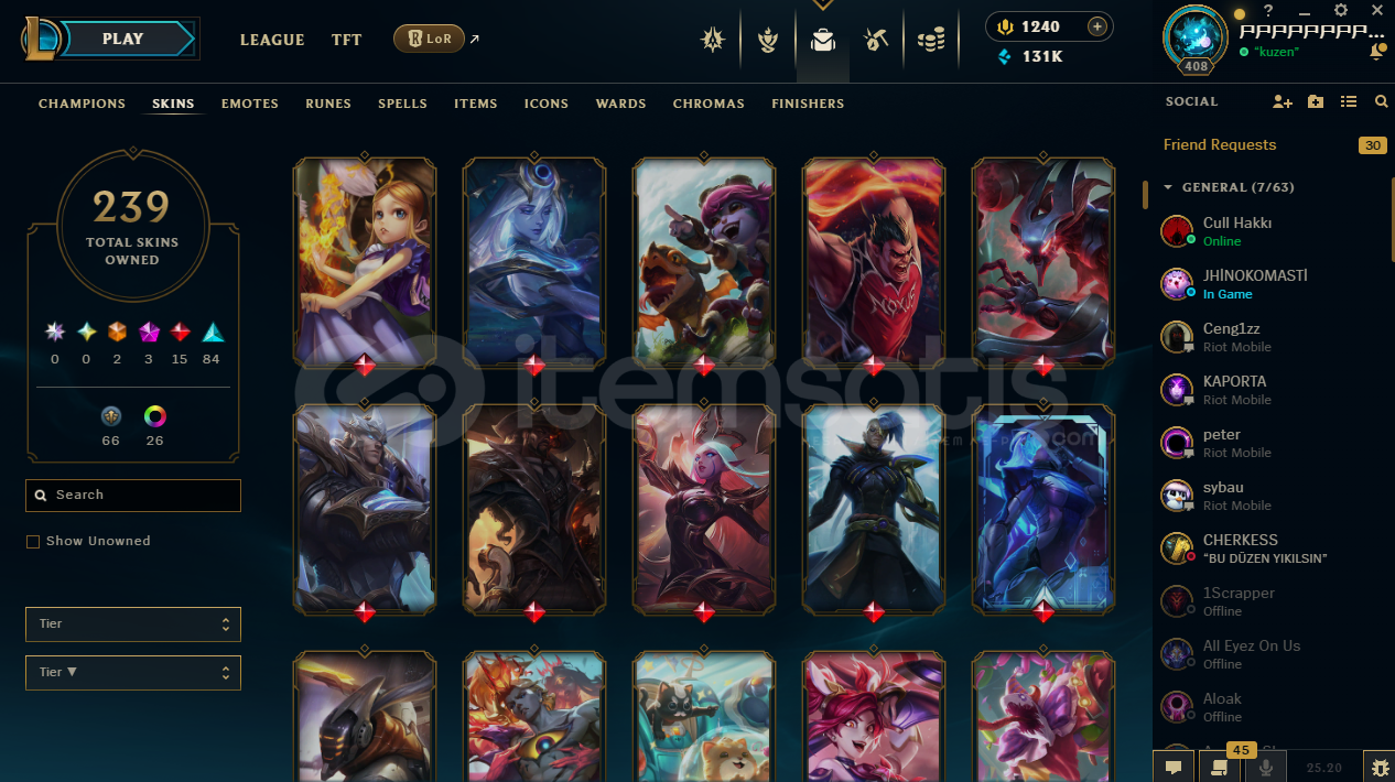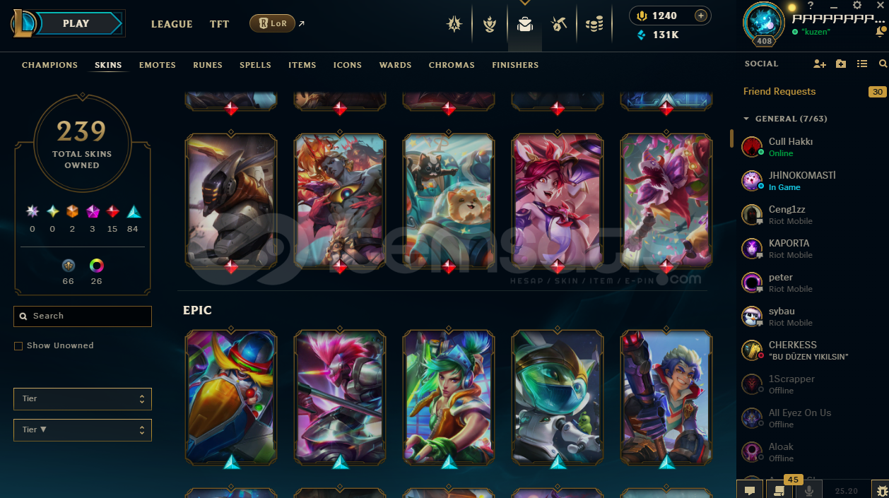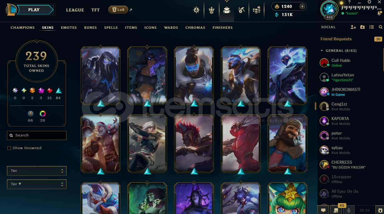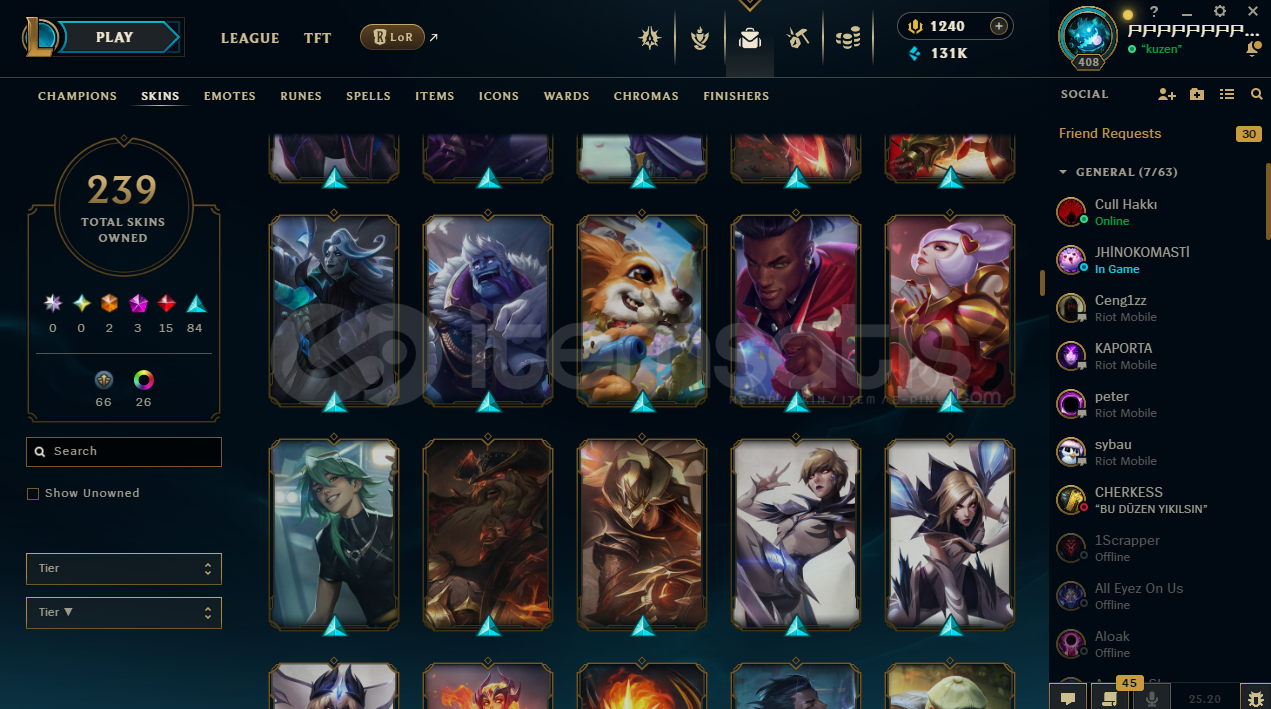 Hesabın İçerisinde: 1240 RP ve 131K Mavi Öz bulunmaktadır.Hesabın Rankı Tek/Çift Zümrüt 1 --- Esnek Rankı Zümrüt 4'türBütün karakterler açıktır.326/159 emojiler açıktır.285 tane ikon açıktır.30 tane totem görünümü açıktır.32 tane kroma açıktır.Hesaptaki skinler :Pulsefire Ezreal (Ultimate Skin)DJ Sona (Ultimat...