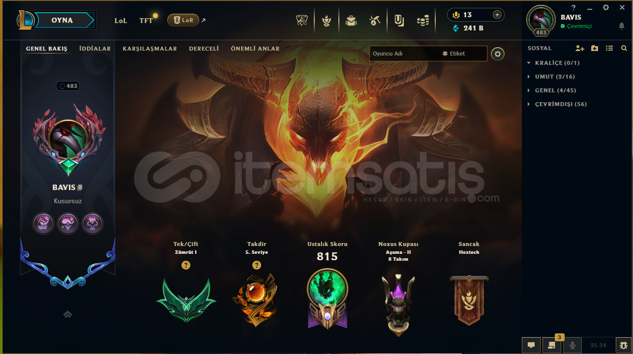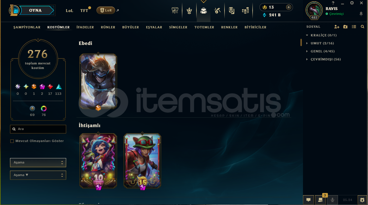 276 KOSTÜM TÜM ŞAMPİYONLAR AÇIK 339 İFADE 349 SİHİRDAR SİMGESİ 65 TOTEM GÖRÜMÜNÜ 241K MAVİ ÖZ 2400 TURUNCU ÖZ 87 RENK PAKETİ 2013 YILINDAN BERİ AKTİF HESAP TFT RANK PLAT 2 LEGENDARY TFT STRATEJİ USTASI (BOL MİKTARDA MAVİ MOR USTA) BOL SAYIDA TFT ARENA GÖRÜNÜMÜ VE ÇATAPATI MEVCUTTUR