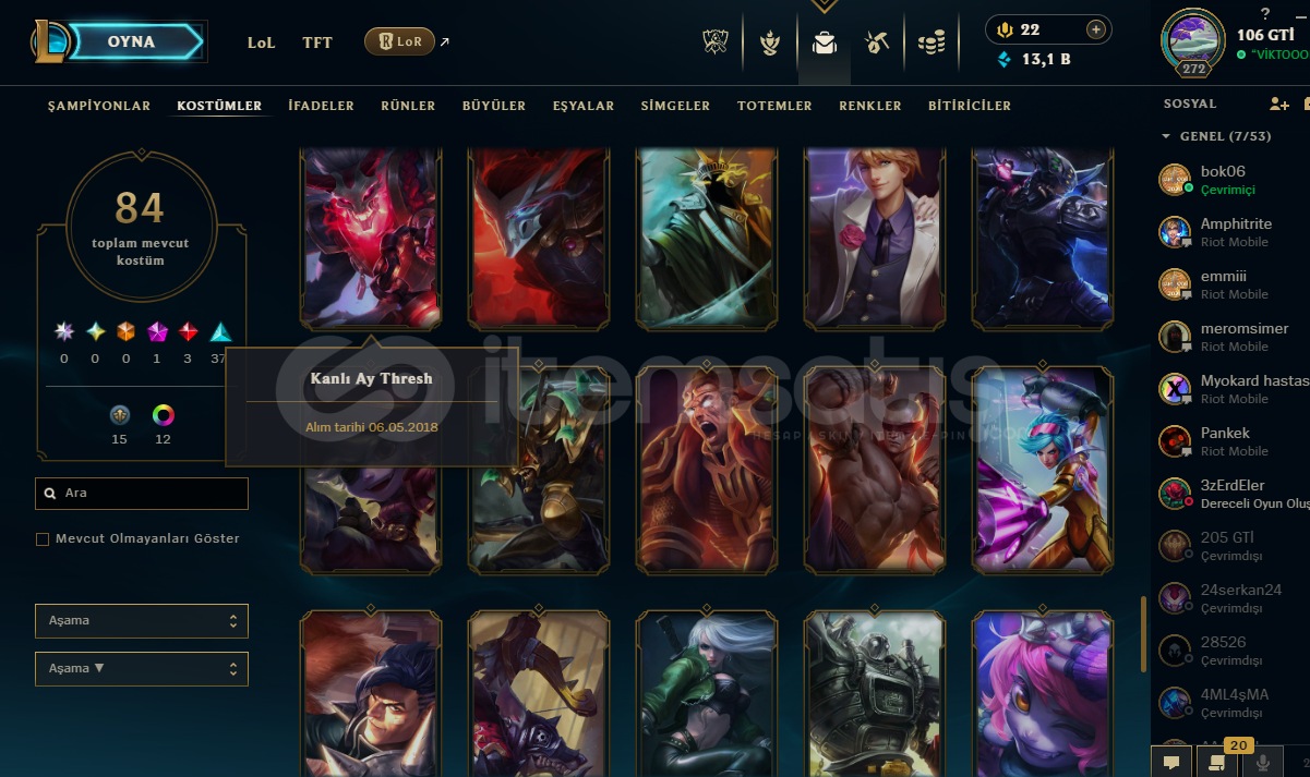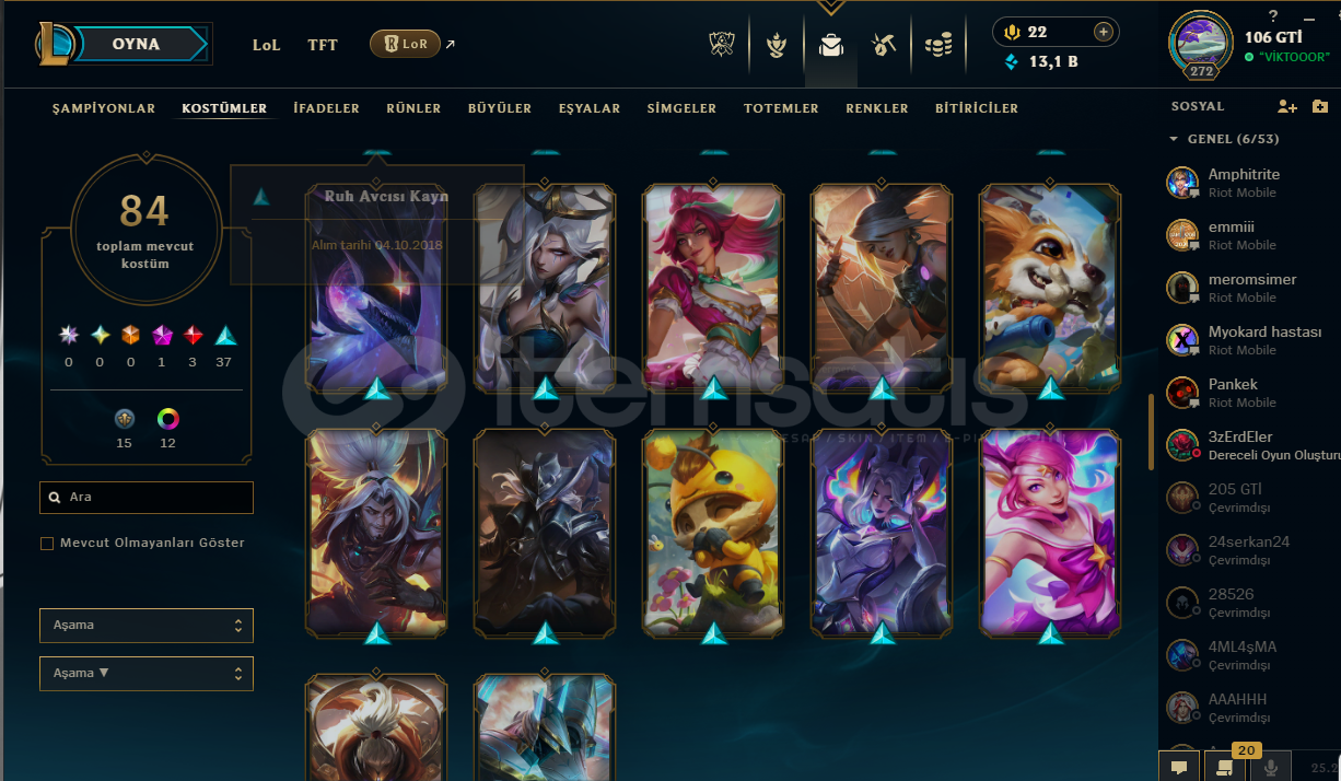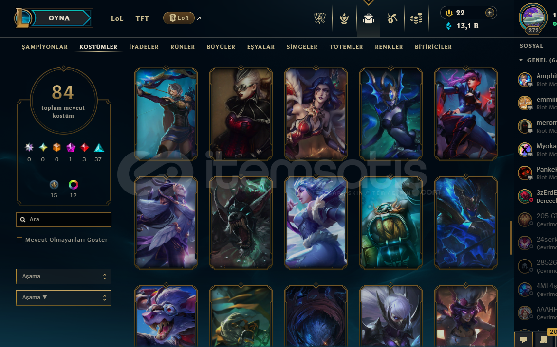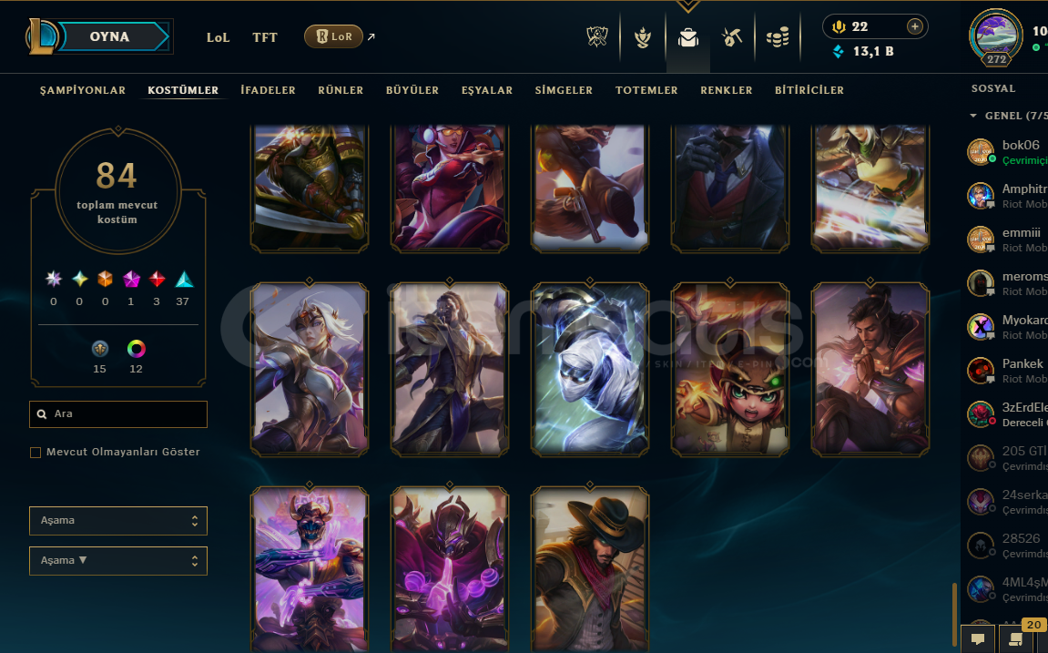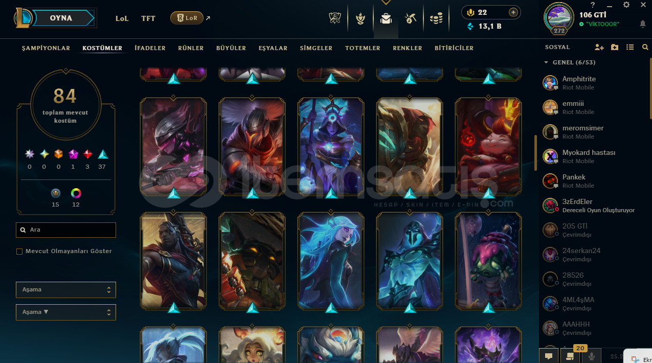 PLAT 1 (Zümrütten düşme) LoL Hesabı Satılık84 kostüm (çoğu nadir)Tüm şampiyonlar açık12 renk paketi16 totem görünümüTakdir seviyesi: 5Hesapta birçok özel ve değerli kostüm mevcut.