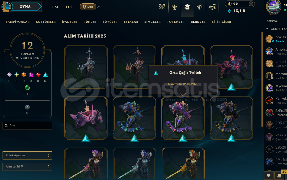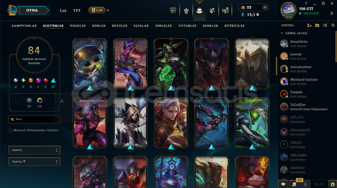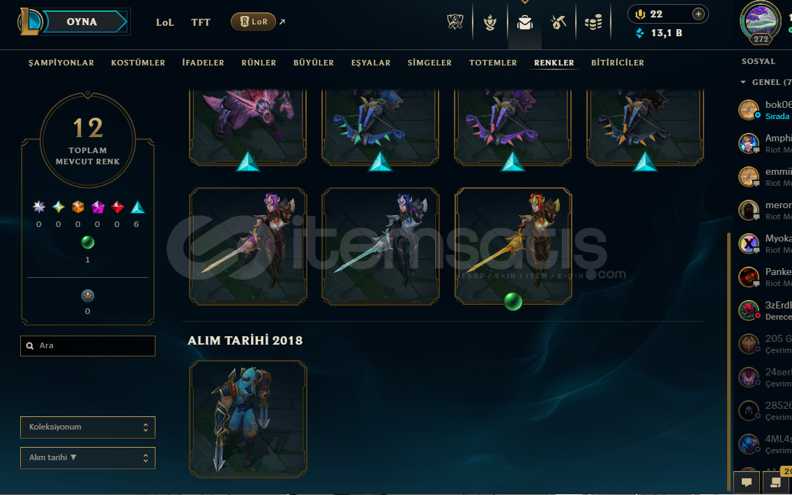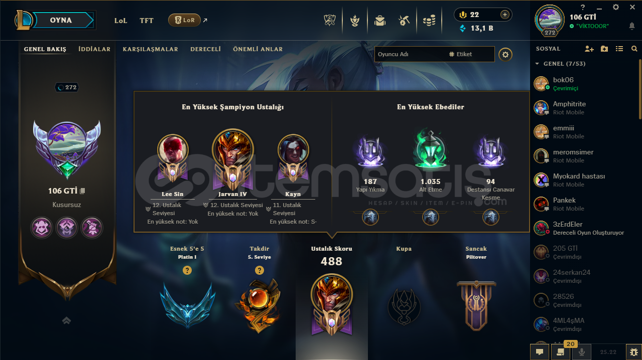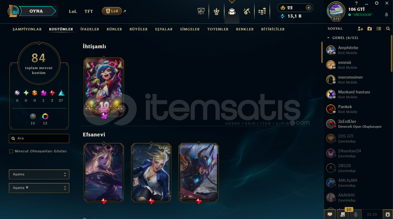 PLAT 1 (Zümrütten düşme) LoL Hesabı Satılık84 kostüm (çoğu nadir)Tüm şampiyonlar açık12 renk paketi16 totem görünümüTakdir seviyesi: 5Hesapta birçok özel ve değerli kostüm mevcut.