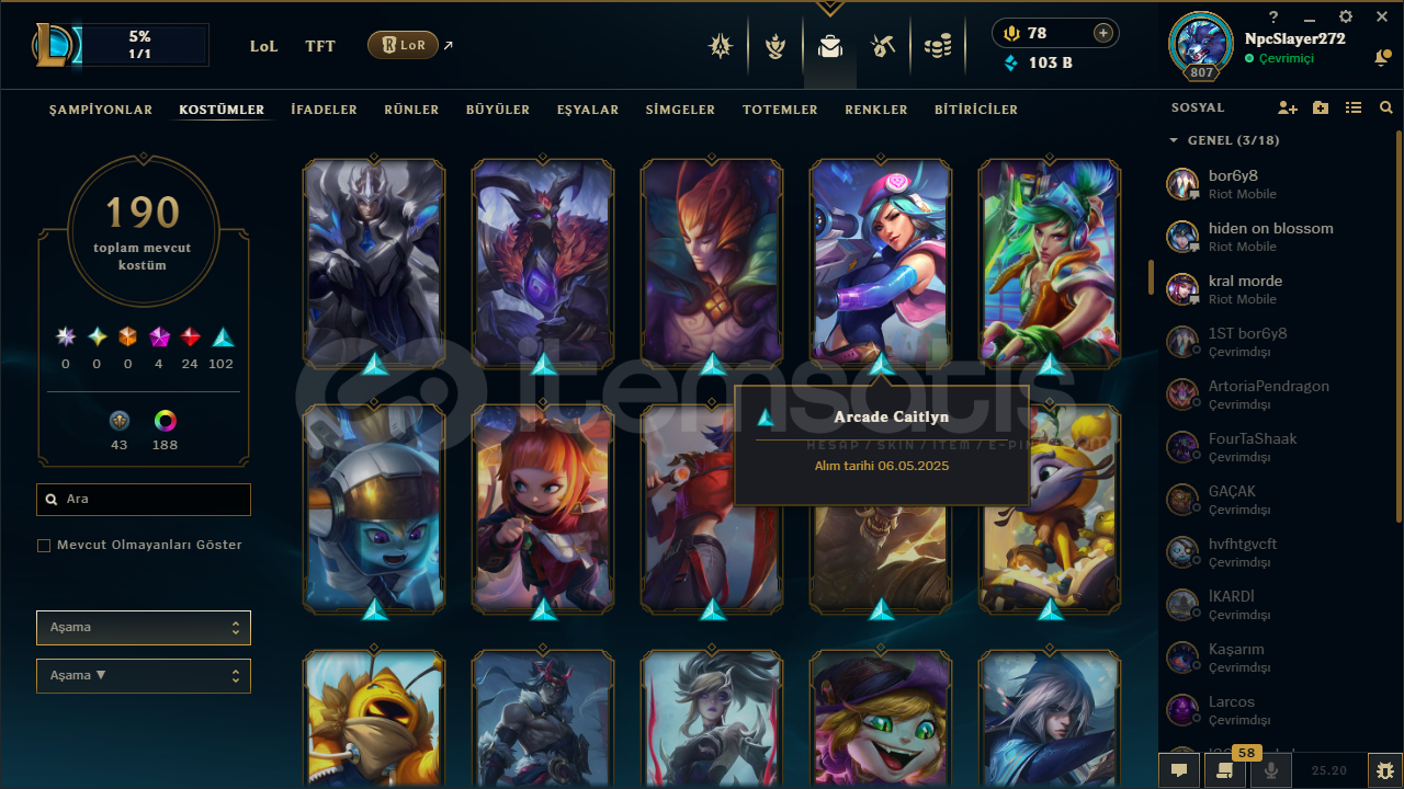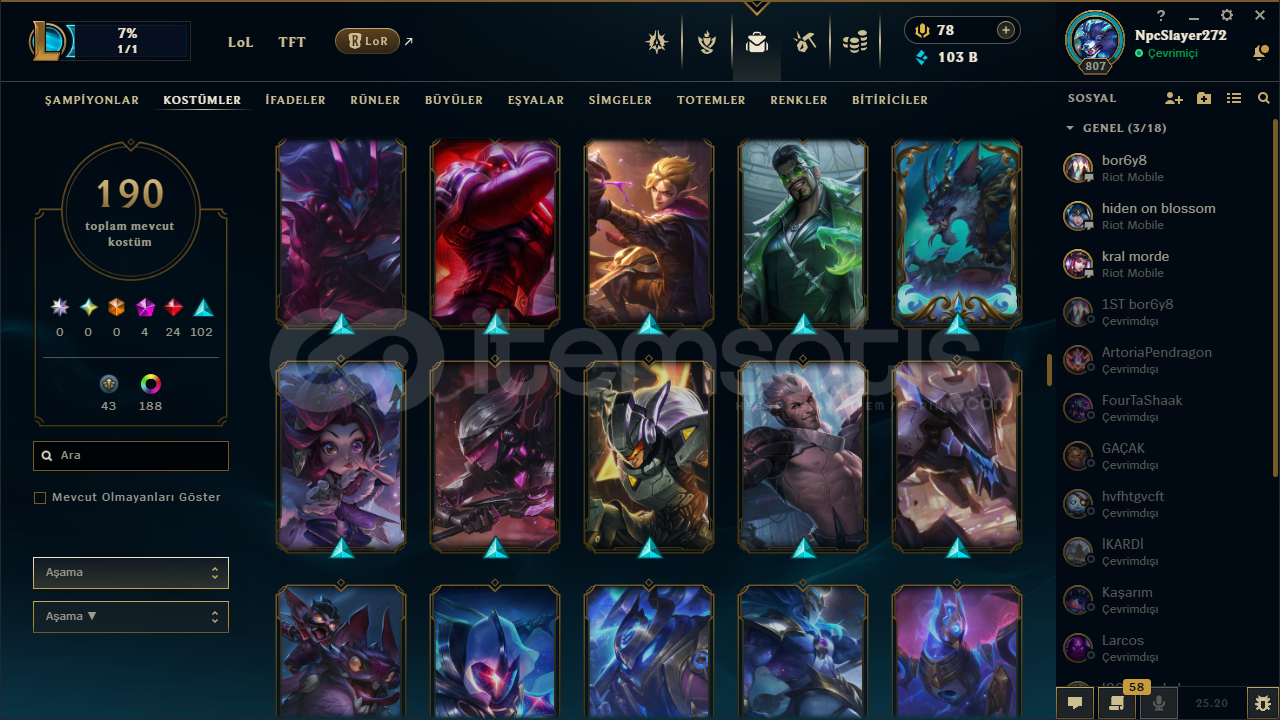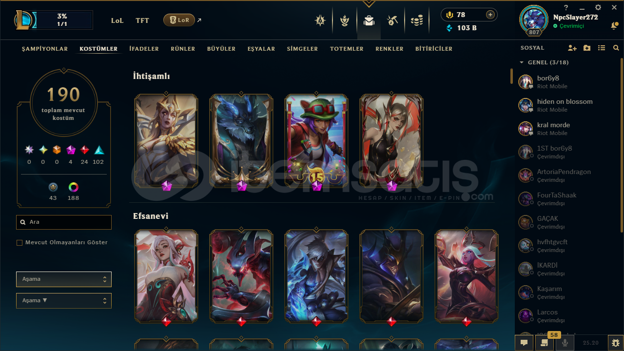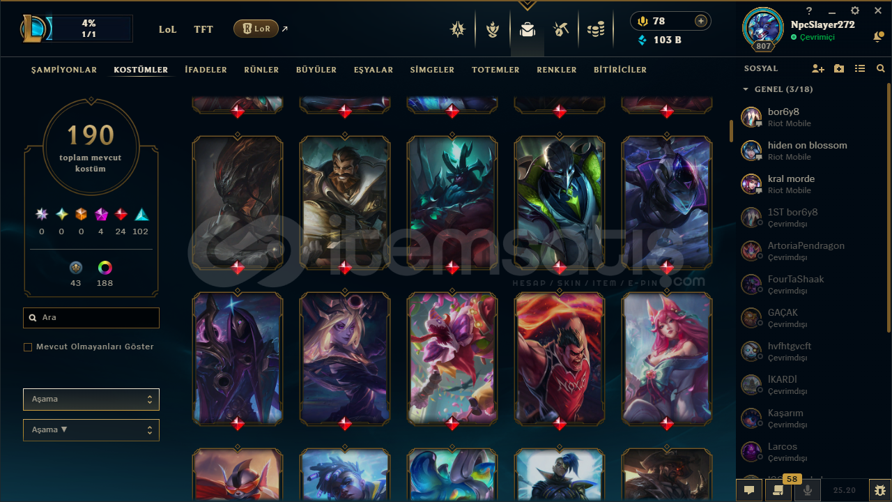 -Gecenin Kılıc Yasuo,kanlı ay,UZAY SERÜVENİ-Lee sin hemen hemen e iyi kostümlerinin tamamı(fırtına ejderi,yüce yumruk,rekabetin dorugu, muay tai,tapınak efendisi,ejderyumruk)-ZED(galaksi katili artı renk paketleri,kazanova,sktt1)-true damage akali-Prestij kışın seçilmşi warwick , kod adı, ay muhafızı,boz warwick-Uzay serüveni kayn,gece tırpanı,buzul kayn-OKYANUS ŞARKISI YONEh...
