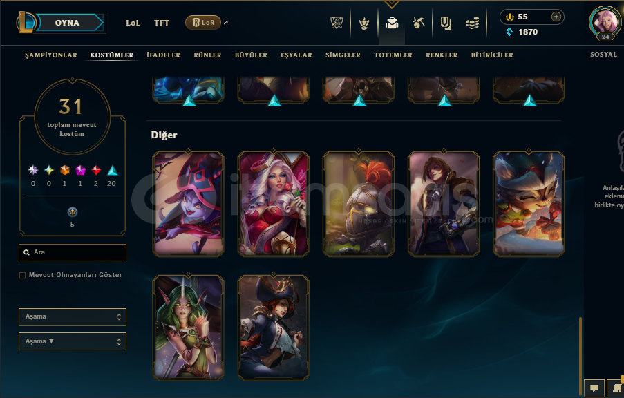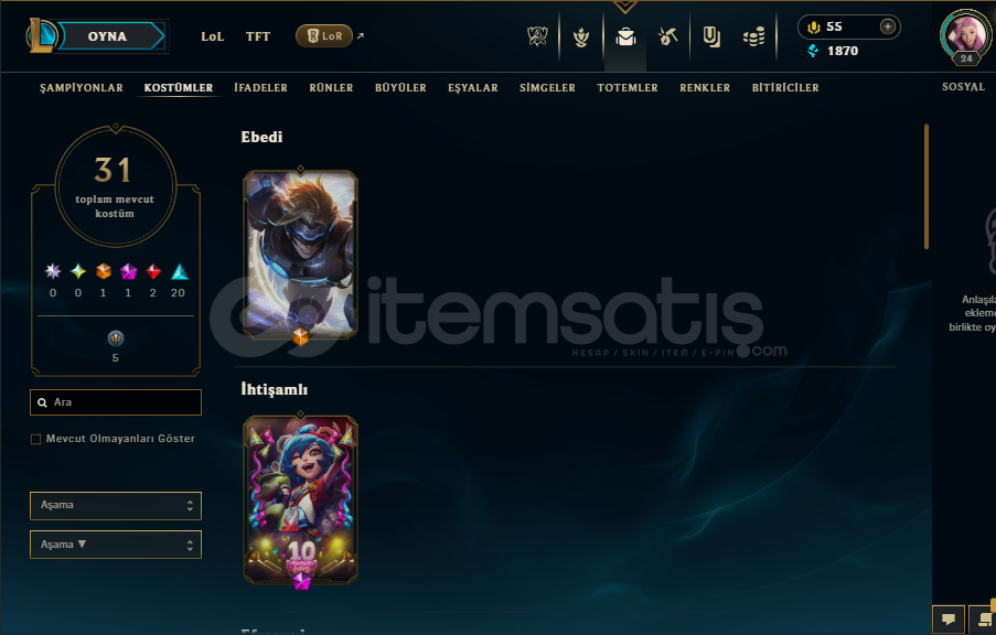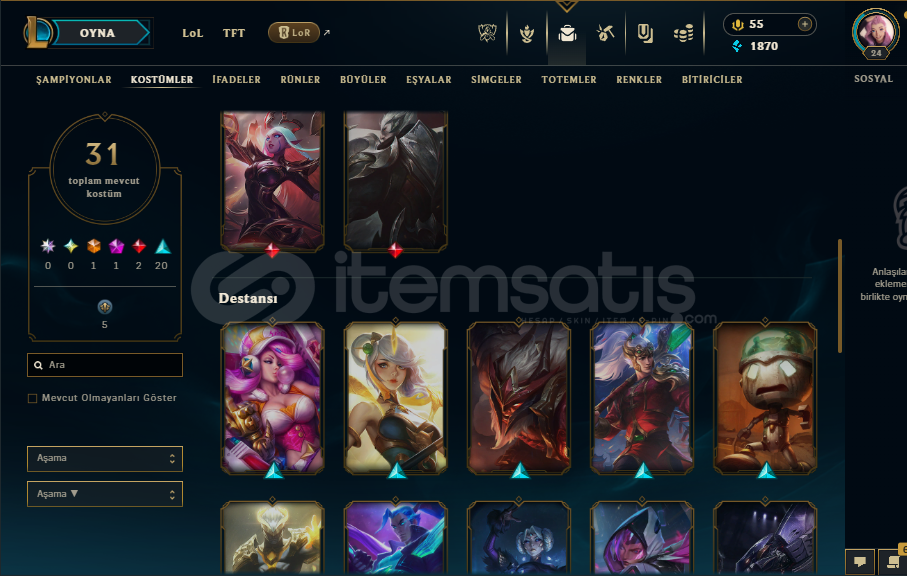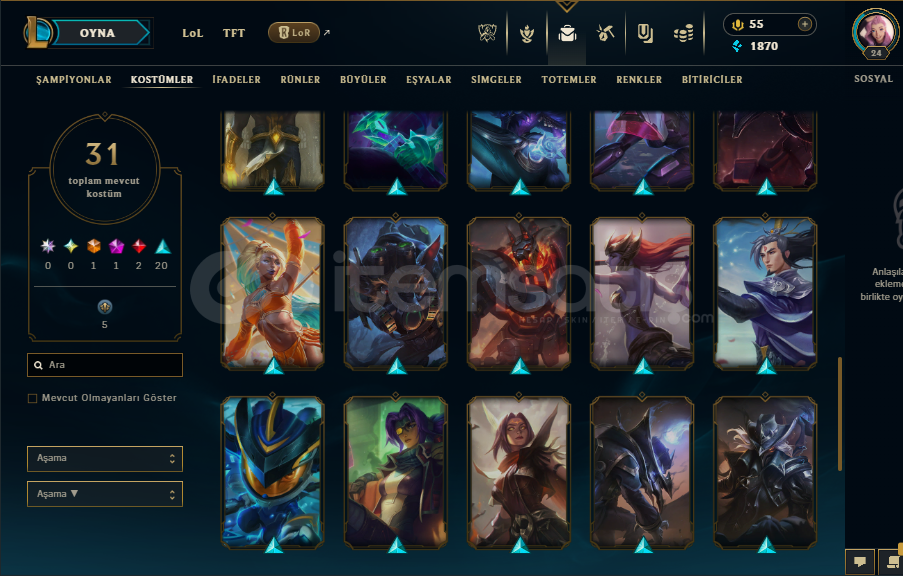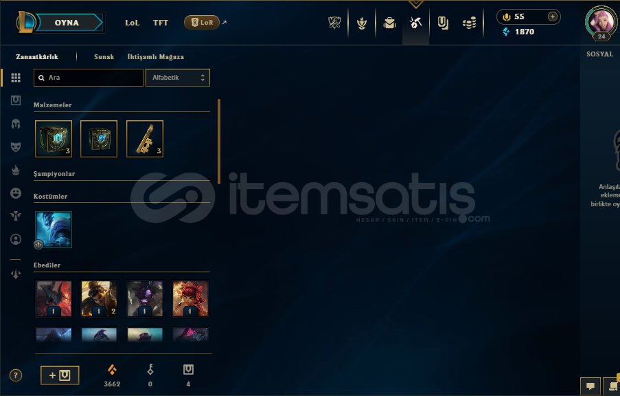 LOL HESABIGanimet doludur Turuncu öz 3662 ve bir çok karakterin turuncu öze dönüştürülen eşyası bulunmaktadır.3 sandık 1 anahtar vardır31 skin vardırPulsefire ezrealYüce Kral DariusGecenin Asası SorakaJeton Düşmanı YasuoVahşi Batılı İrelia, VictorBir çok kostüm bulunmaktadır sorularınız olursa sorabilirsiniz.Mail istediğiniz mail adresine devredilir...