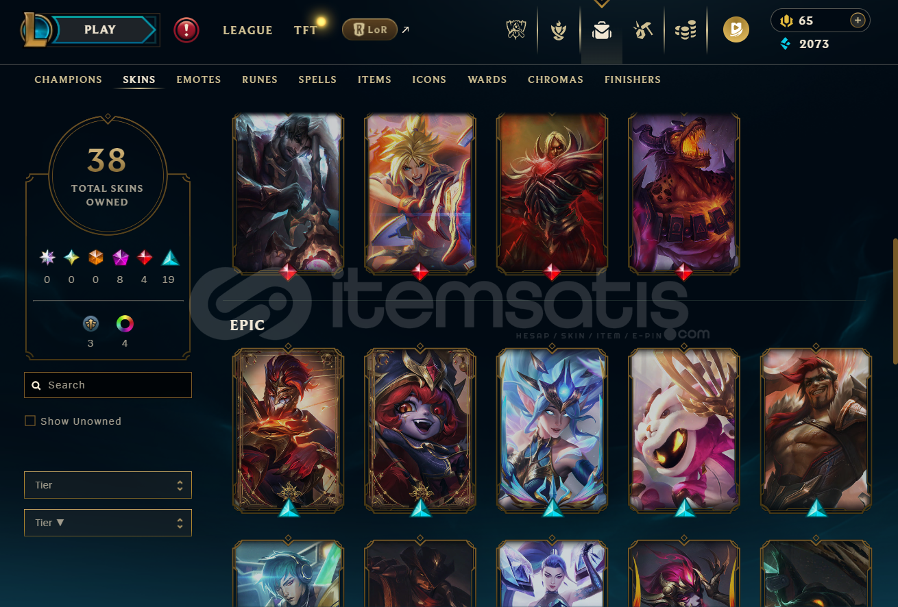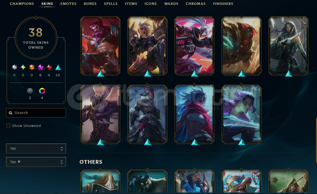 Hesapta bulunan prestij skinler bunlardır. Jarvan, Zed, Lux ve Vayne skinlerinin özel rengi bulunmaktadır. Hesapta çok nadiren sunaktan çıkan Başkaldırı True Damage Ekko mevcuttur.