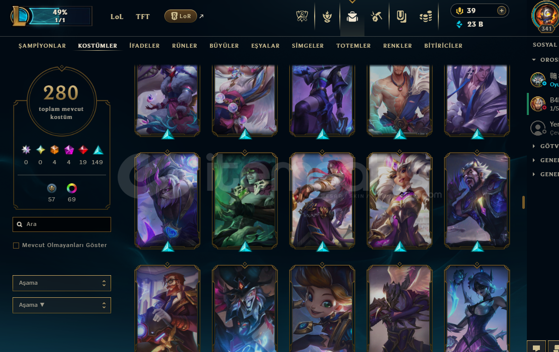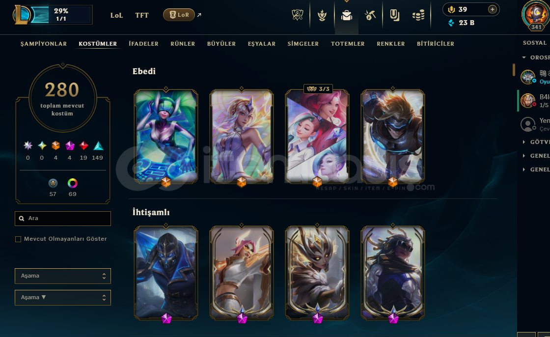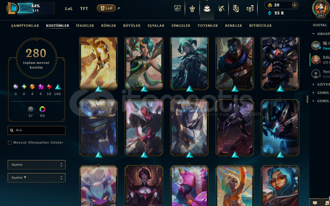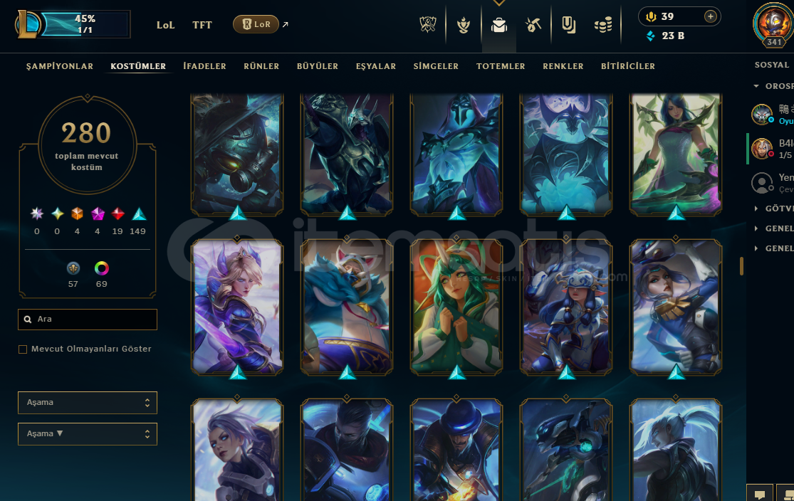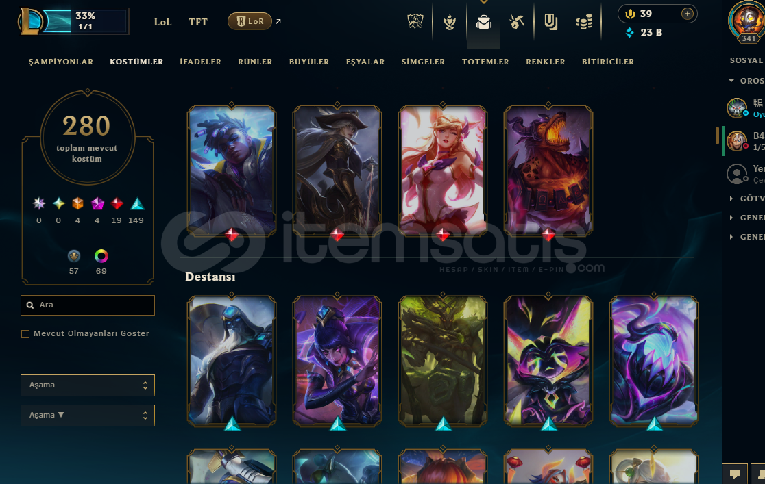 280 skin mevcut(4 ebedi, 4 ihtişamlı, 19 efsanevi, 140 destansı)
