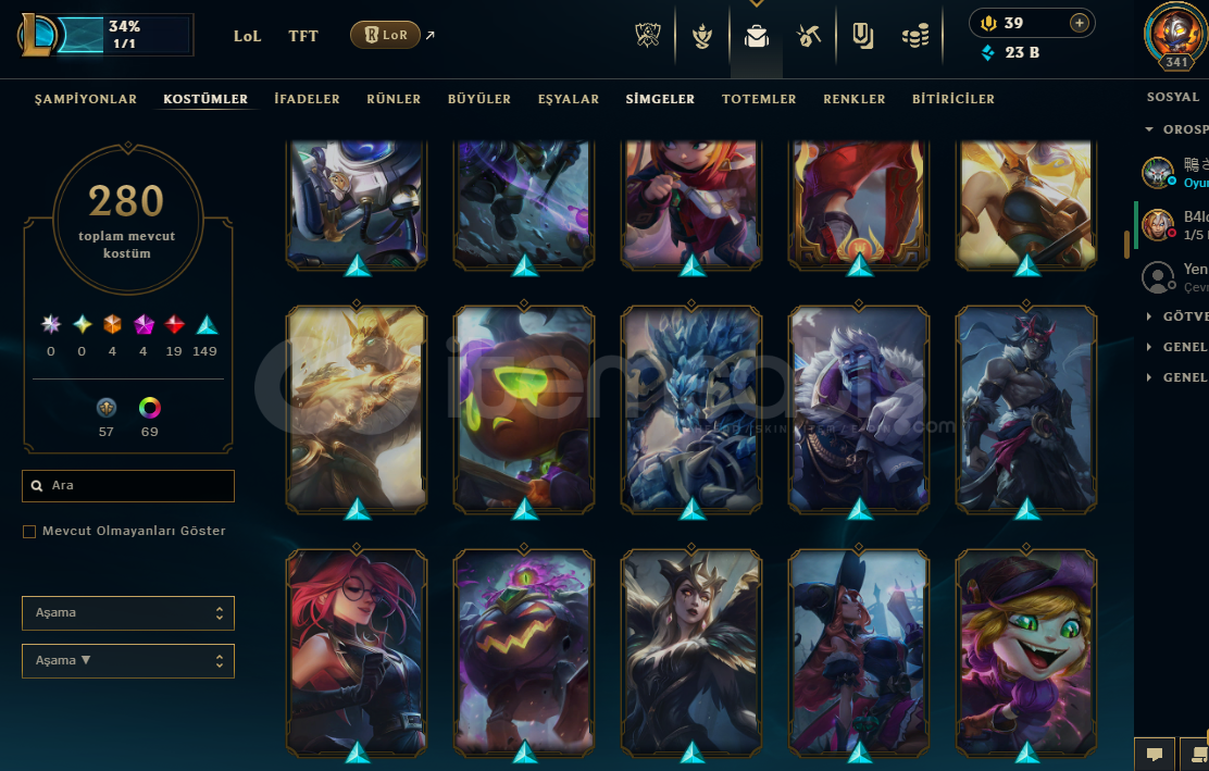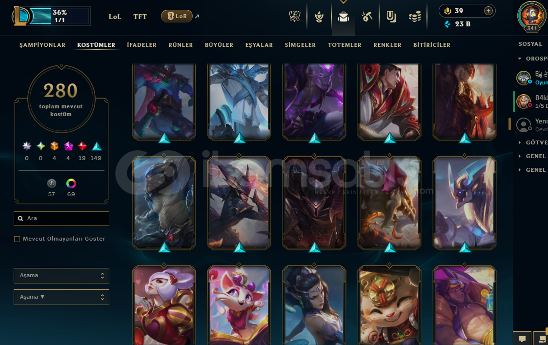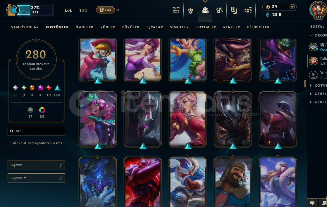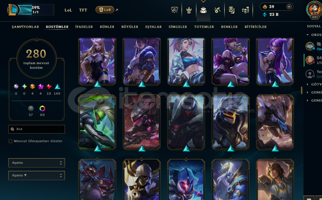 280 skin mevcut(4 ebedi, 4 ihtişamlı, 19 efsanevi, 140 destansı)