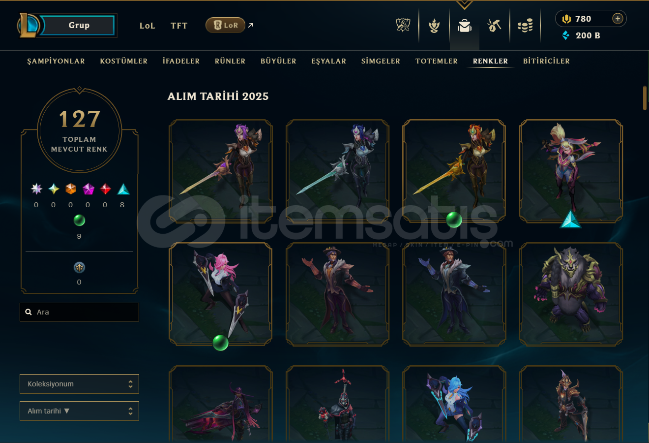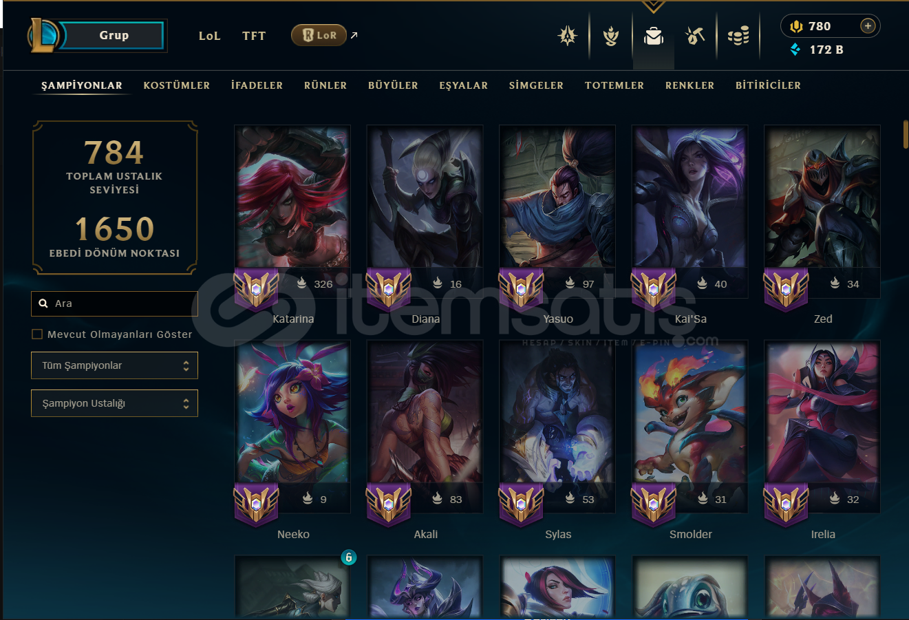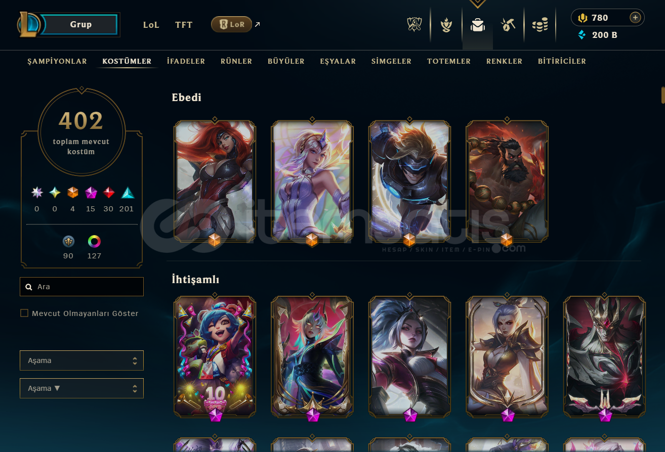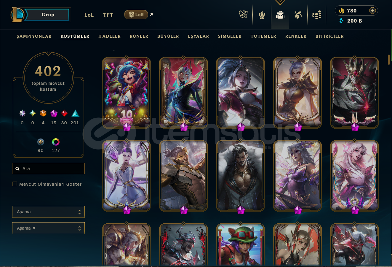 795 LEVEL TÜM CHAMPLAR ACIK (800K KATA VS)+ 402 KOSTÜM + 780 RP + 200K ÖZ VAR.