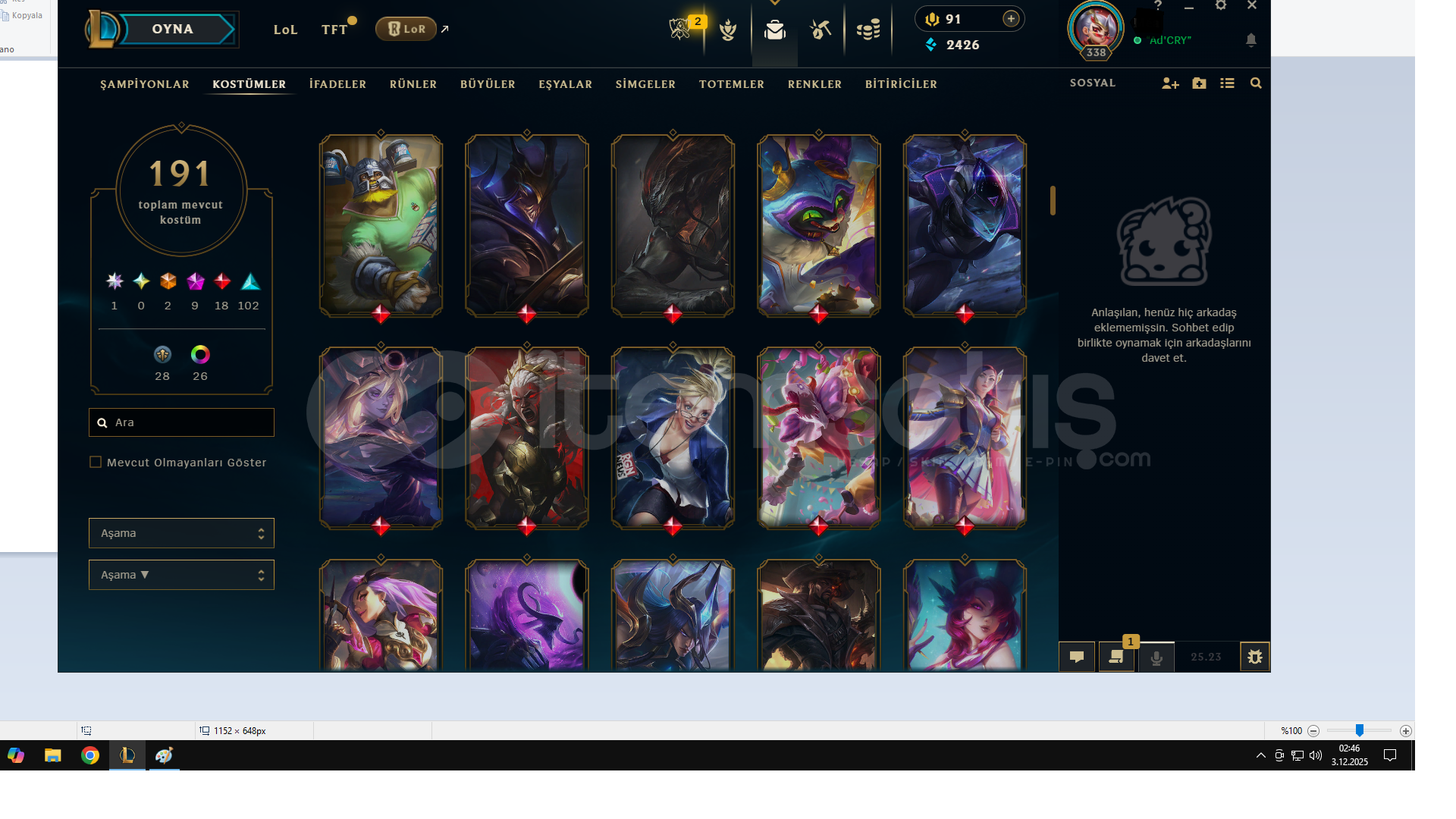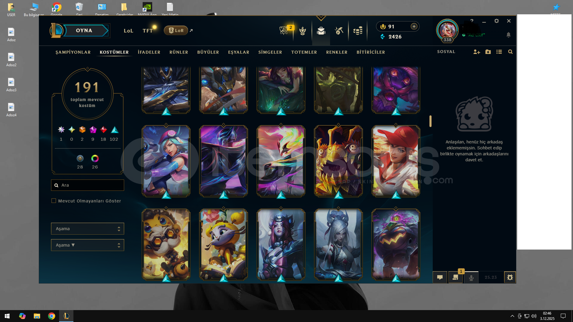 Öncelikle merhabalar bir süre önce satın aldığım hesabımı satmak istiyorum fazla vakit bulamıyorum ve hevesimi aldım istediğim kostümlerden kendi hesabımda mevcut olduğu için satma gereksinimi duyuyorum 191 Kostüm ve gerçekten boş kostümler yok ilk mailide mevcut değil bilgisini buradanda vereyim alacak kişiye hayırlı olsun
