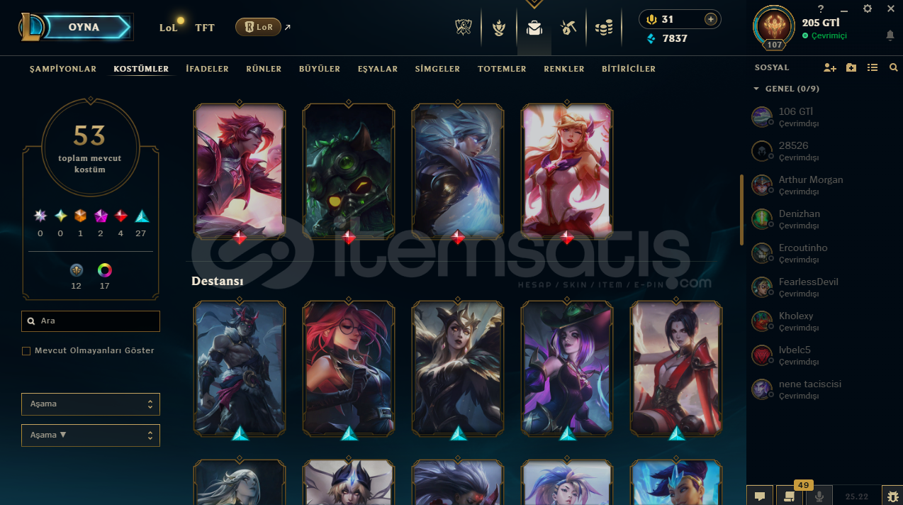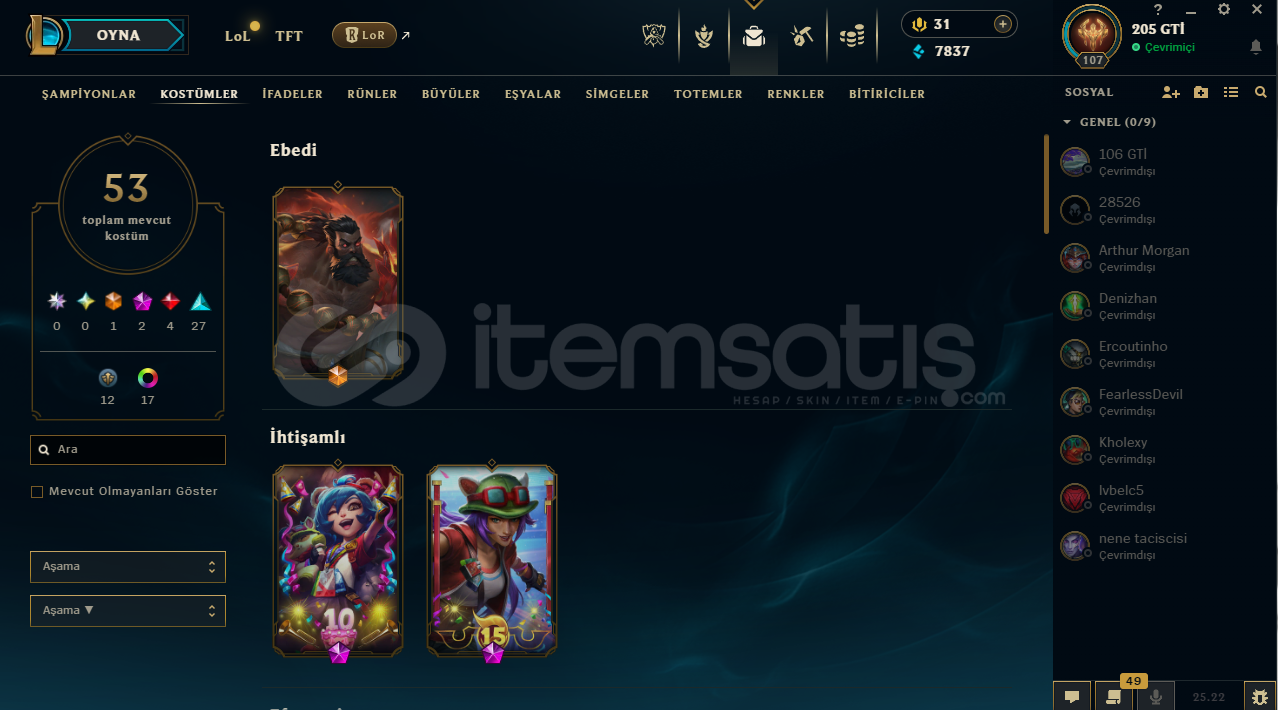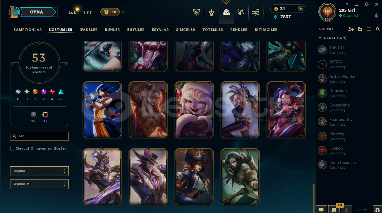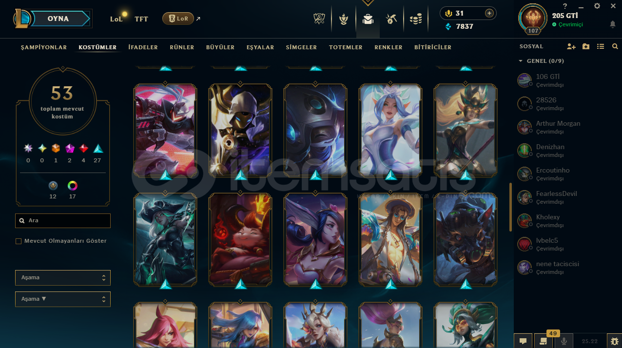 LoL Hesabı SatılıkToplam 53 kostümRuh Bekçisi Udyr mevcutKostümlerin çoğu değerli ve nadirTakdir seviyesi 218 adet renk görünümü mevcutAlıcısına hayırlı olsun.
