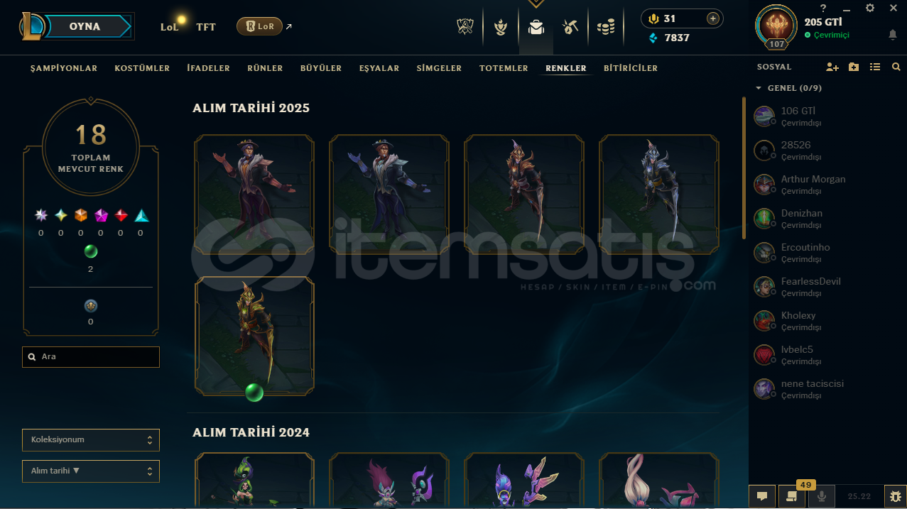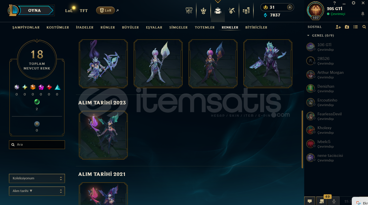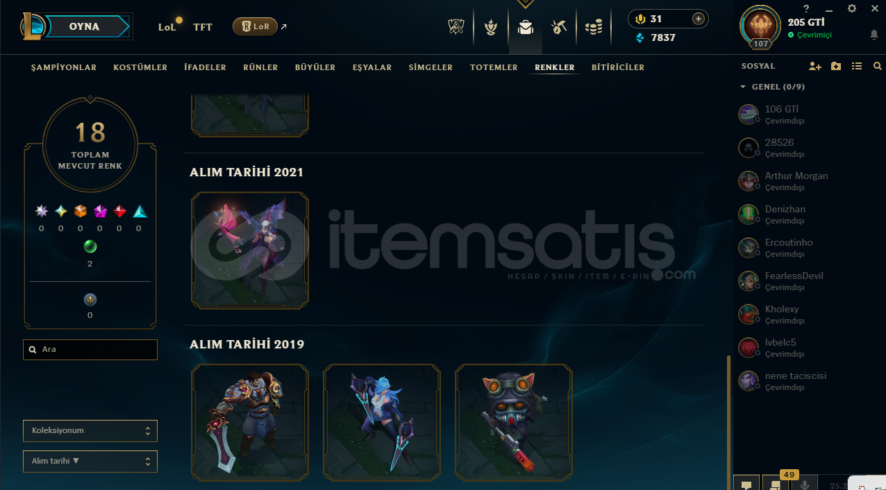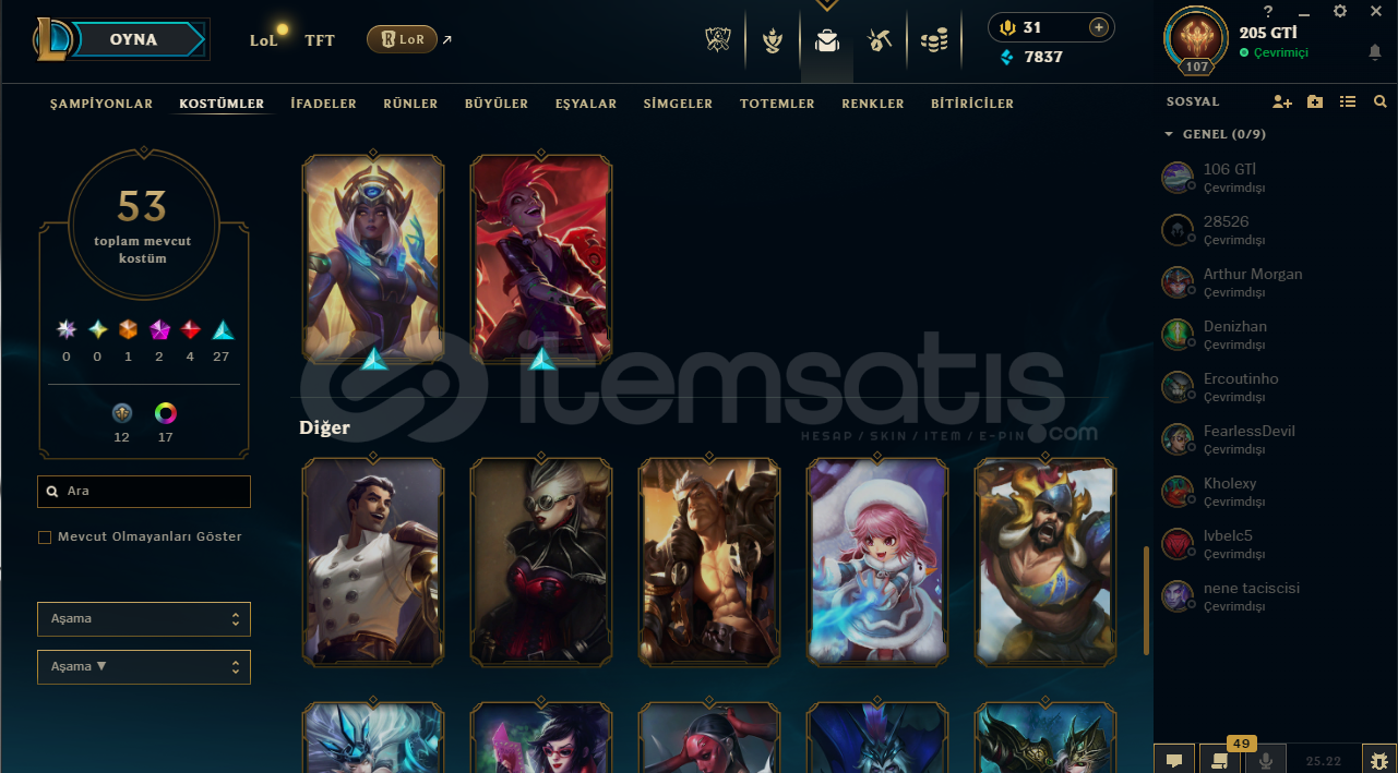 LoL Hesabı SatılıkToplam 53 kostümRuh Bekçisi Udyr mevcutKostümlerin çoğu değerli ve nadirTakdir seviyesi 218 adet renk görünümü mevcutAlıcısına hayırlı olsun.