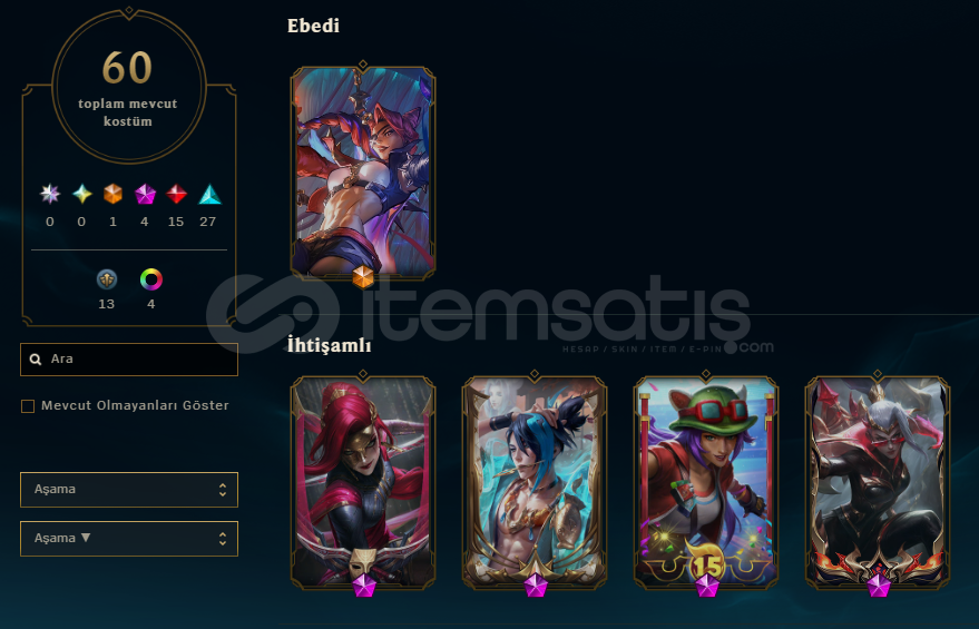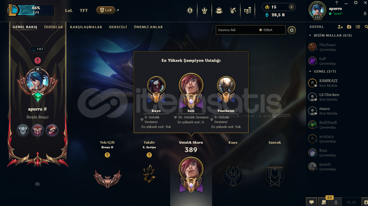 League of Legends Hesabı-------------------------147 Seviye60 Kostüm1 Ebedi Köstüm4 İhtişamlı Kostüm15 Efsanevi Kostüm25 Destansı Kostüm15 Hatıra KostümValorant Hesabı---------------100+ SeviyeGaia VandalPeak Yüce 2 Yüksek MMRGüzel Fiyat Performans Hesaptırİki oyunu da oynayanlara uygun.NOT : Fiyatta emin değilim yazarsanız beraber bi fiyata gelebiliriz.