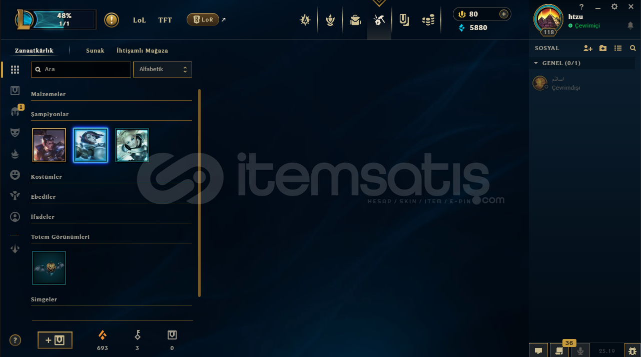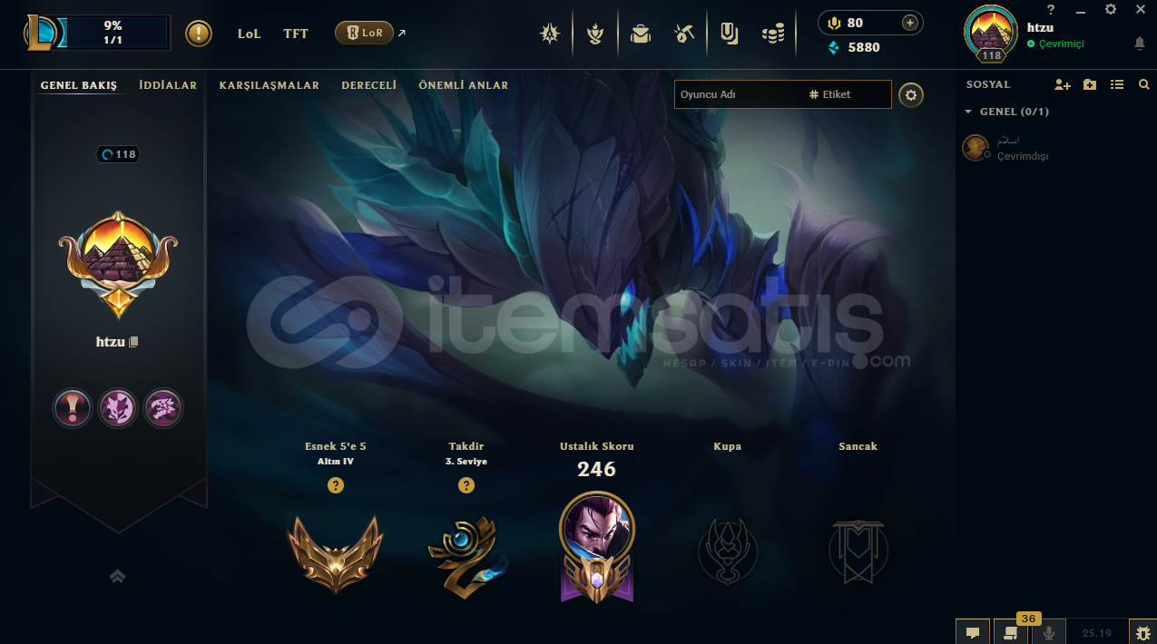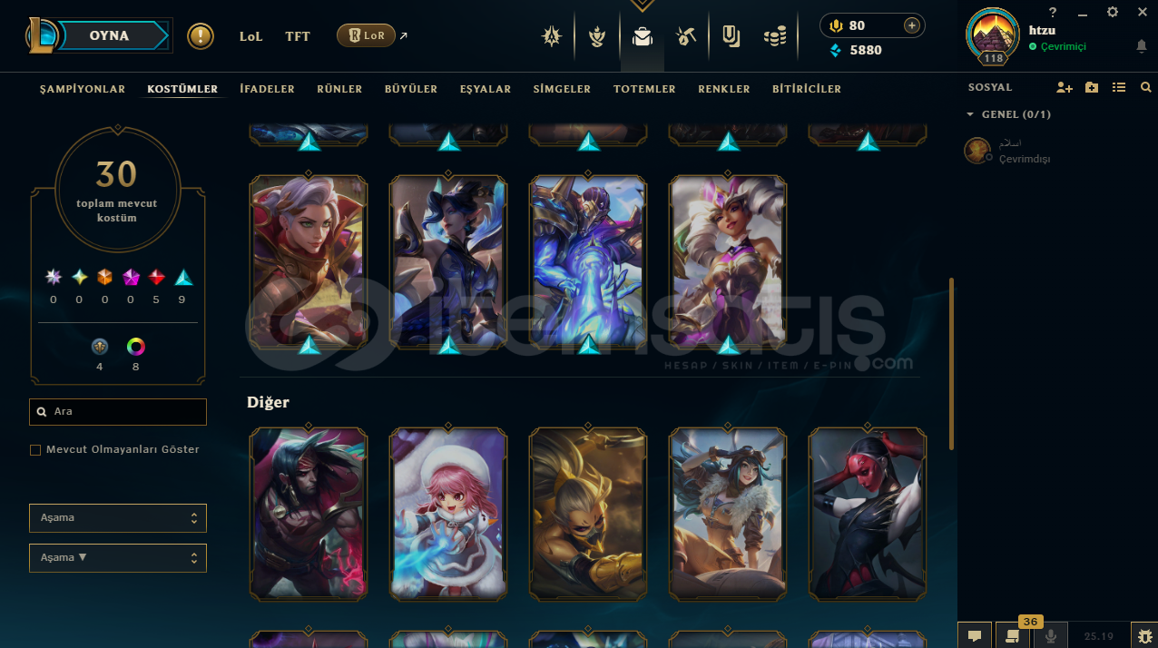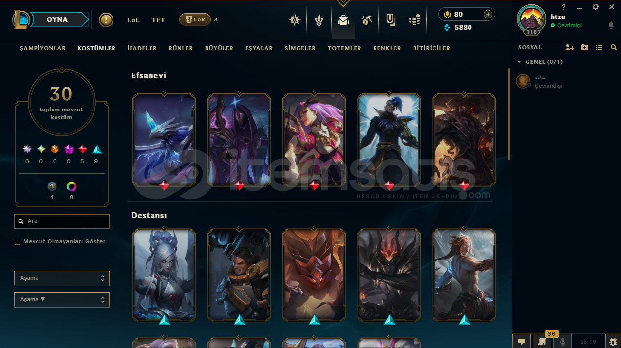 Efsane lol hesabı 118 lvl altın 30 kostümlü