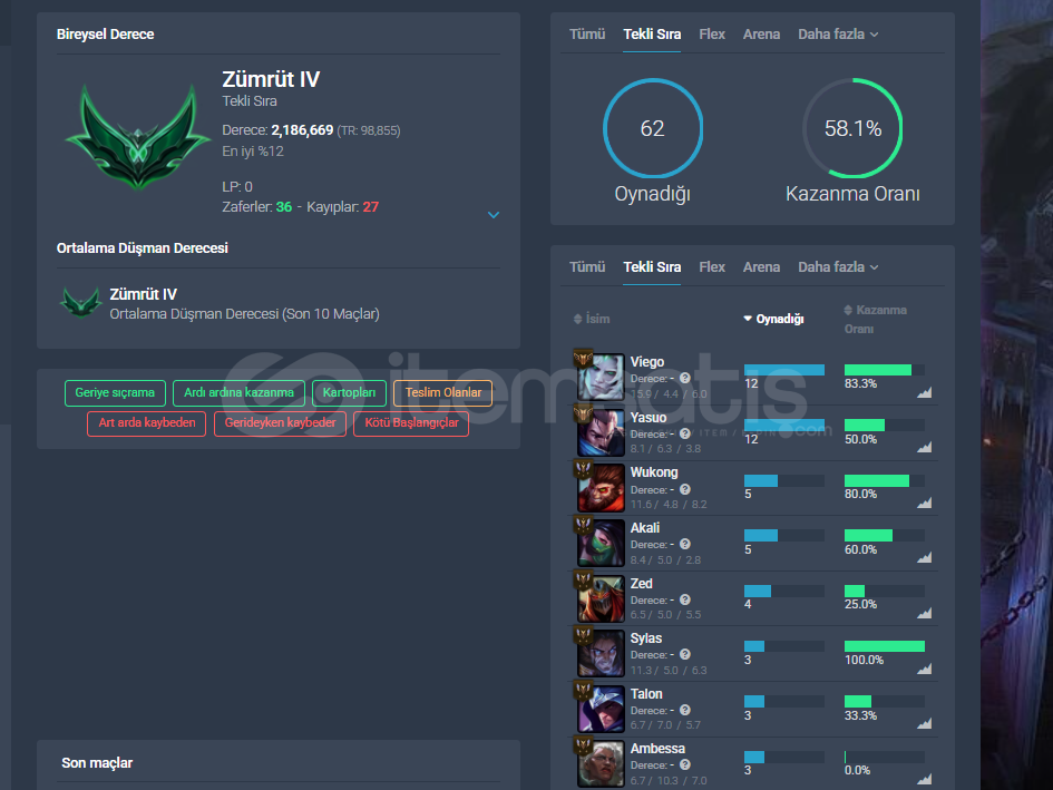arkadaşla ilk işlemimiz 12 oyunda sadece 1 kere lose aldı aşırı yüksek kda larla hızlı bir şekilde oyunu bitirmeye yönelik oynuyor gönül rahatlığıyla işlem alabilirsiniz