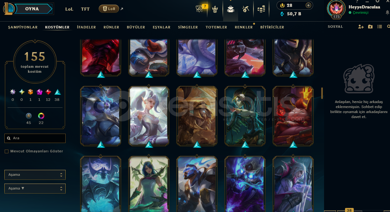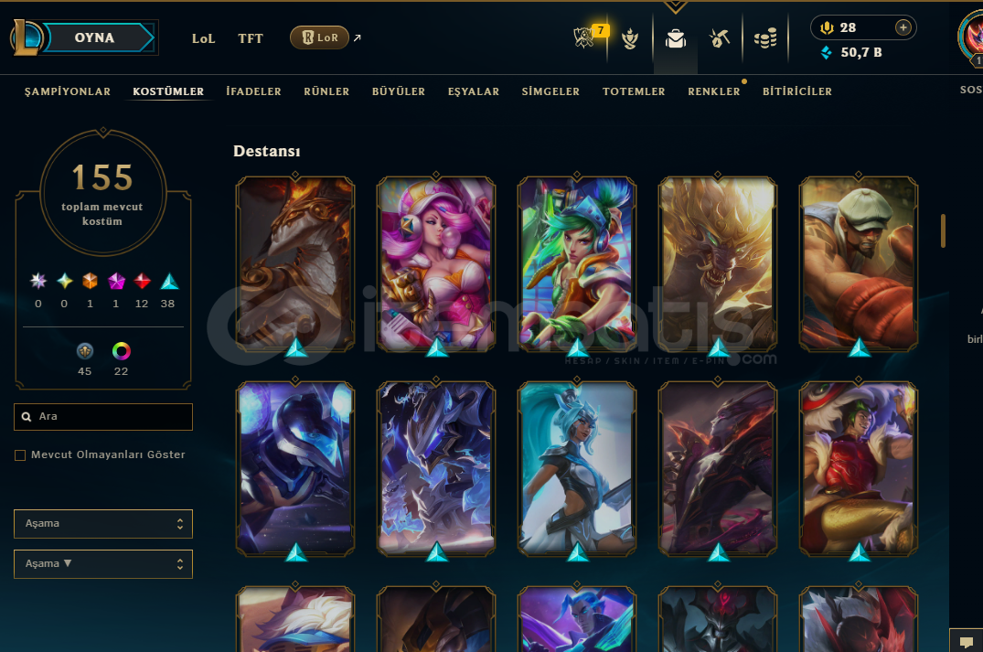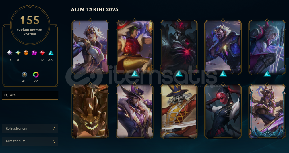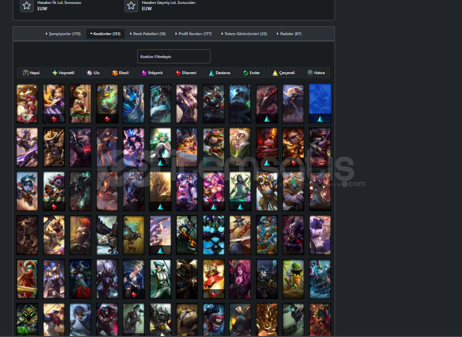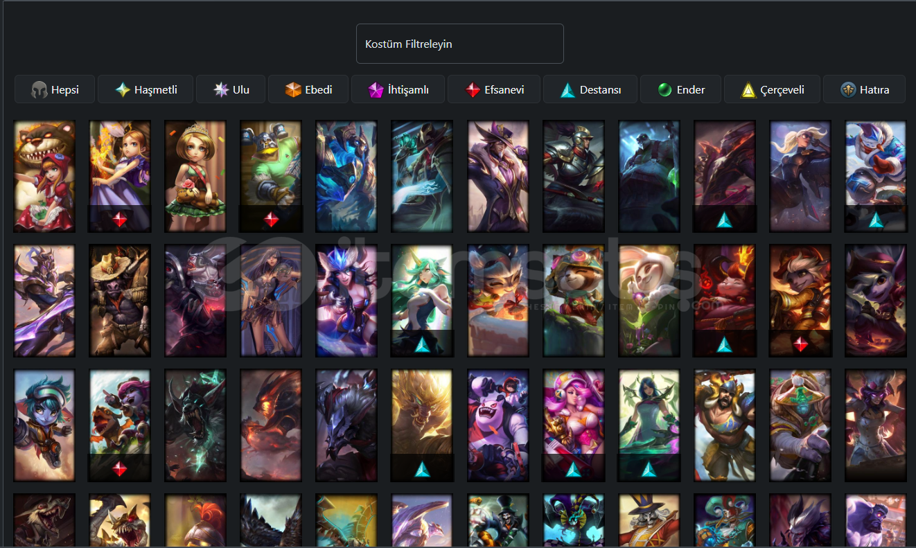 Tüm herolarda kostümler vardır görseller ektedir çok sayıda yükksek lp'li ihtişamlı köstüm vardır 154 'e yakın kostümMorde - Syndra- Zac- Gibi kostümler pahallı kostümler vardır çok sayıda sayısız. Anında teslim edeceğim ilk mailimi hatırlamıyorum direk olarak güncel mailimden vereceğimGüncel olarak 5 tane kostüm fiyatına çar komple...