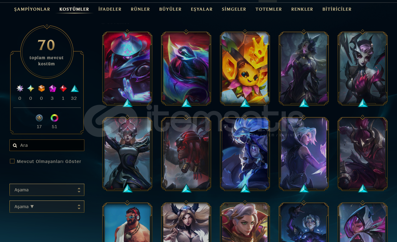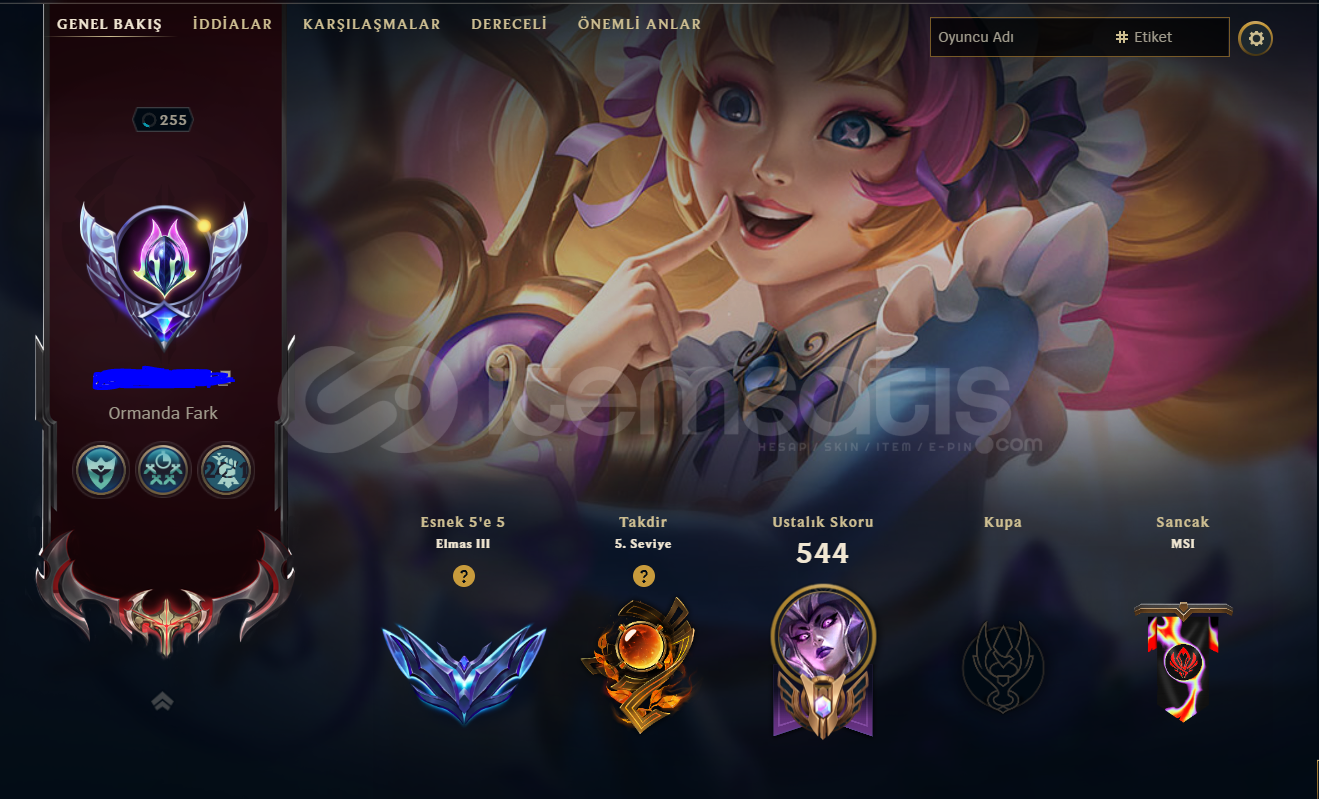 250 seviye dia hesapfull şampiyon 36k mavi öz 70 kostüm 55 renk paketi dia3 çar bu sezon dia 1 gördü tek çifti platin2 oynar çıkarırsınız mmr ı iyikostümler görseldeki gibikostümlere renk paketi de alabilirsiniz mavi öz mağazası için biriktirmiştim 36k yı.soru için dm den ulaşablirsinizminik de olsa pazarlık payı vardır fiyatı zaten iyi oyunu b...