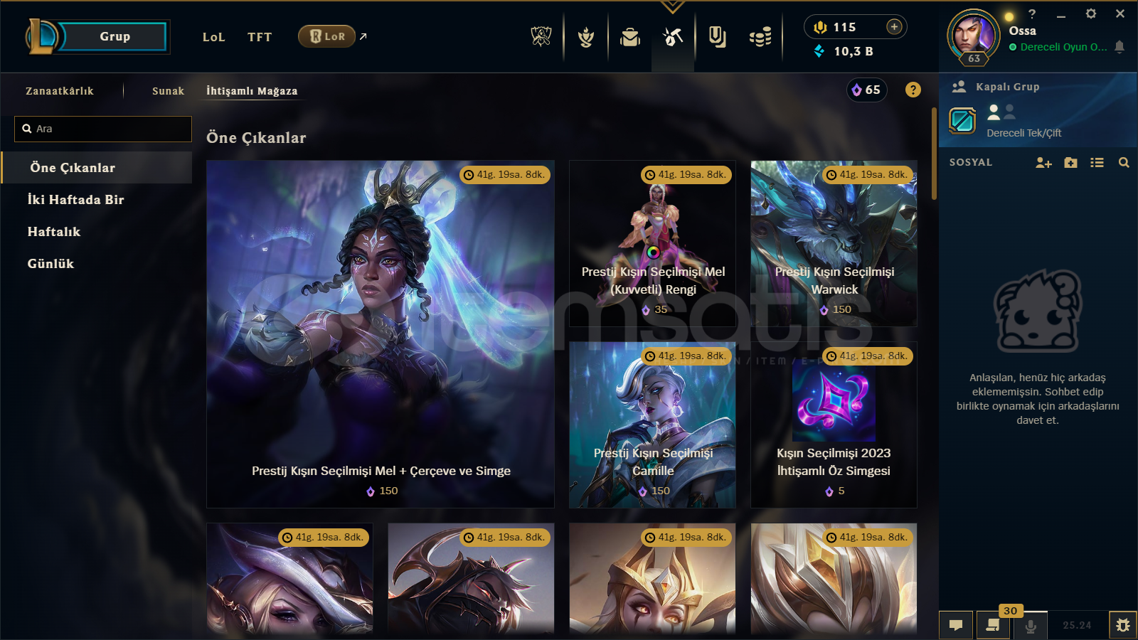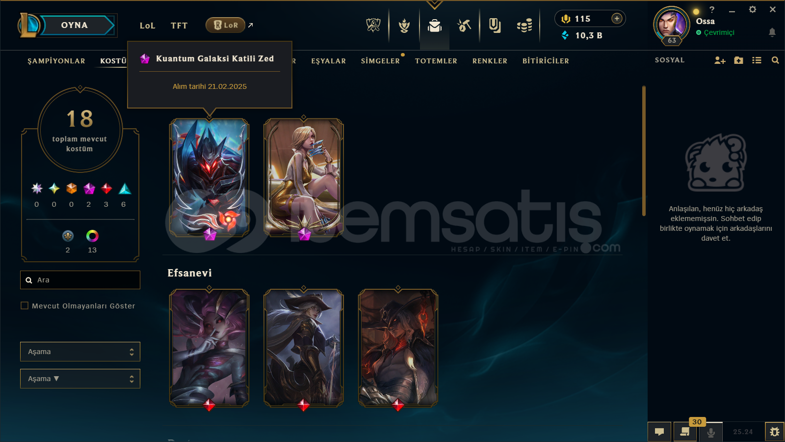 merhaba hesap gm mmr fotografda oldugu gıbı mmrı güzel hesapta 5 bin tllik quantum galaksi katili zed vardır 65 mistik özü bulunmakta hesap güzel hesaptır yüksek eloluk öncelıkle sadece diamond kostumsuz hesaplara 1k ya yakın istiyorlar bu fiyata hem quantum galaksı katılı zedle beraber + gm dan erime hesap + 5 k ya yakın quantum galaksi katili zed 400 k ya yakın evelyn mevcut mail degişimi olucakt...