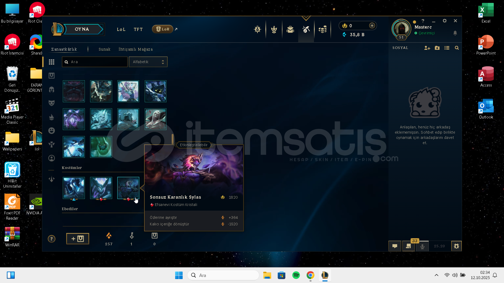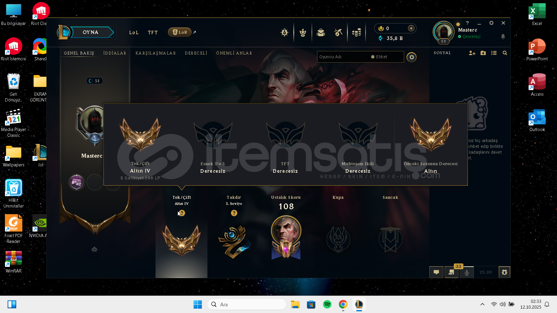 hesap yüksek mmr 3 tane kırmızı kostum var sonsuz karanlık sylas primordialı aatrox ve temmo diger kostumlerde güzel hesap botted hesap degildir olusturulduğu ülke TR den cıkma hesap 35k mavi öz ve ganimettede çok fazla sampiyon mevcuttur otomatık teslımattır maıl degısımı olucaktır alıcısına hayırlı olsun isim degiştirme aktif