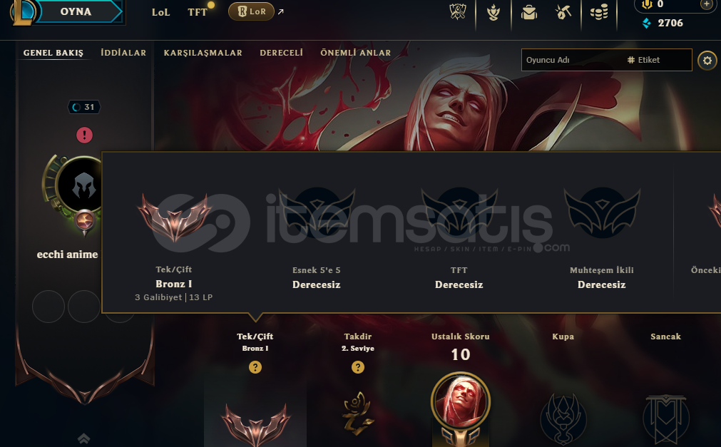 Hesapta Gölgedövmeli Volibear Skt T1 Kalista vardır.Rank Bronz 1.Hesapta 20 normal maç atma cezası vardır.Satın aldığınızda kullanıcı adı ve şifre size otomatik olarak iletilecektir.