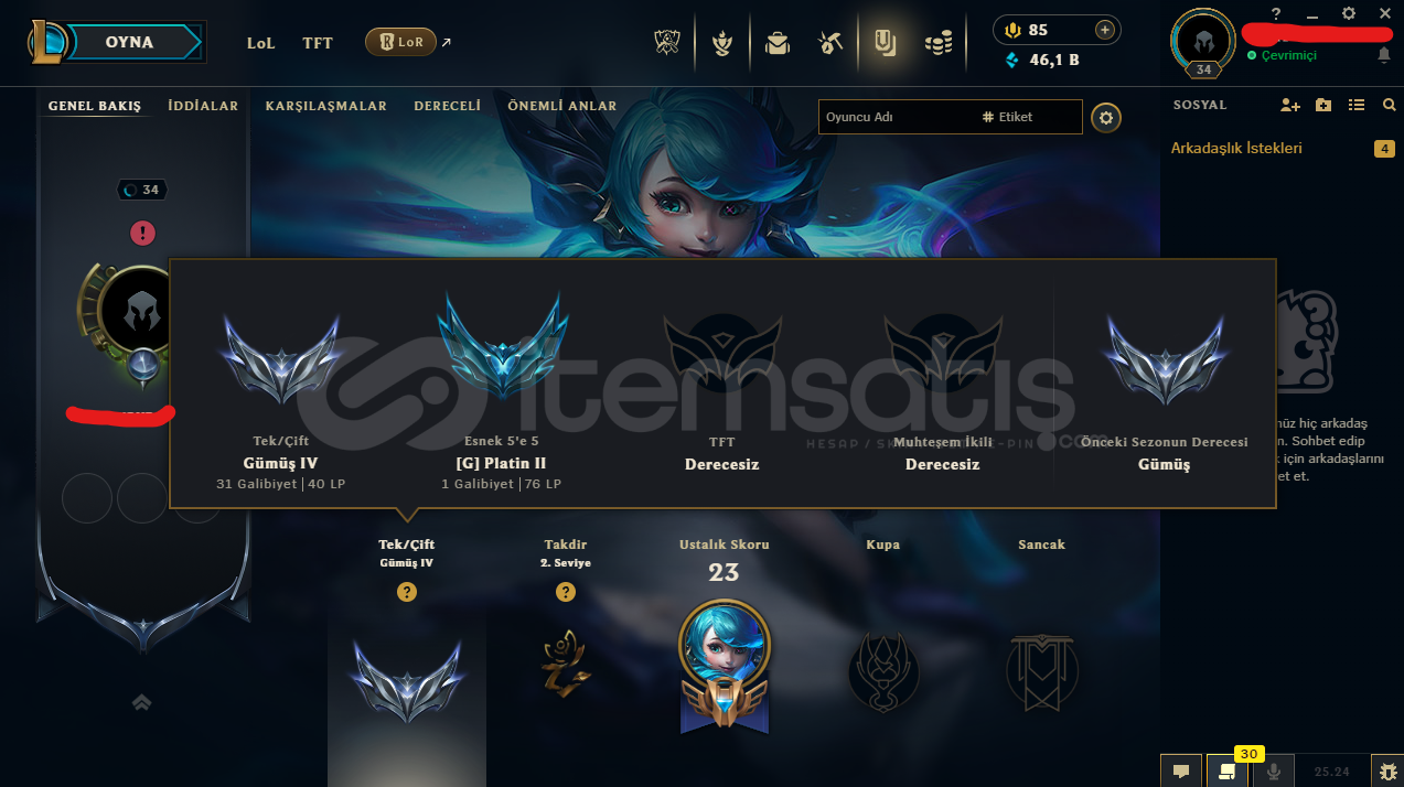 Hesap tamamen handmade'dir. İlanımdaki handmade hesaplardan birisidir. Değerlendirmeler kısmından yapılan yorumları görebilirsiniz.( https://www.itemsatis.com/league-of-legends-tr/handmade-tr-unranked-30-level-25k-mo-4612023.html )Hesap TR'dir. Smurf 34 leveldir.Gümüş 4 40Lp lp'dir. 46155 mavi öz ve 85rp vardır.Güncel olarak 31 win 3 lose ile 91.2winratei vardır.Kalıcı olarak 27 şampiyonu ve ...