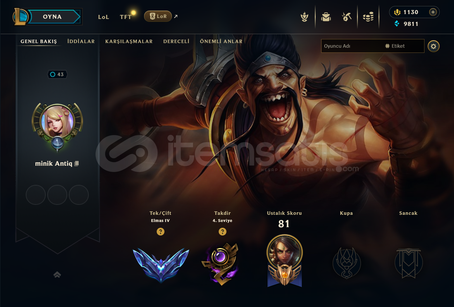 HandMade-Dia4-1130RP-%70WinRate-TR.Nidale 6.-10K.MÖ-Hesapta 40 çar ve 9 skin vardır.-Takdir seviyesi 4, iade hakkı 3tür-Hiçbir ceza almamıştır.-Mail değişimi yapılacaktır.