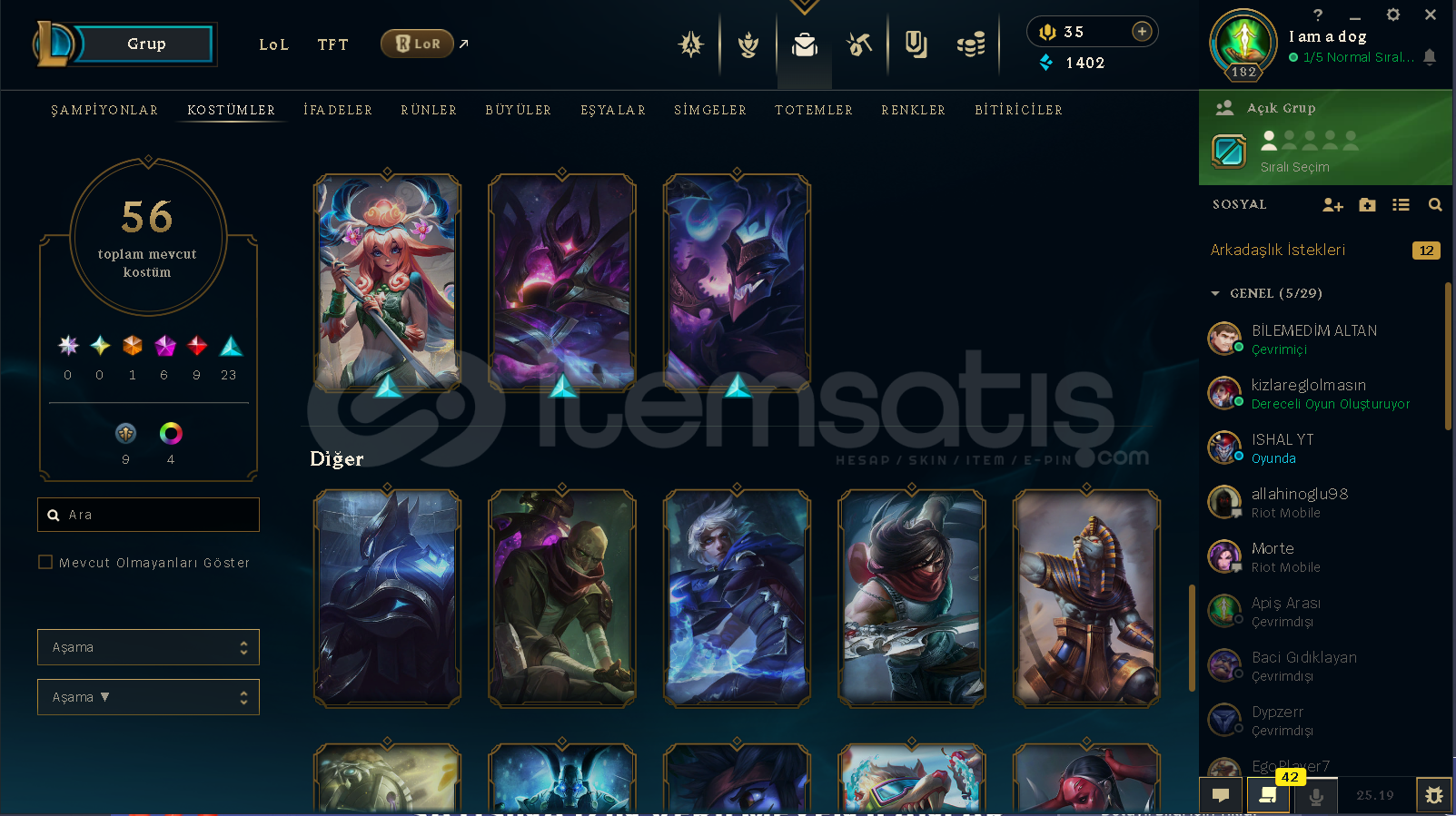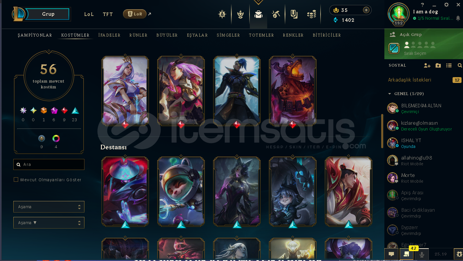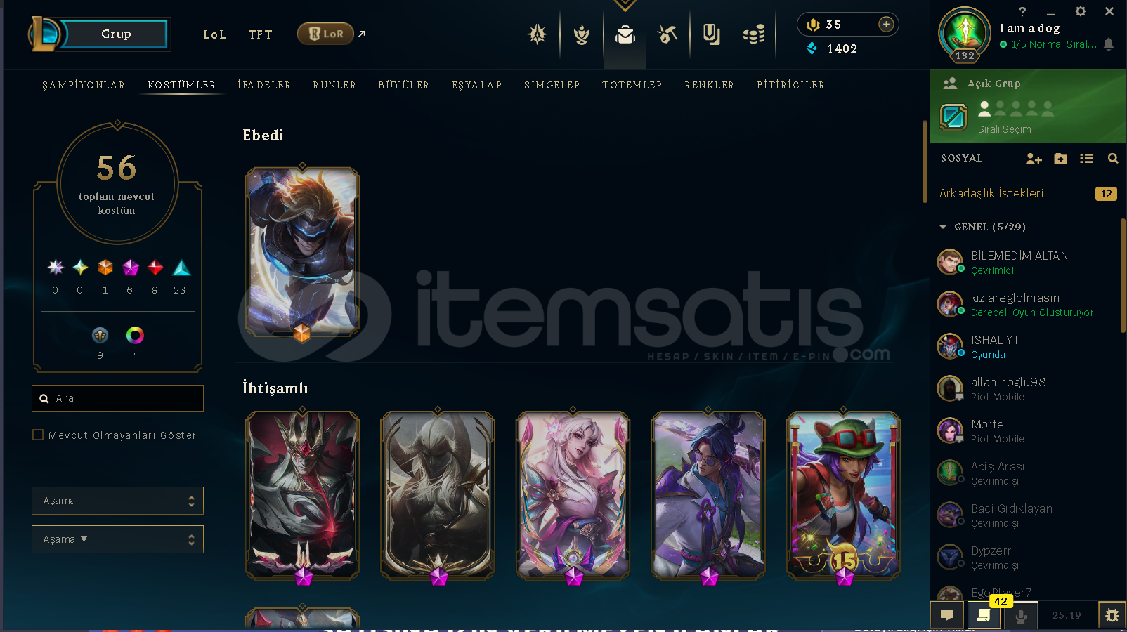 HESAP DETAYLARISKİN SAYISI : 57HERO SAYISI : 161LEVEL : 182RANK : SİLVER 2SERVER : TRDEĞERLİ KOSTÜMLER :EbediPulsefire EzrealİhtişamlıPrestij Düşmüş Kral Jarvan IVPrestij Kanlı Ay AatroxPrestij Ruh Çiçeği LuxPrestij Ruh Çiçeği Master YiSiveemoYükselen Efsane VayneEfsaneviArcane: Felaketzade JayceGalaksi Katili ZedHakikat Ejderi YasuoKozmik Karanlık LuxPotanın Kralı DariusRuh...