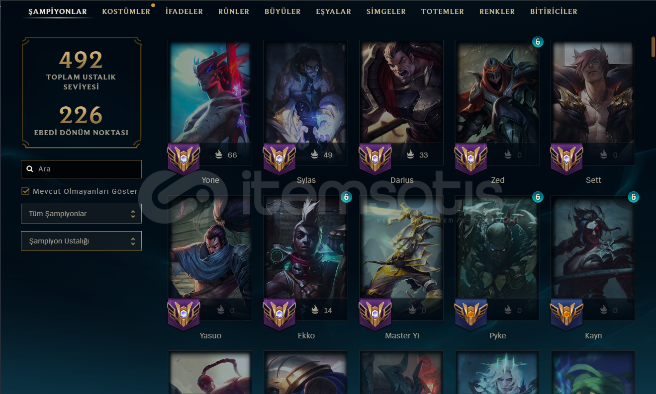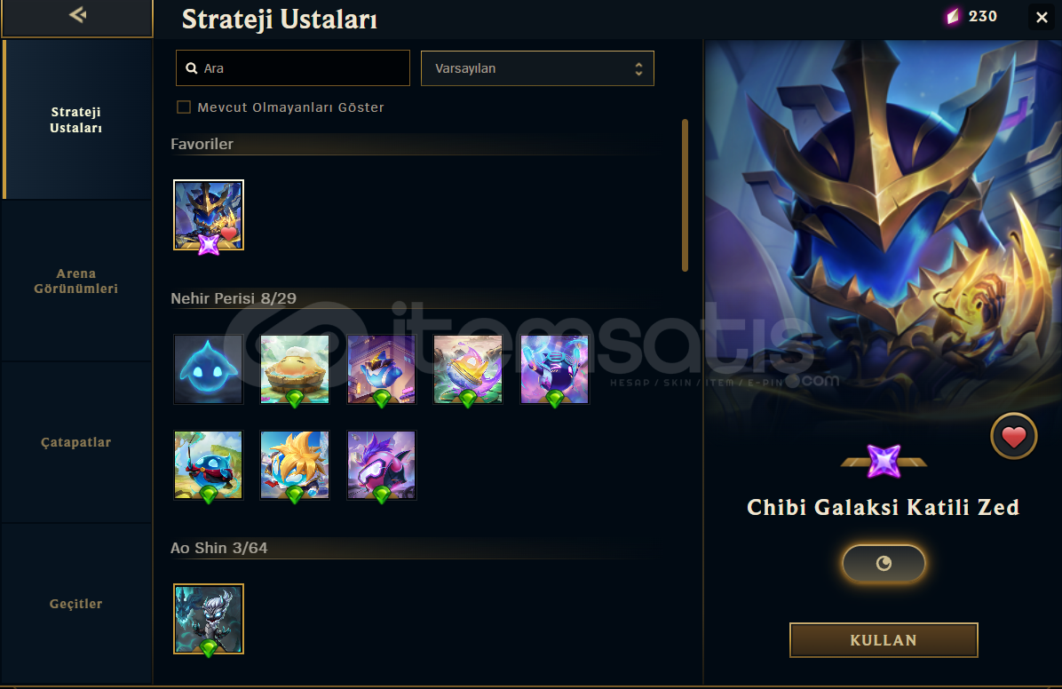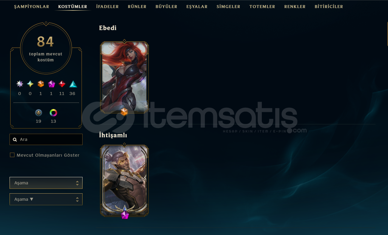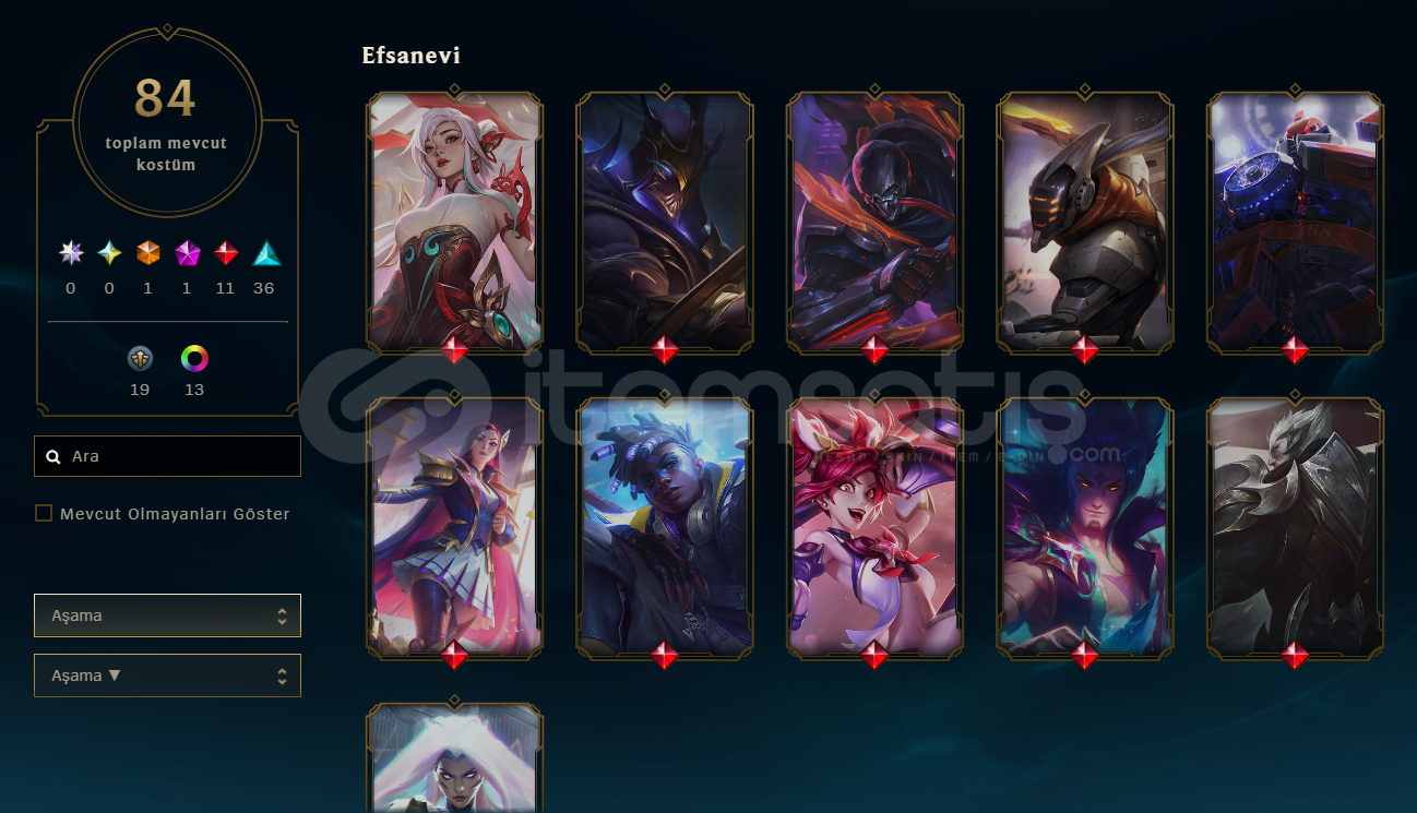 Hesabımda toplamda 84 skin vardır 1 prestij 1 ebedi 11 efsanevi skin olmak üzere altın birdir elo hellde değildir tüm çarlar açıktır tft oynayan kişilerede chibi galaksi katili zed mevcuttur