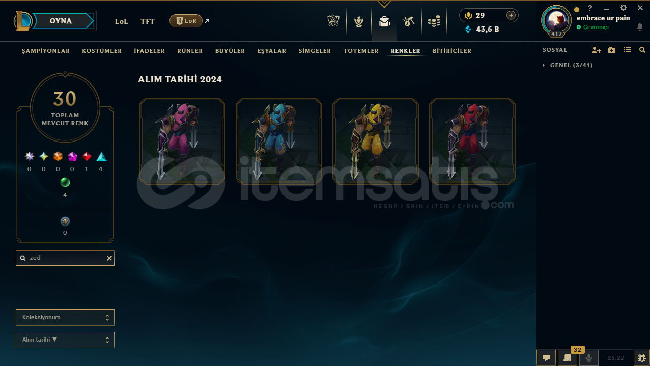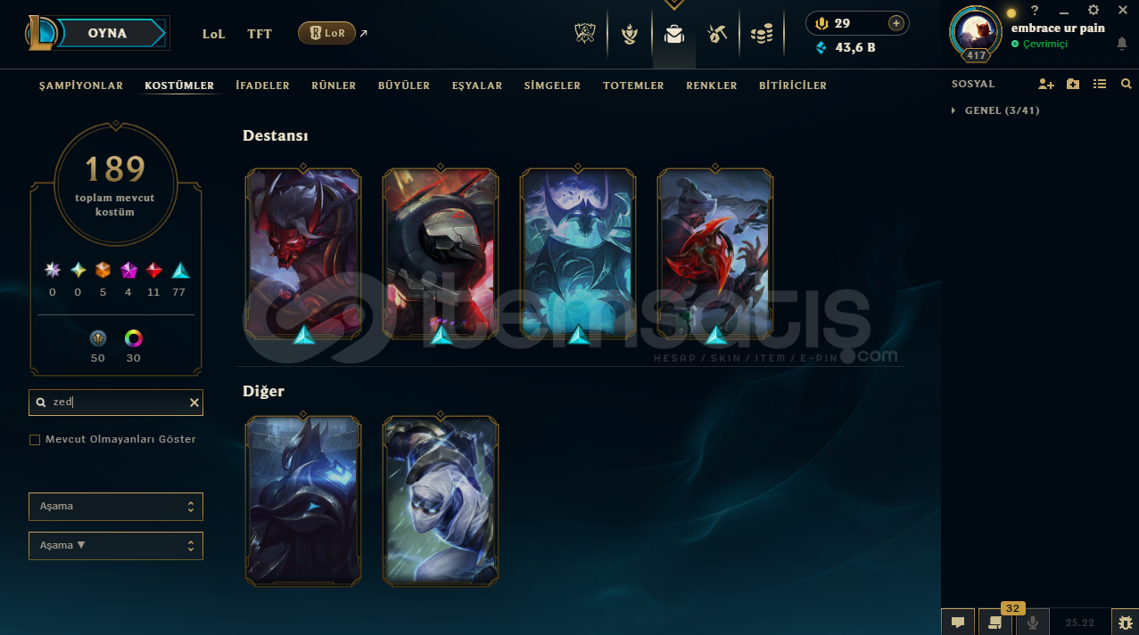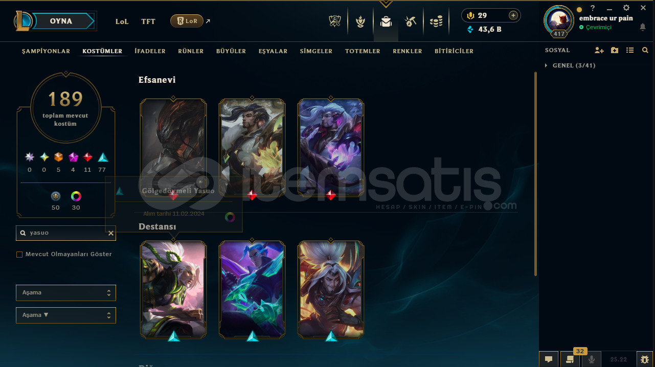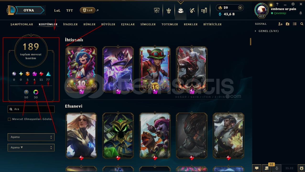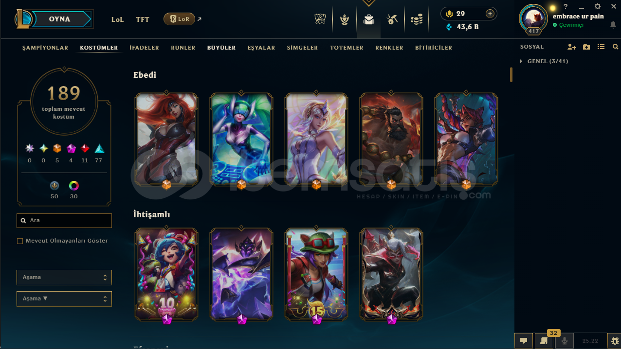 • Kostümler: 189 mevcut kostüm, farklı seviyelerde (Ebedi, İhtişamlı, Efsanevi, Destansı) ve 2024-2016 yılları arasında alınmış kostümler.