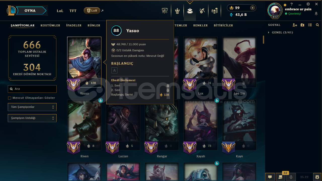 • Ustalık: 666 toplam ustalık puanı, 304 ebedi dönüş noktası ile bu hesap, oyun içi deneyiminizi güçlendirecek yüksek bir seviyeye sahip.