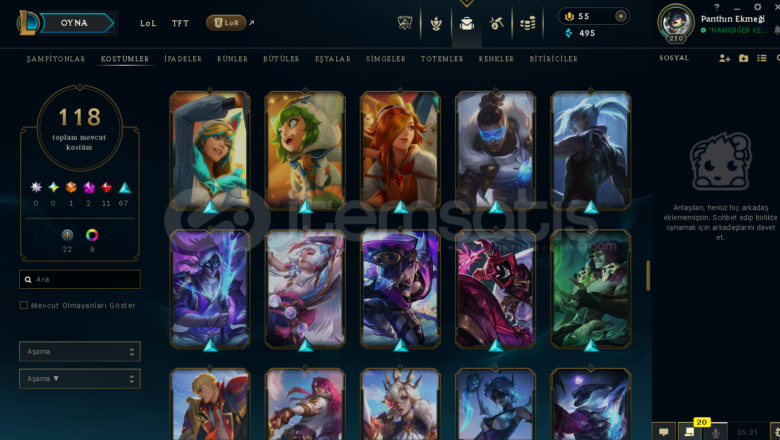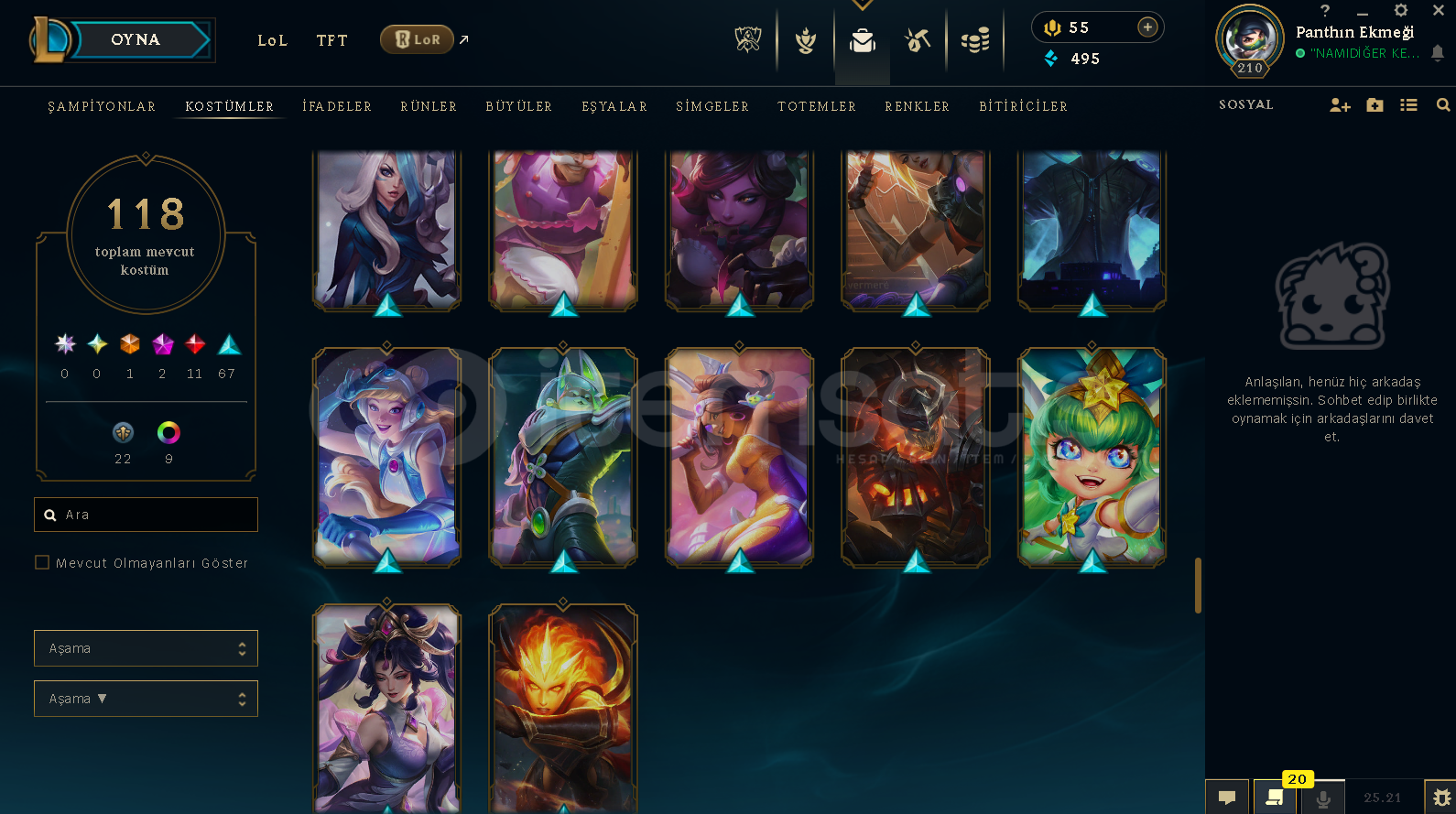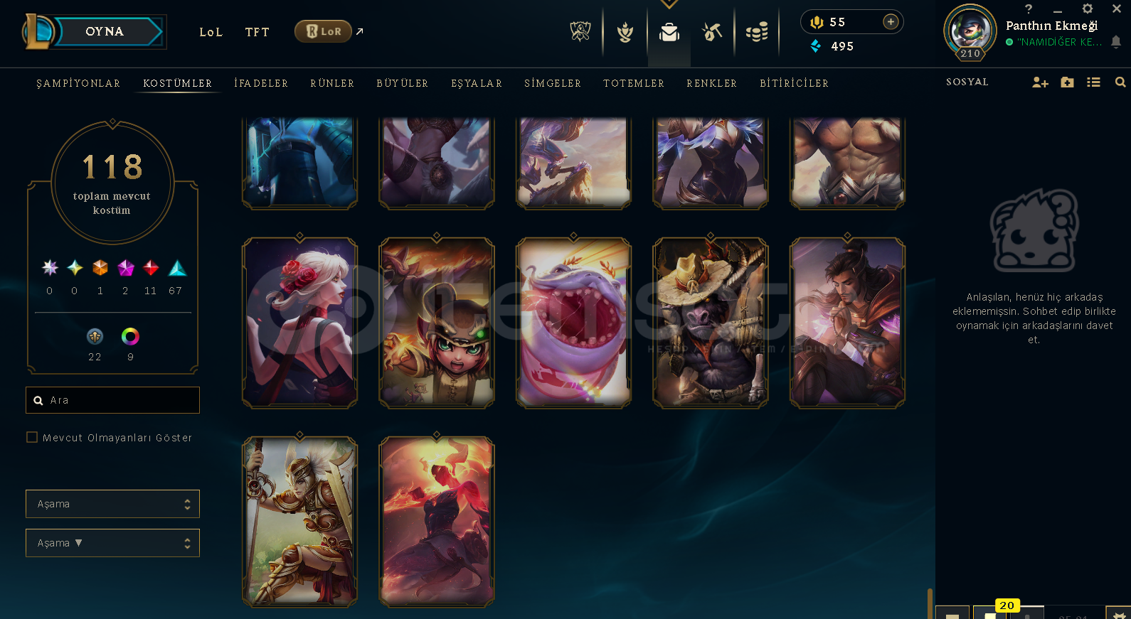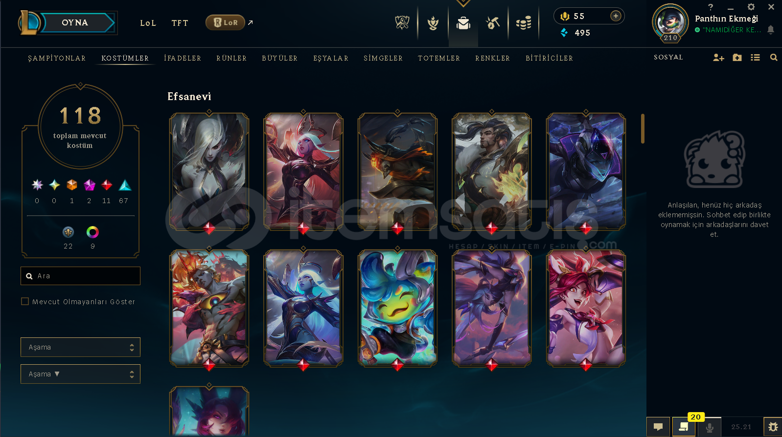 LOL 118 kostümlü hesap 25 hero hariç hepsi açık