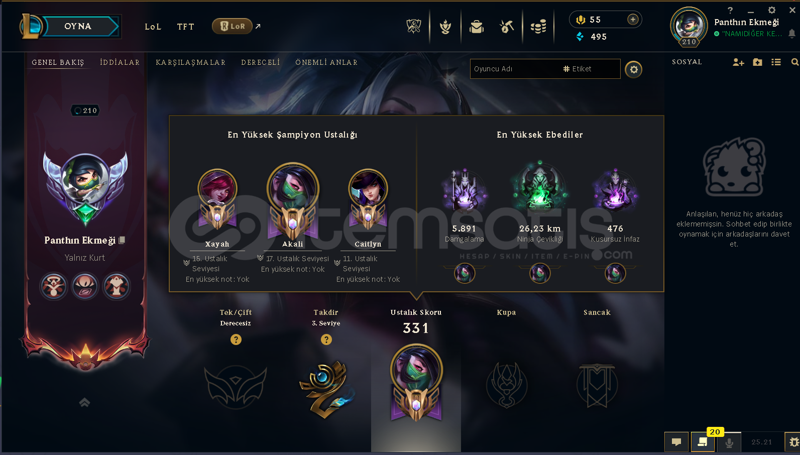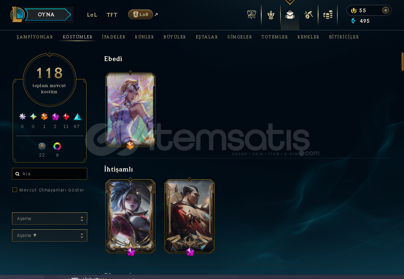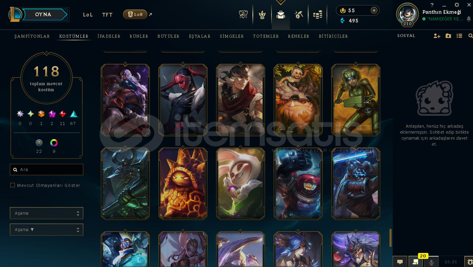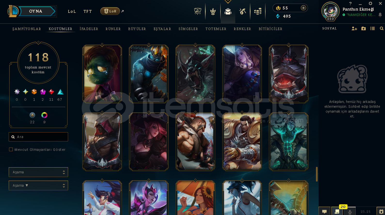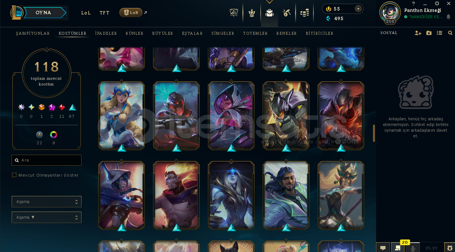 LOL 118 kostümlü hesap 25 hero hariç hepsi açık