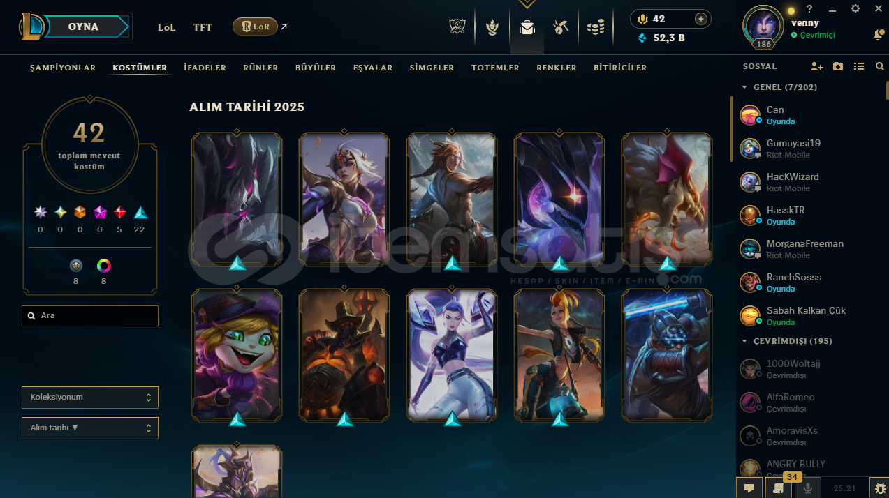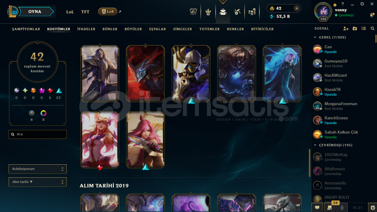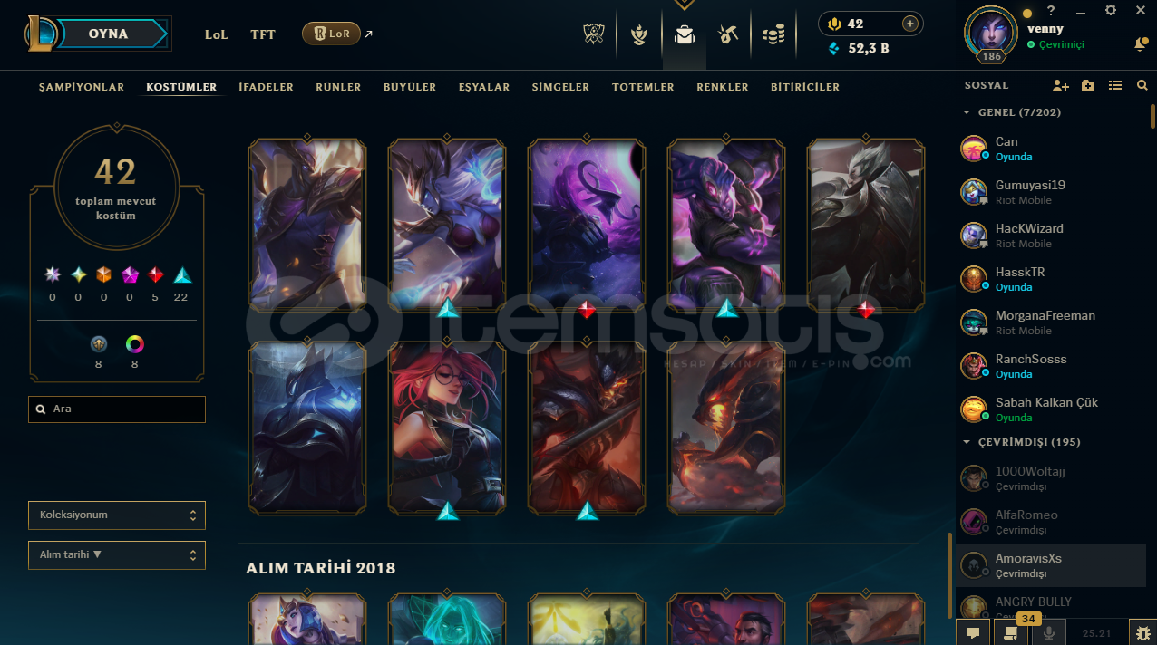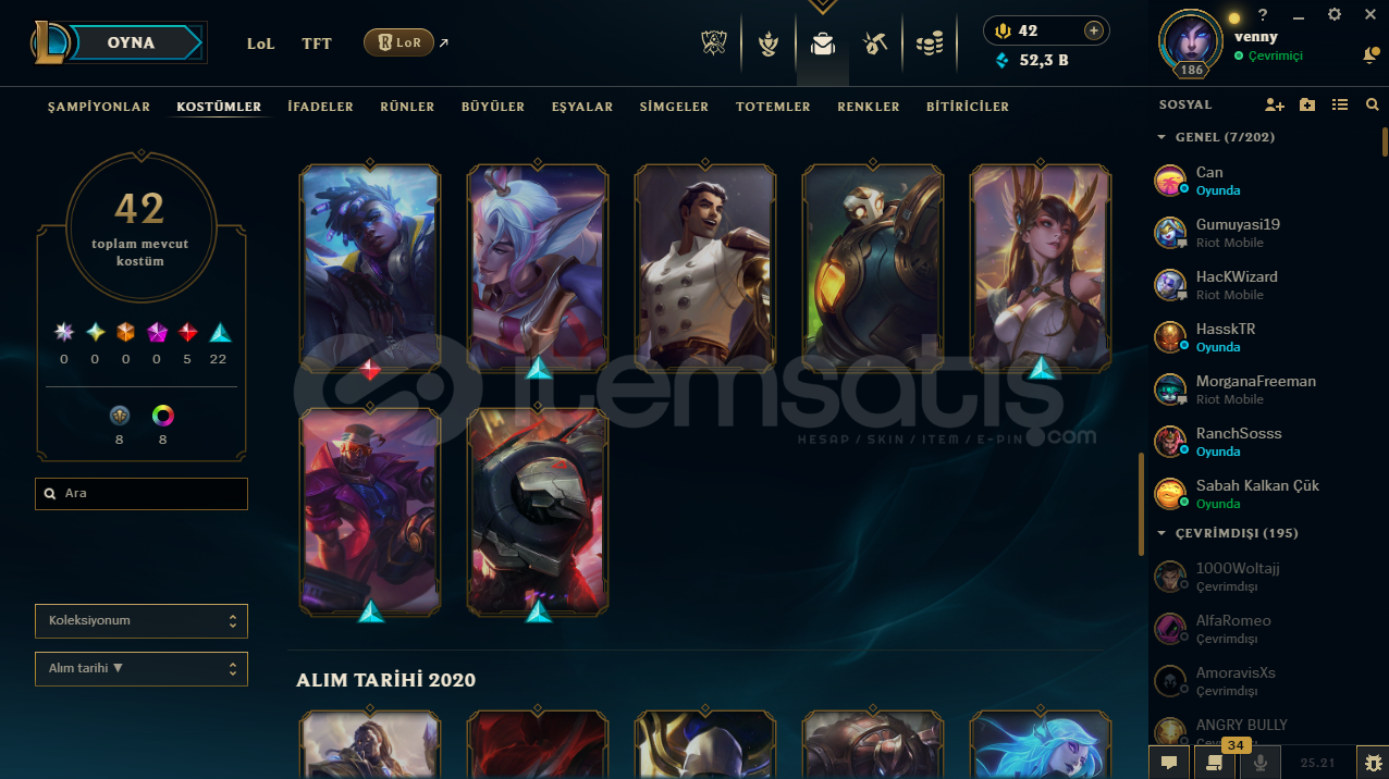 Merhabalar lol hesabımı paraya ihtiyacım olduğu için satıyorum hesap baya eskidir mail değişimi yapılacak hiçbir sorun çıkmayacaktır.42 tane kostüm var 186 seviye doya doya oynayabilirsiniz.Valo hesabı plat 2 dir.şimdiden alan kişiye hayırlı olsun.FİYATI 500 LİRA FAKAT SİZ ÖDEMEYİ VP KODU OLARAK YAPIN!!!! www.itemsatis.com/urunler/valorant/valorant-2050-vp.html ALMADAN &O...