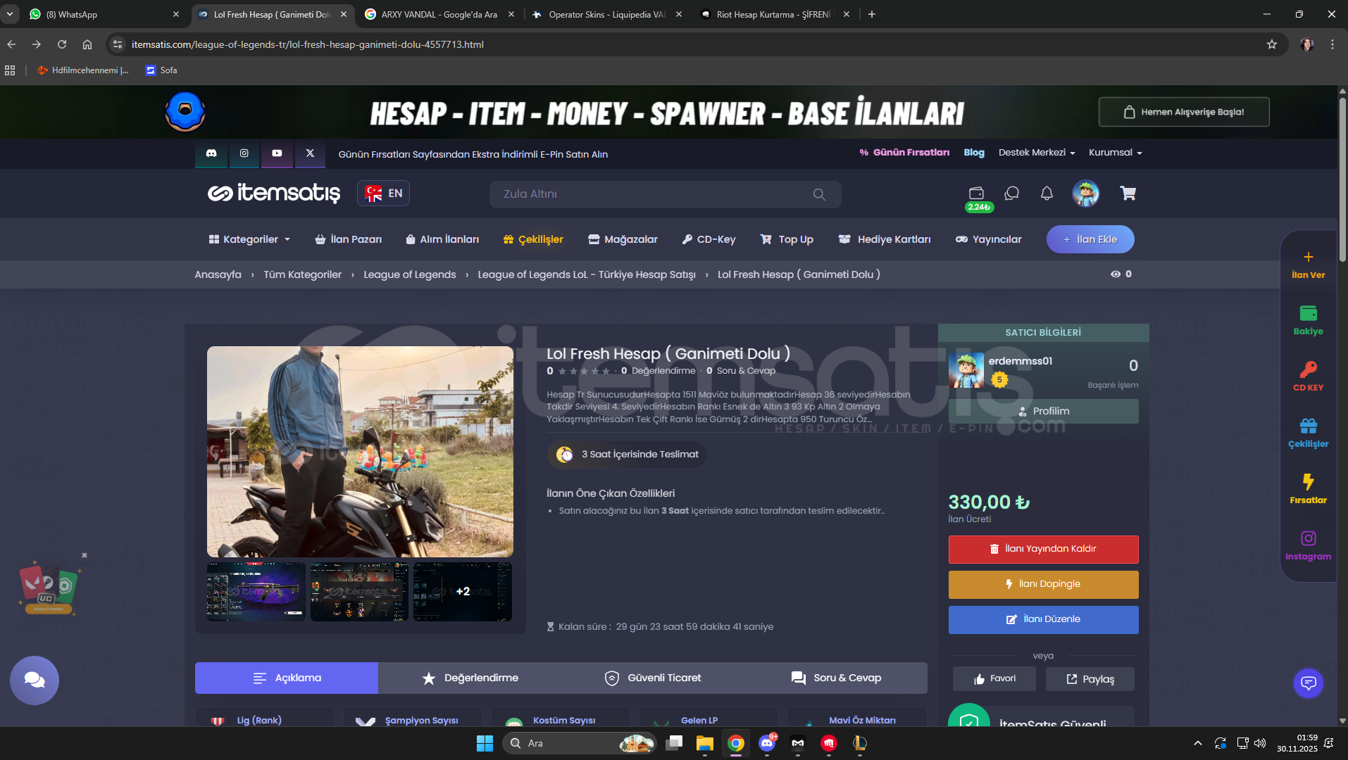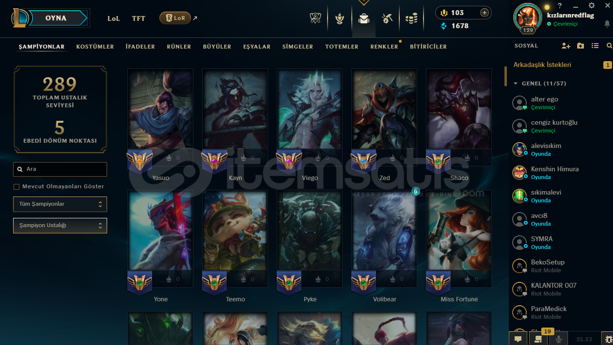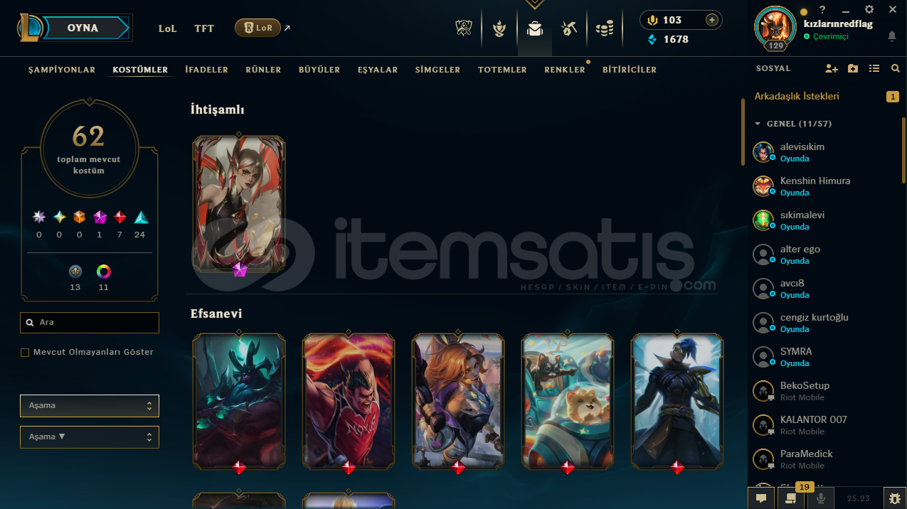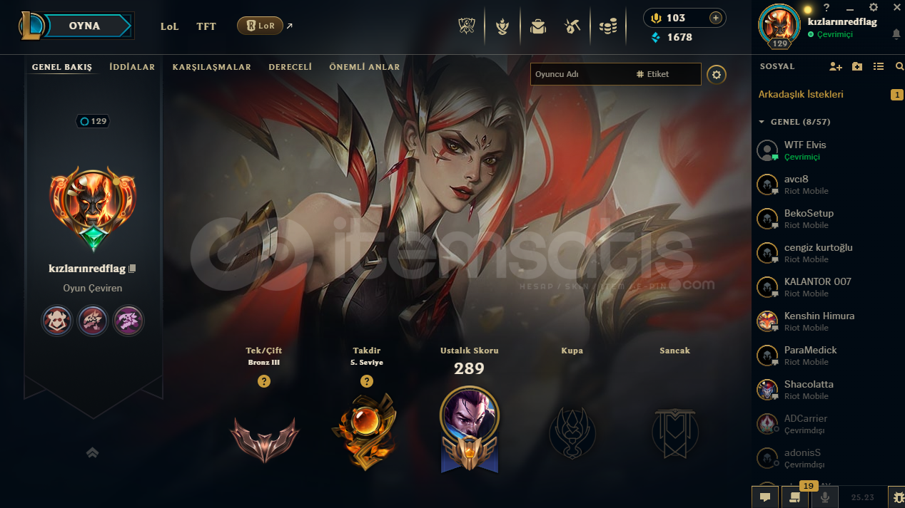 Hesap Tr SunucusudurHesabın Mail Değişimi Yapılıcaktır1678 Maviöz 108 Rp BulunmaktadirHesapta 79 İfade,110 Simge,13 Totem ve 11 Renk BulunurHesapta Sadece 36 Karakter Açık Degildir Geri Kalanalr AçıktırHesabın Tek Cift Rankı Bronz3Hesabın Esnek Rankı Demir 1 dirHesabın Takdir Seviyesi 5. SeviyedirHesap 129 Levelin Sonundadir 130 a cok yakındır--------------------------------------------------S...