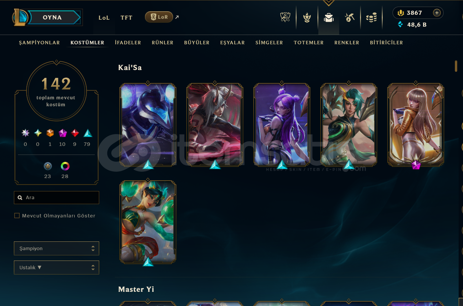 Hesapta 600k Kai'sa, 500k Master Yi, 220k Vayne, 200k Caitlyn,100k Nilah,Samira 90k Aphelios vardır. Adc main hesabıdır. 1. Seri ebedileri bütün kahramanlar için açıktır ve bütün kahramanlar açıktır. Wild Rift hesabı da vardır. İlgilenenler yazabilir.