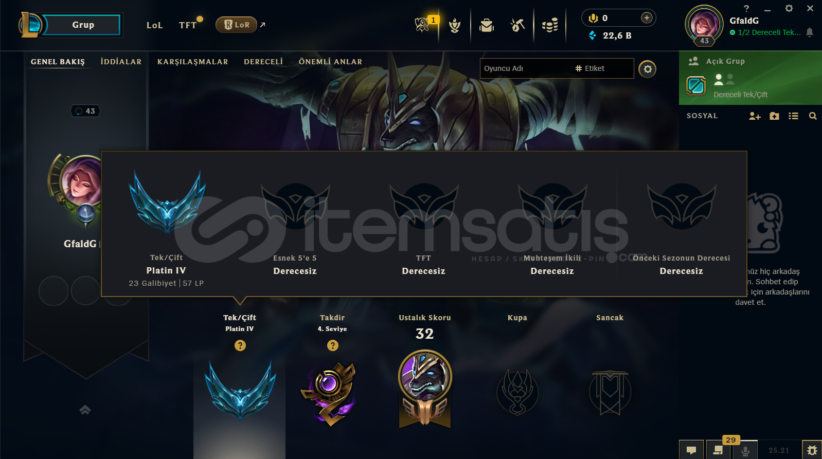 PLAT 4 MAİNLEMELİK TERTEMİZ LOL HESAP GELEN LP 38 GİDEN LP 12