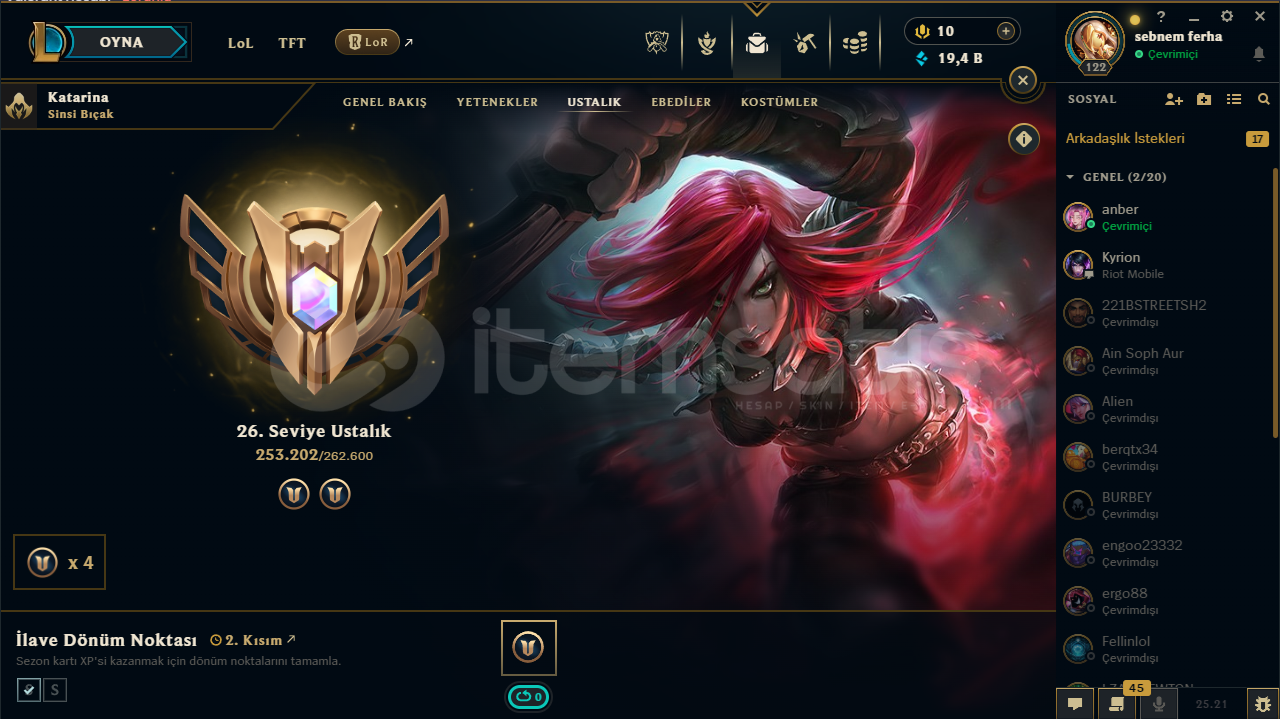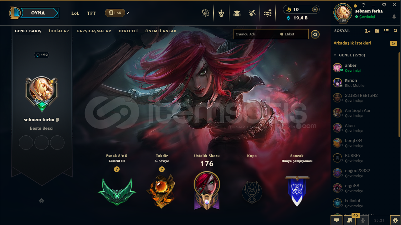 Lol TR 122 level flex zümrüt hesap 4 efsanevi 18 destansı 11 tane de hatıra kostüm var 250k katarina var. chibi yüce kılıç irelia var tek başına 22krp. almak isteyen bana ulaşsın