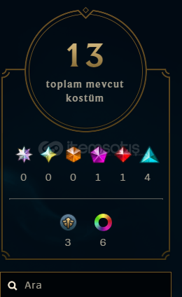 18 KOSTÜM (5 KRİSTAL) 1 İHTİŞAMLI 1 EFSANEVİ 4 DESTANSI 3 HATIRA 6 KOSTÜM RENKLERİ