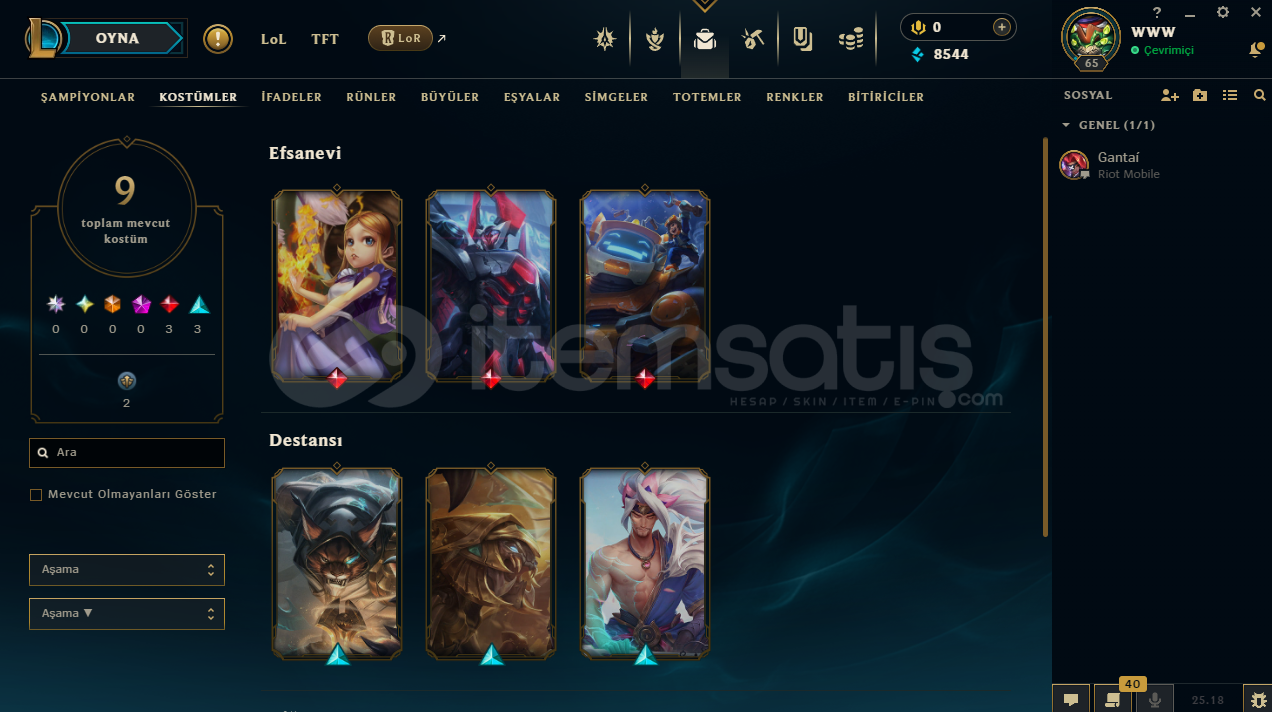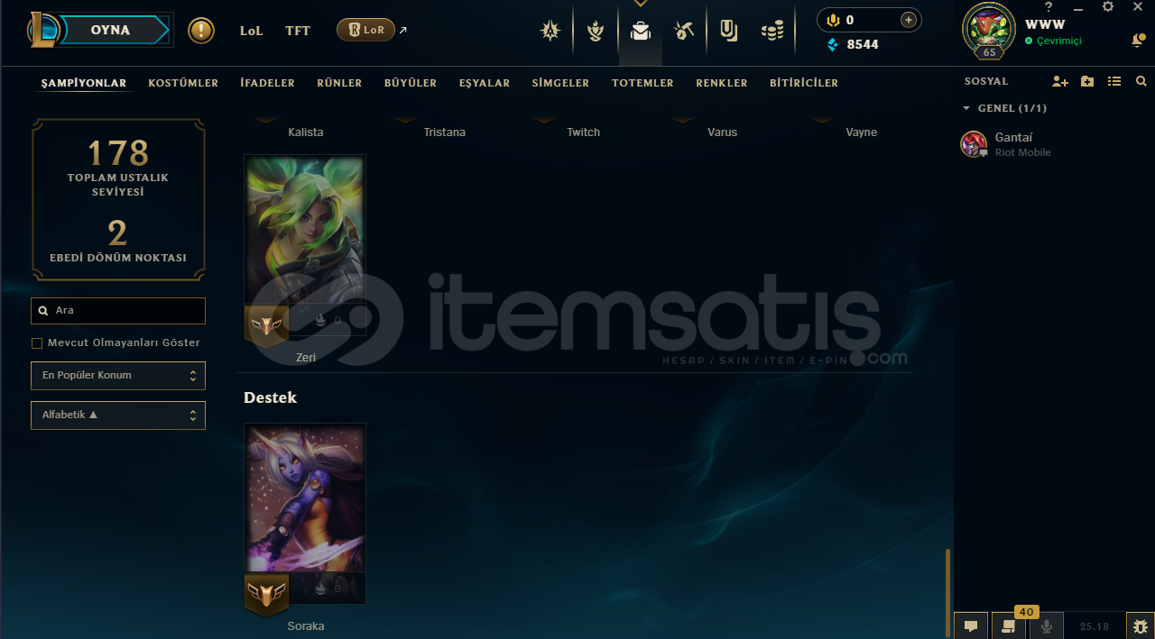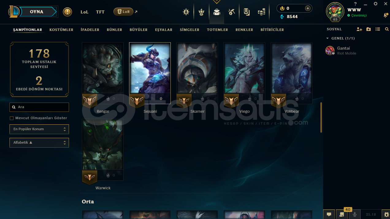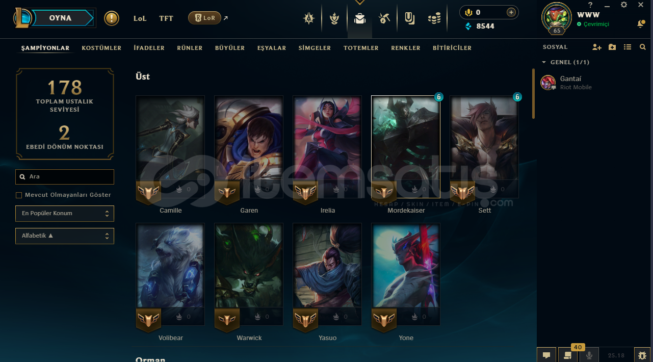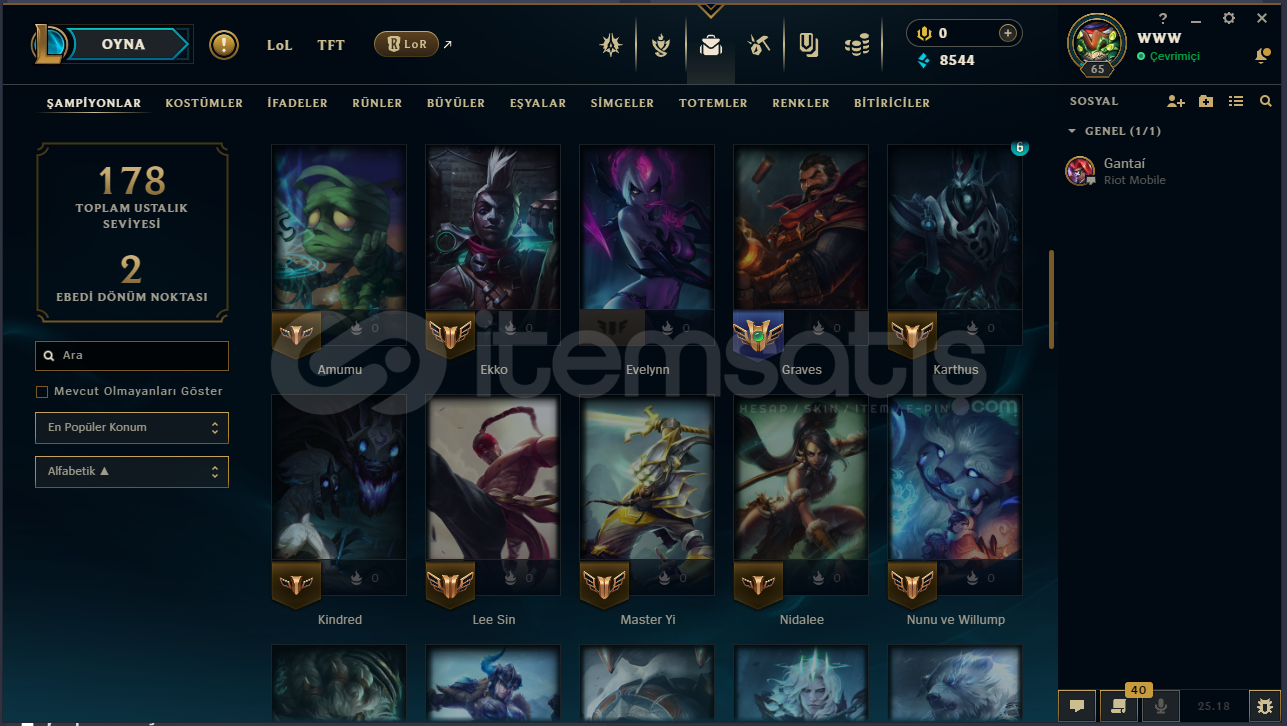 Smurfluk LoL Hesabı Mail Devri Vardırİçindekinler:Kod Adı MordekaiserAnnie Harikalar DiyarındaNunu ve Willump BotKumların Muhafızı RengarKumların Muhafızı SkarnerRuh Çiçeği YasuoSuç Şehri Graves İsyankar VayneKanlı Ay EvelynnHesapta 38 karakter vardırHesabın ilk sahibi benimMail Devri YapılacaktırBiraz Pazarlık Olur