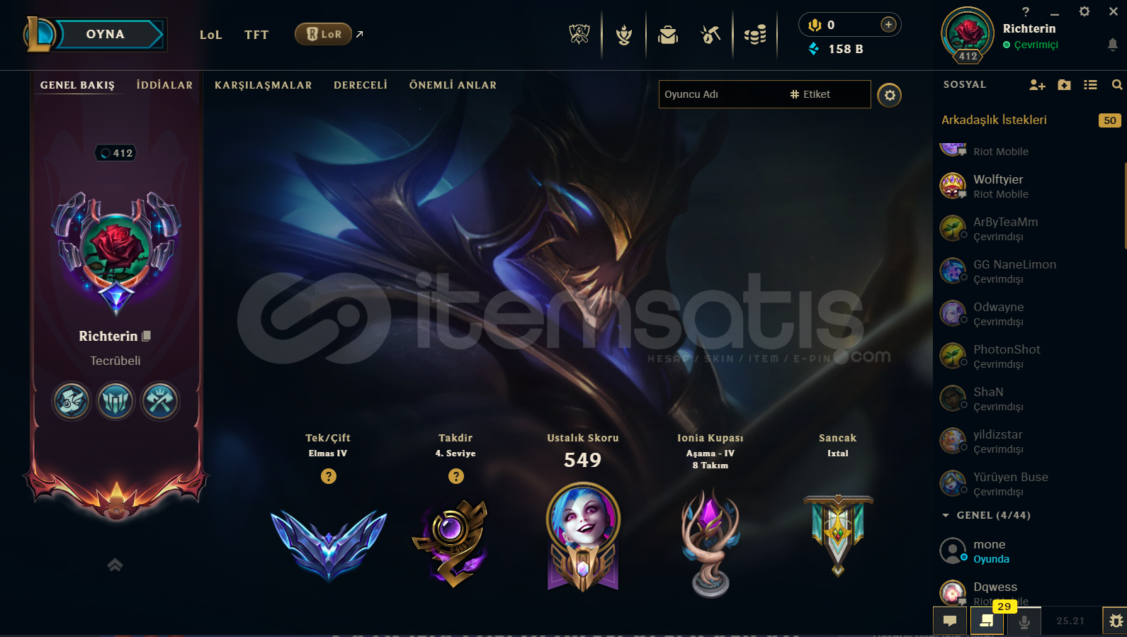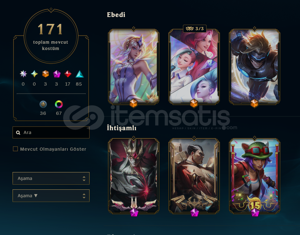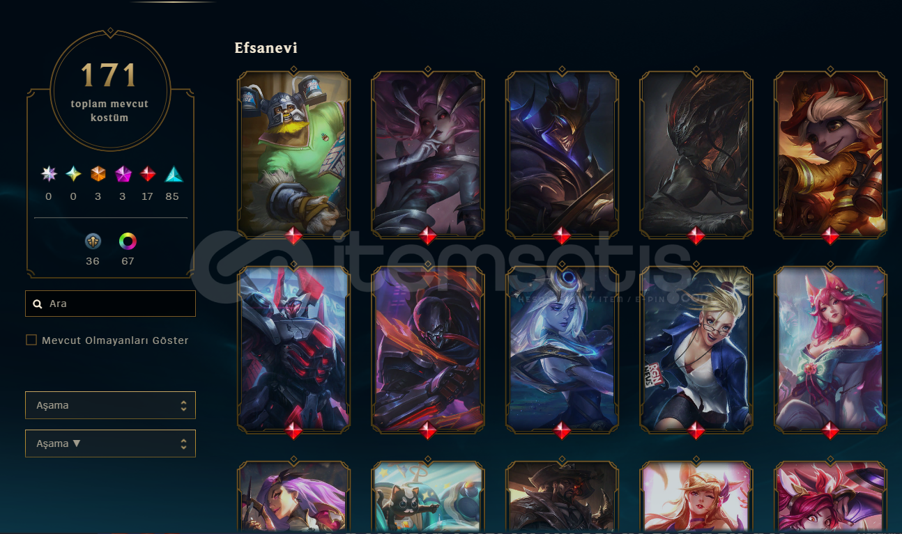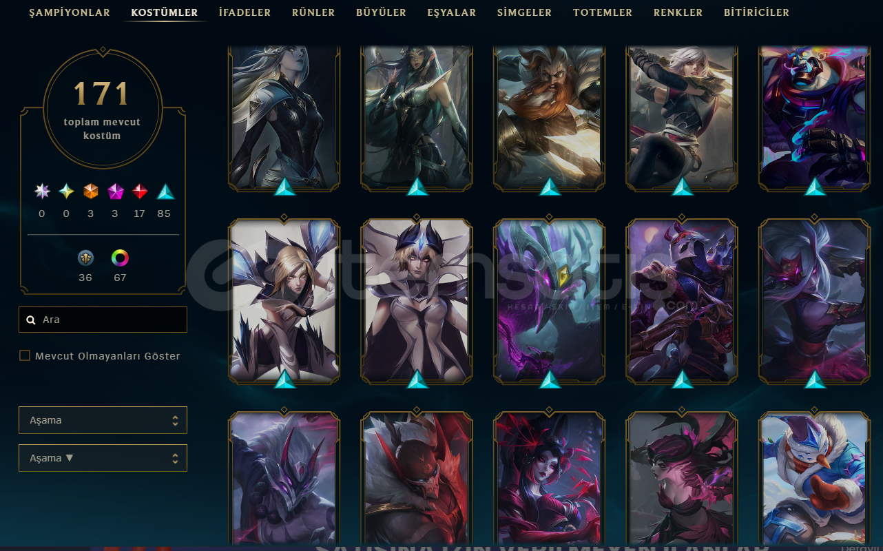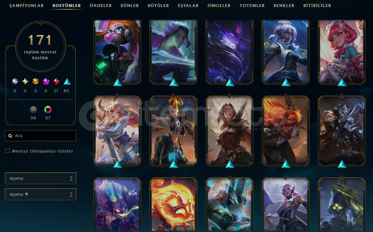 İLK SAHİBİNDEN!!! LEAGUE OF LEGENDS412 SEVİYE171 KOSTÜMEBEDİ:3İHTİŞAMLI:3EFSANEVİ:17DESTANSI:85HATIRA:37RENK:67ELMAS IVGÜZEL MMRTÜM KARAKTERLER AÇIK150K+ MAVİ ÖZVALORANT: İyon phantomUlupençe ghostAsil KarambitKuronomi bıçakFUL KARAKTER