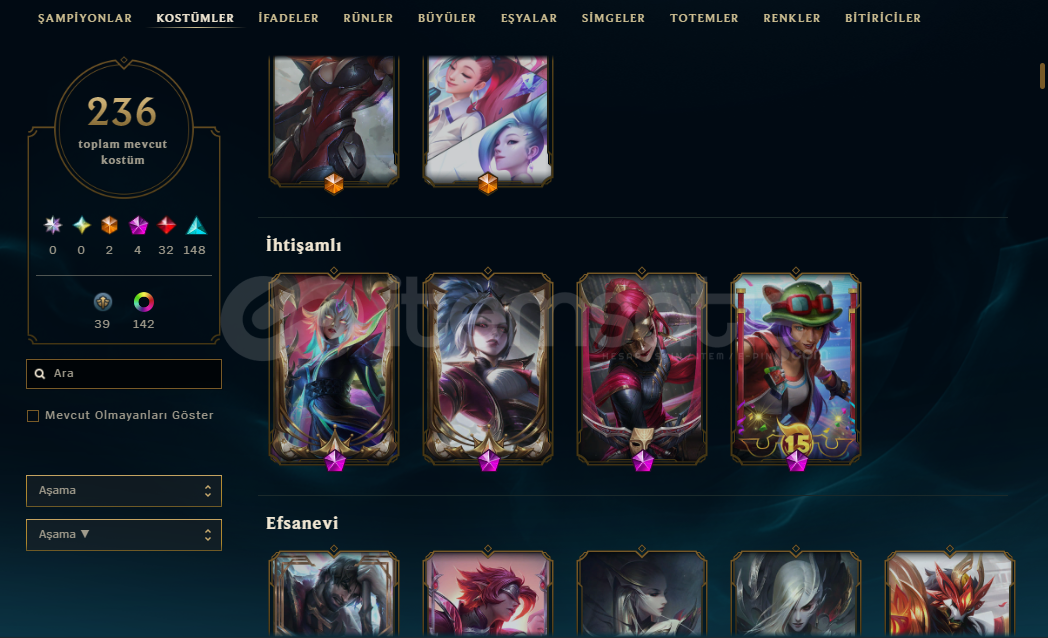 Hesapta görsellerde göründüğü gibi bir sürü kostüm ve kaplama vardır. Bilgi almak için yazınız.