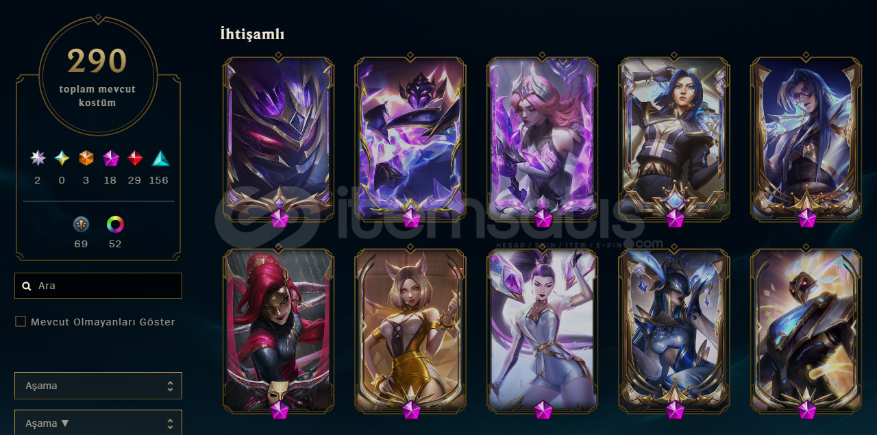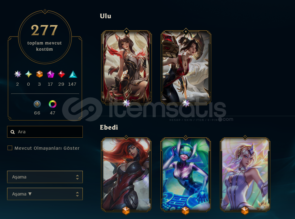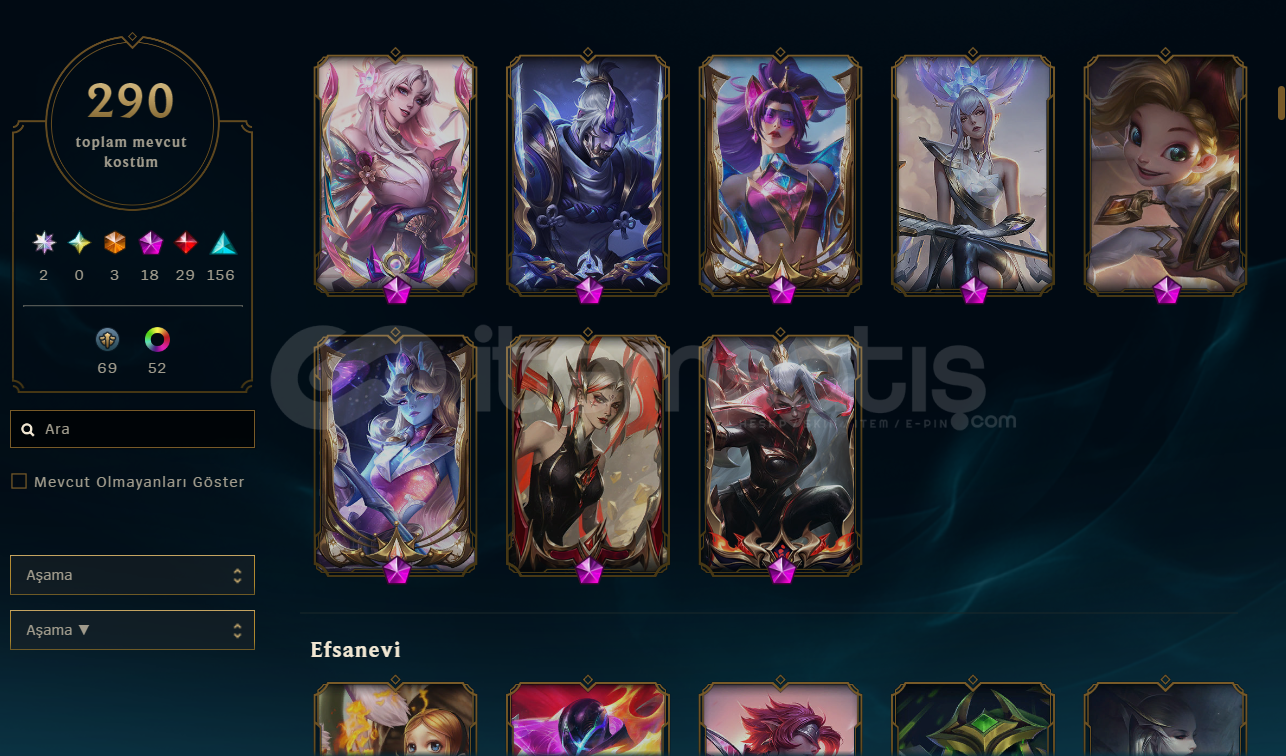 LoLde verebileceğim önemli skin detayları olarak249 level hesap - 460 rp ve 23bin mavi öz varganimet sekmesinde 13 anahtar52 tane skin varYükselen Efsane AhriYükselen Efsane Kai'sa3 ebedi kostüm --- lux - miss fortune - dj sona18 ihtişamlı kostüm 29 efsanevi kostüm156 destansı kostüm69 hatıra kostümler - canlanmış 2012 dünya şampiyonası riven - şanlı kog maw - şanlı master...