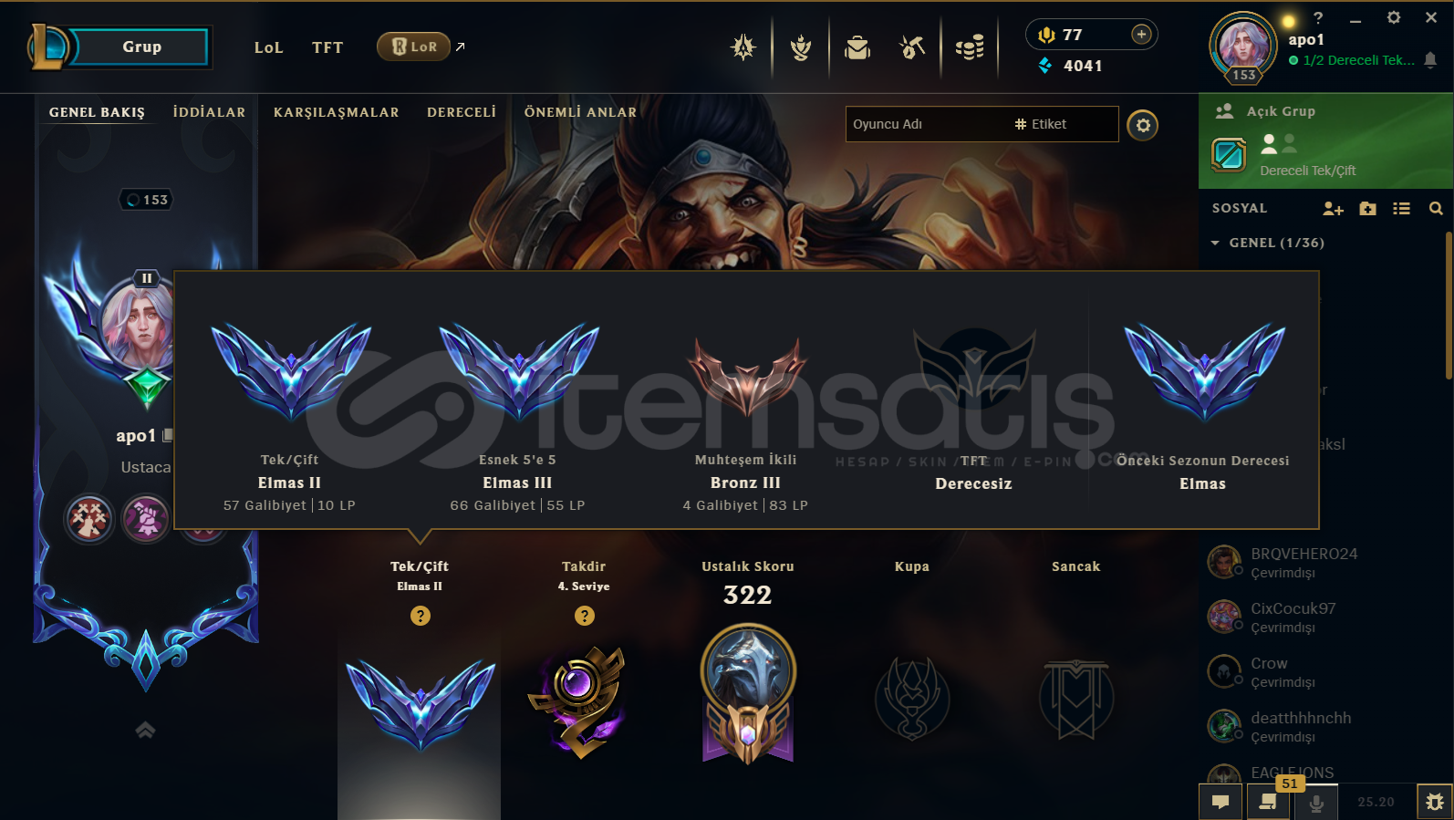 LoL de peak master görmüş şu anda elmas2, valorantta ise ep8 de immortal görmüş şuan da elmas 3 olan hesabımı paraya sıkıştığım için satıyorum. eposta adresi ile vereceğim.