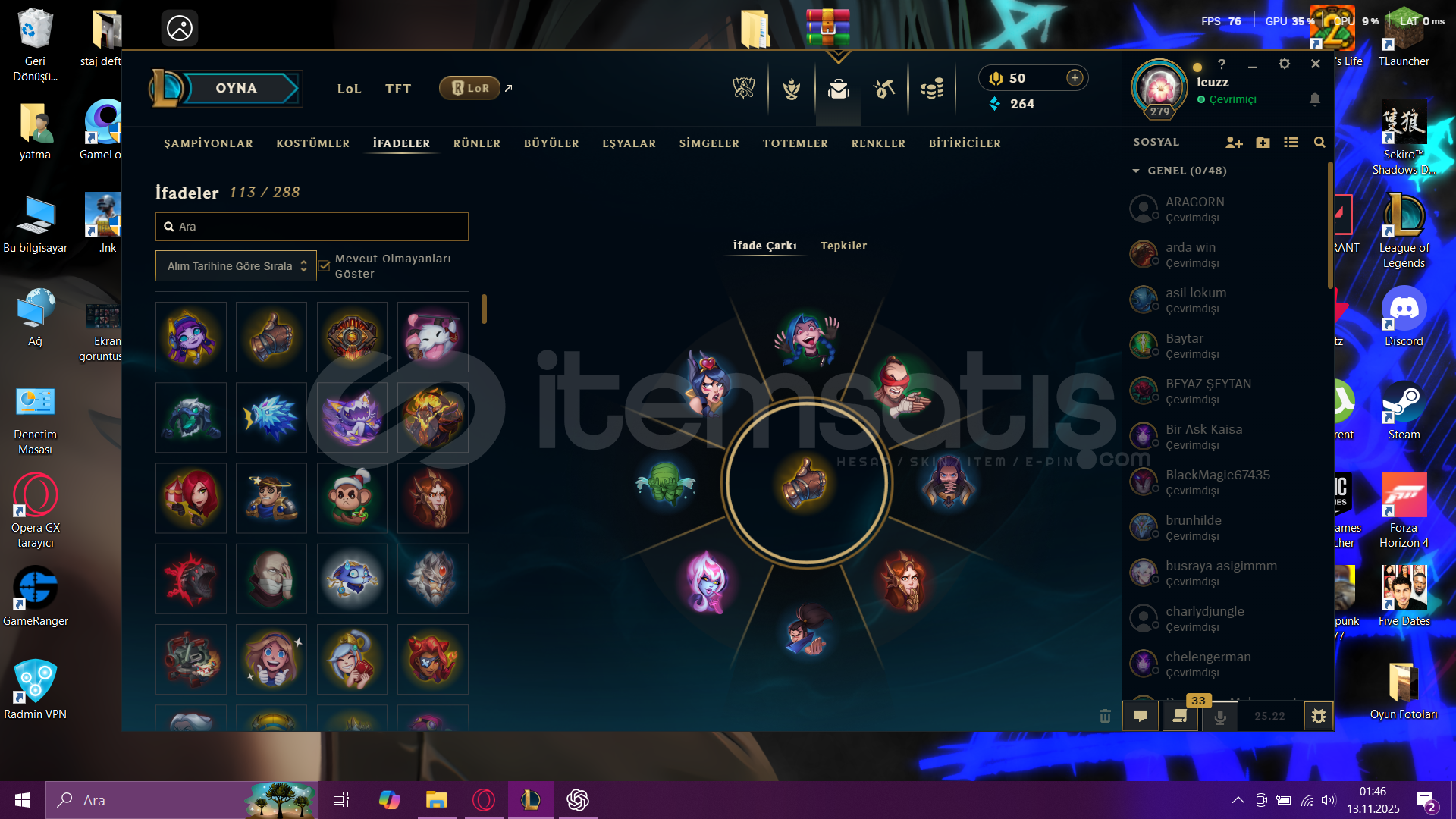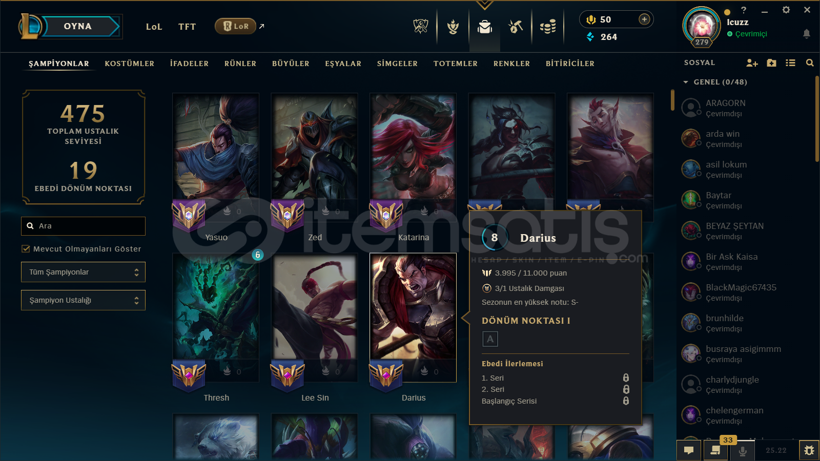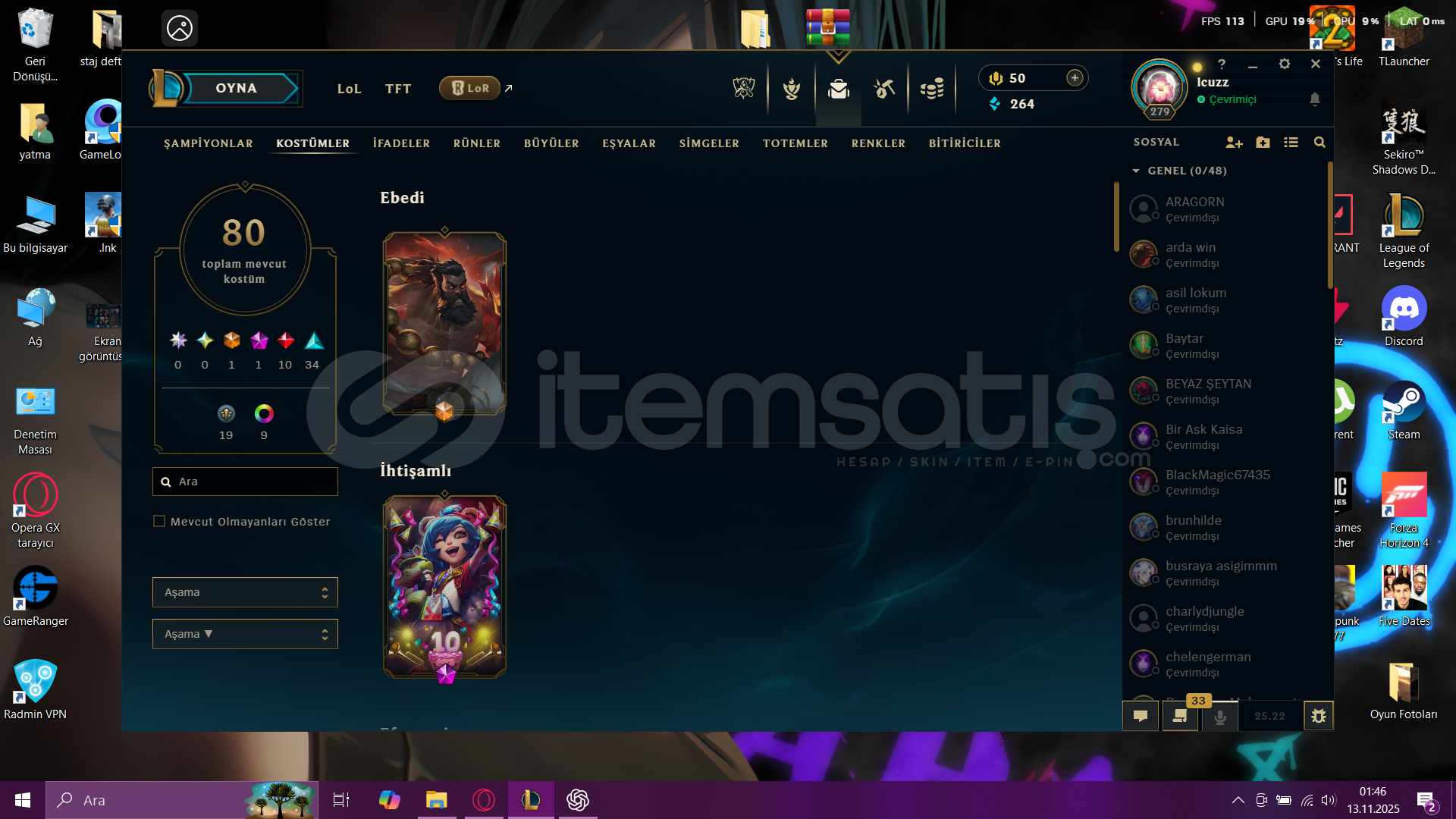 Hesap 280 lvl olup 80 kostüm içerir(1ebedi 1 ihtişamlı 10 efsanevi 34 destansı ve 19 hatıra) hesapta açılmamış yalnızca 21 hero vardır.Anlık olarak gold 4tür.