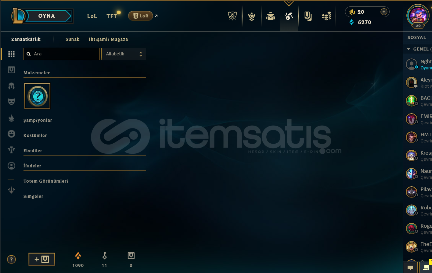 35 Level, ilk sahibiyim. Mail değişimi yapılacak.Kostümler : Yüce Yumruk Lee Sin, Gölgedövmeli Volibear, Sonsuz Karanlık Xerath, Anniemo, Kasap Urgot, Erdem Mızrağı Blitzcrank, Acı Şeker Fiddlesticks, Dünyalar Yıkan Nautilus, Pofuduk Fizz, K/DA Akali, İngiliz Fiddlesticks, Dehşet Şovalyesi Garen, Riot Kızı TristanaGanimet : 11 Anahtar, 1090 Turuncu Öz