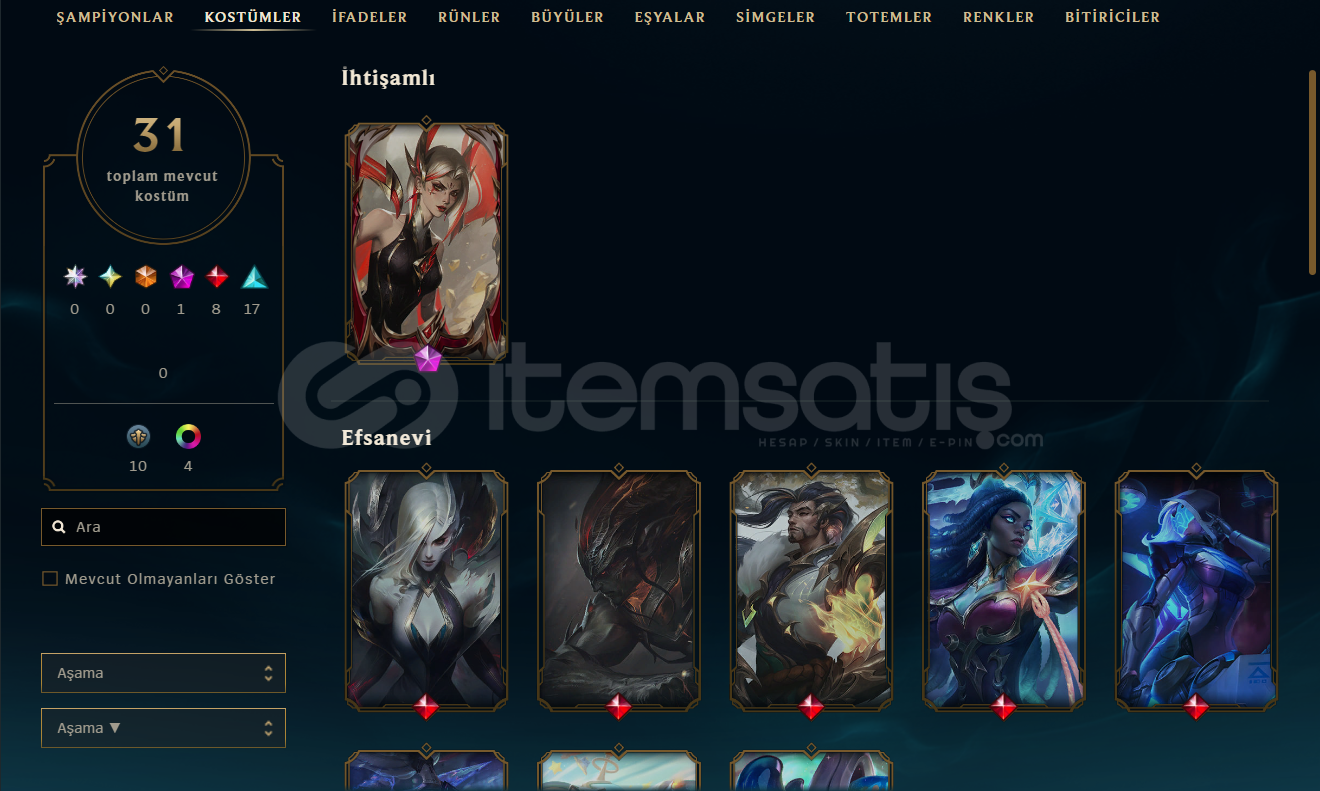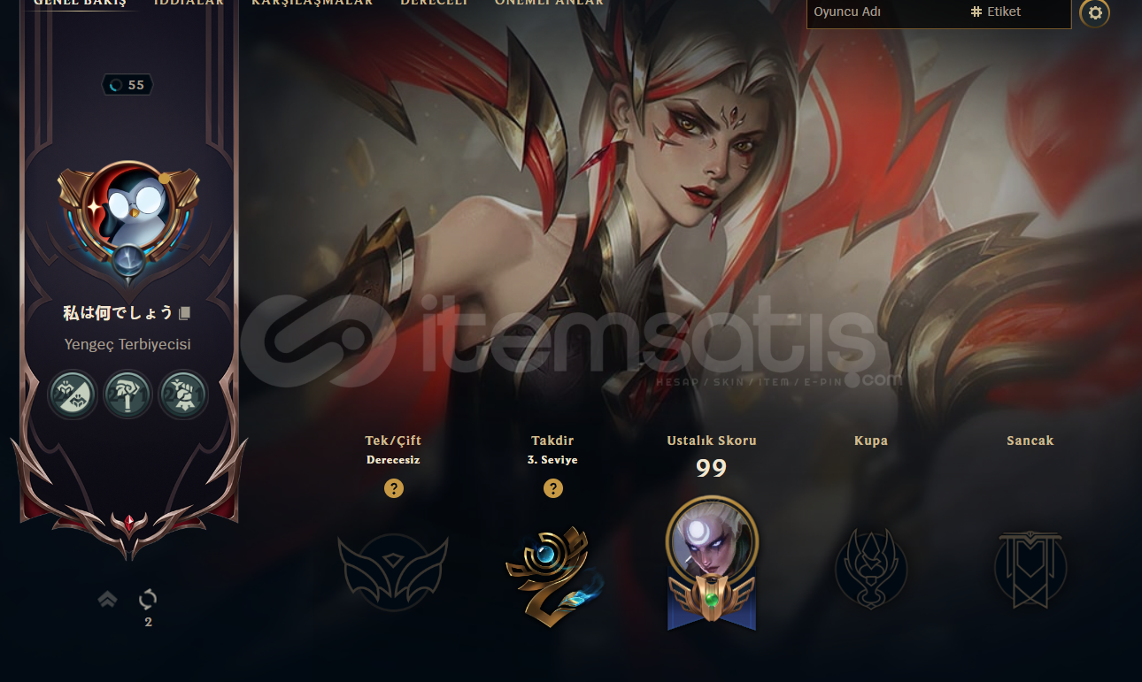 Hesap Ortadoğu sunuculudur. Unrankeddır. 55 Lvl'dir. son maç 23.11.2024'de atılmıştır.Hesaptaki bazı nadide skinler;Yükselen Efsane LeBlancGecenin Kılıcı YasuoHakikat Ejderi YasuoCadılar Meclisi MorganaKod Adı VayneHesapta her laneden mainlemelik herolara skin bulunmaktadır. Takdir seviyesi 3.seviyedir.