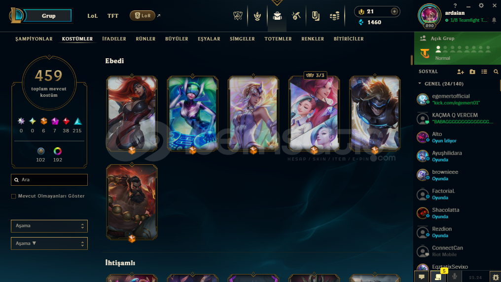 Hesap 2017 de açıldı (890 lvl) 459 adet kostüm bulunmaktadır. Ebedi kostümlerin samira hariç hepsi açıktır. İhtişamlılardan: Anniemo, Kristalis indomitus Kha, Kül mezarşövalye Morde, Prestij Düşmüşlerin kehaneti jarvan4, Prestij Muzaffer general Darius, Prestij Sonsuzluğun sureti zoe ve siveemo vardır. 38 Efsavi kostüm, 215 Destansı kostüm ve 102 hatıra olacak &...