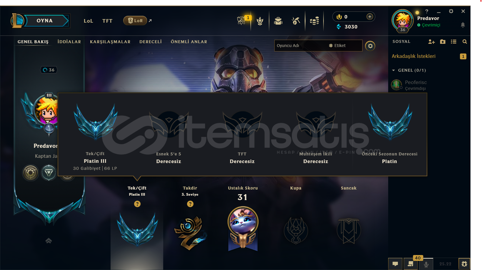merhaba hesap lp gaini yüksek az maç atılmıs güzel hesaptır maıl degısımı olucaktır unranked fiyatına plat3 66lp +38 lp gainiyle beraber otomatık teslımattır iyi günler