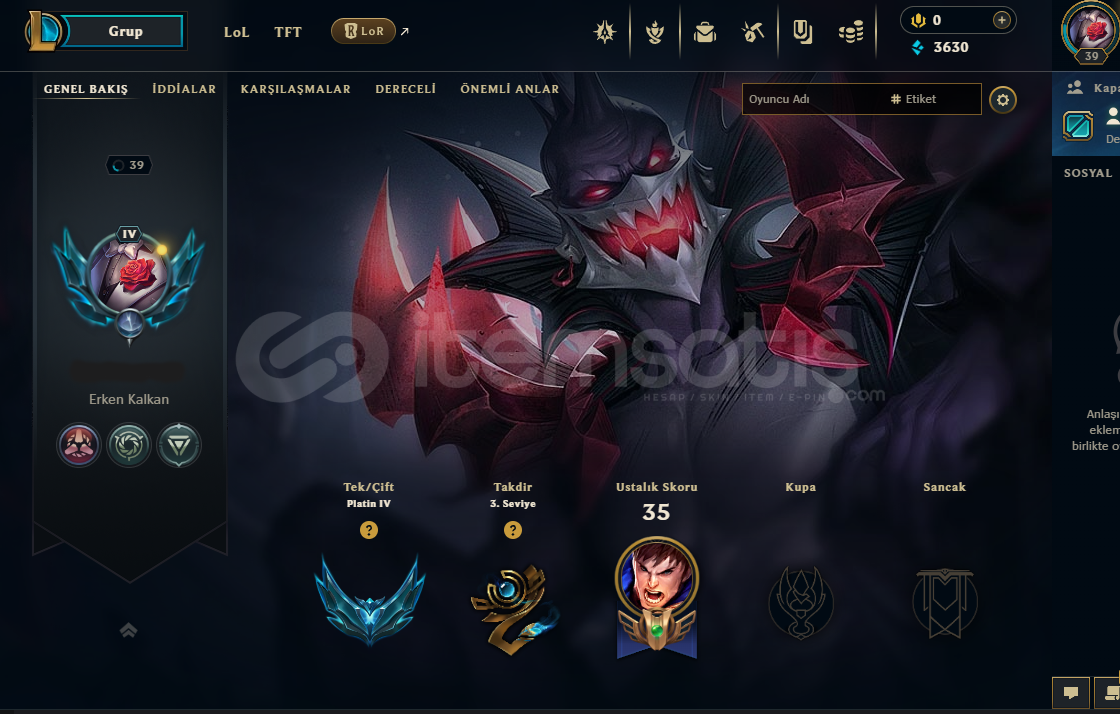 ⭐TR- GAREN - MAİN⭐2022 HESAPHESAP TR PLAT 4 - 29LP39 LVL VE 41 SAMPİYON BULUNMAKTADIR39K GAREN.DRAVEN VE RENEKTON MAİN 11 KOSTÜM BULUNMAKTADIR