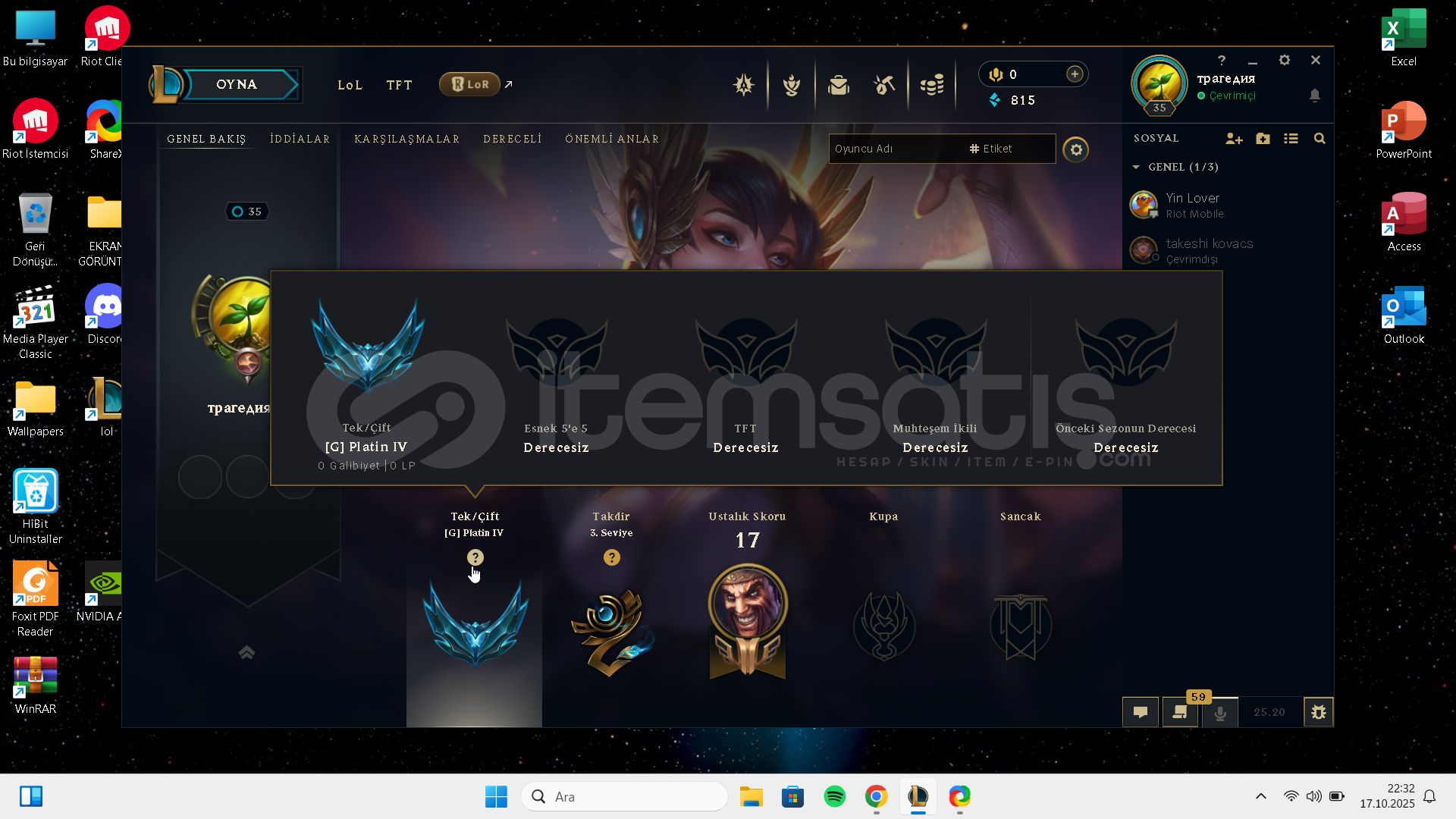 not: hesap yüksek eloluktur zümrüte elmasa +30 üstü lp gaini ile girmek isteyenler kacırmasın derim zaten 4 maç 100 lp ye yakın alıcaksınız kazanırsanız