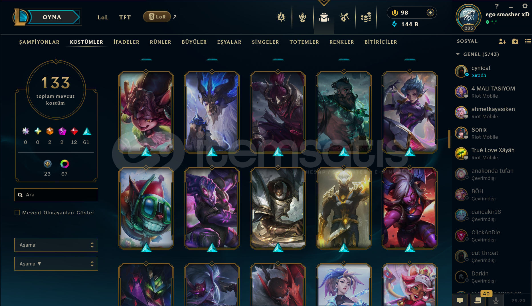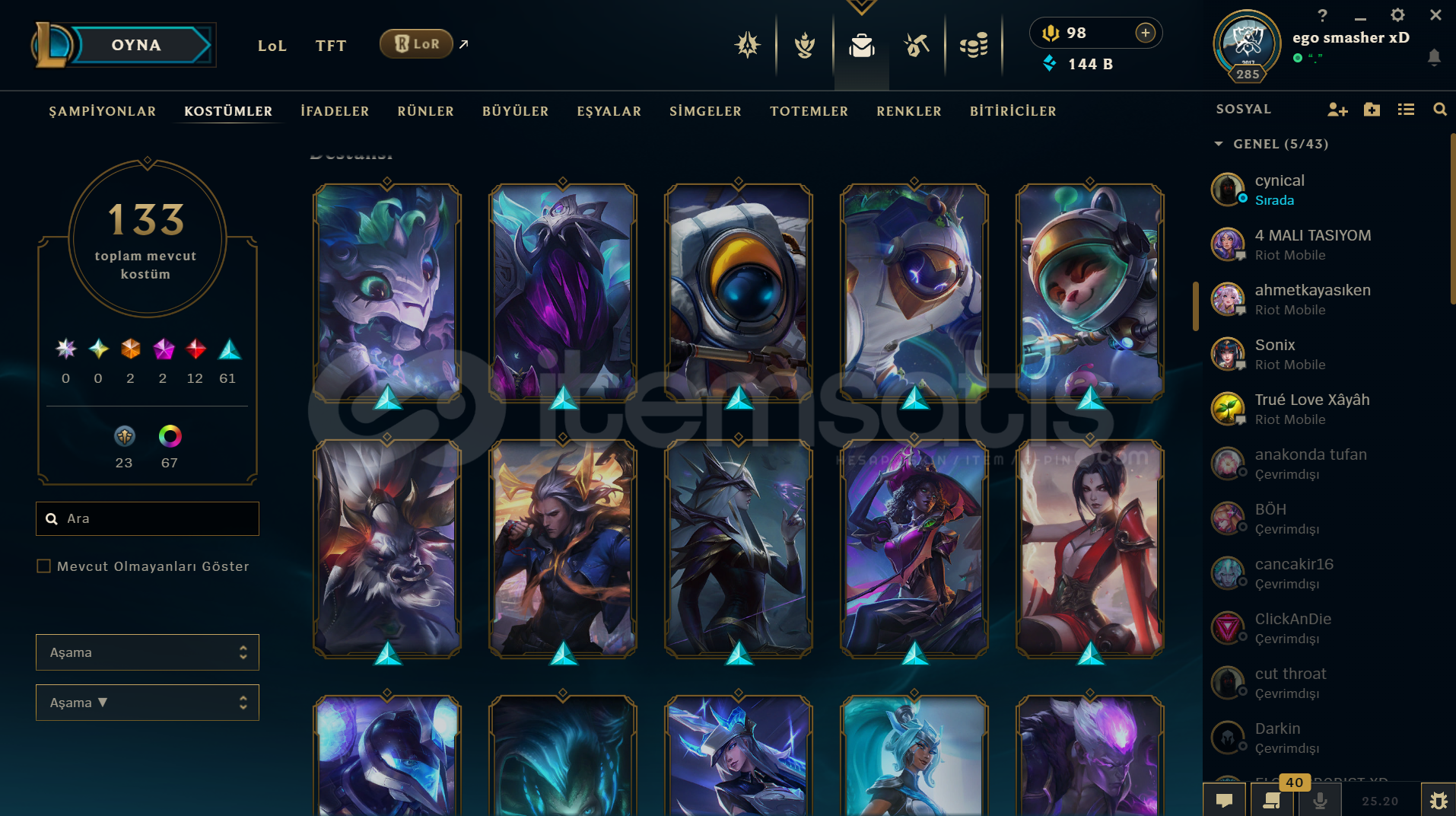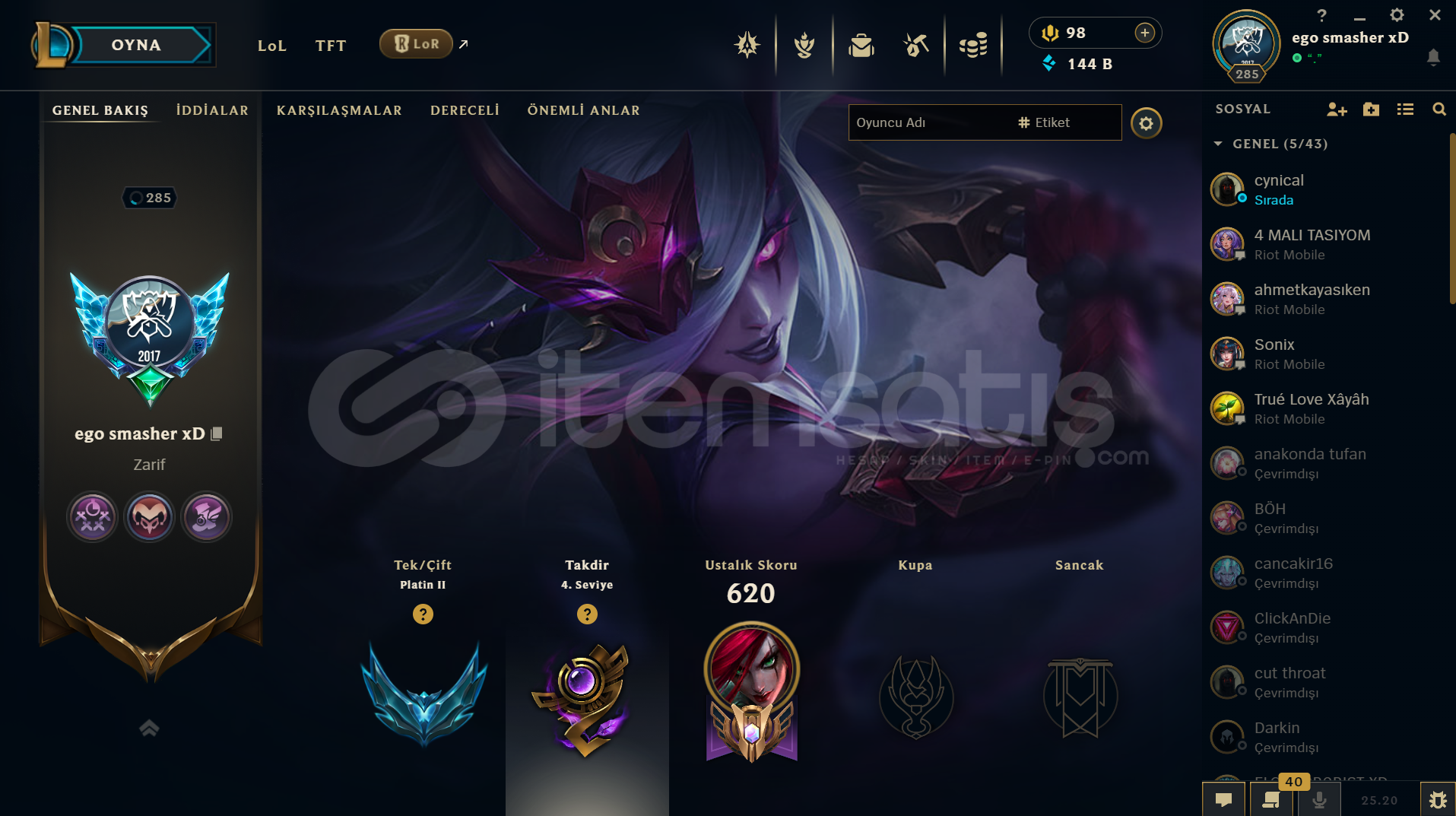 Tüm şampiyonlar açık144k mavi özganimette 38 hextech sandıkgelen lp +25 giden -19katarina tüm renkler açık hatıra hariçtakdir seviyesi 4alıcısına hayırlı olsun