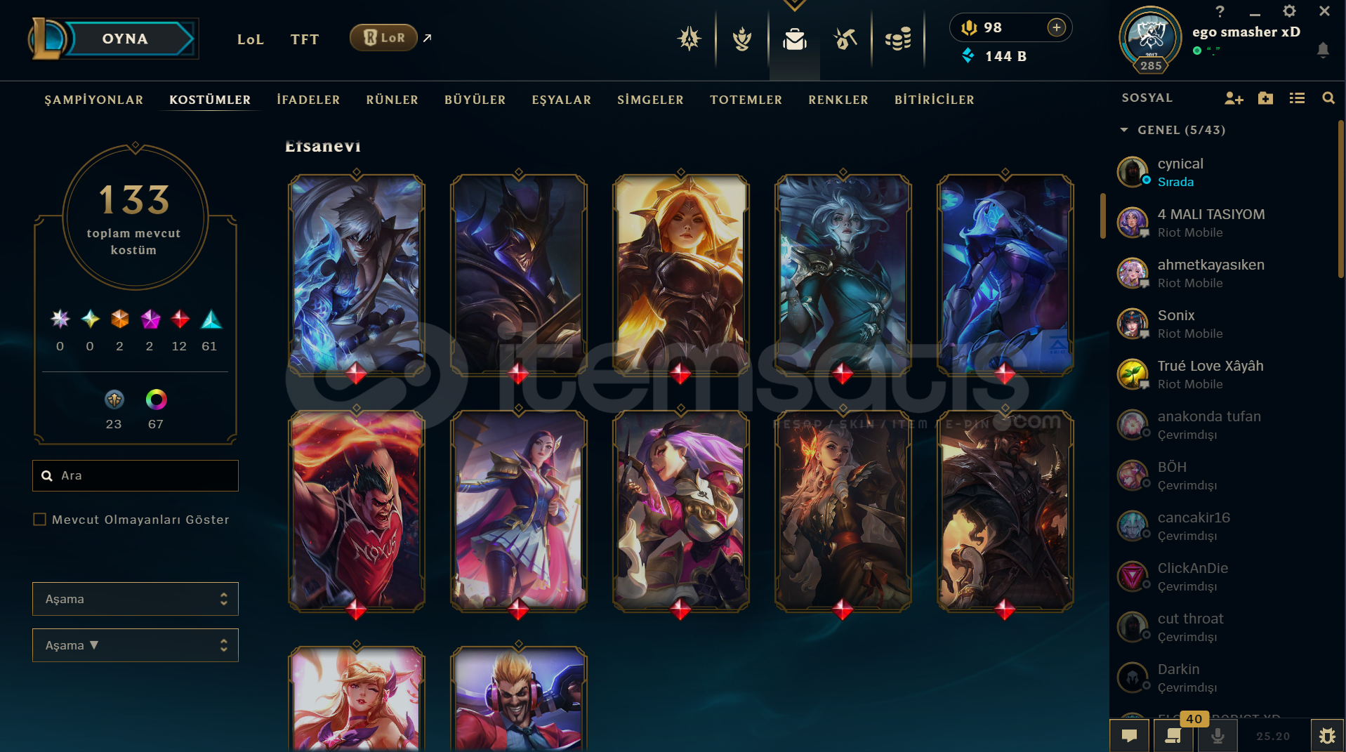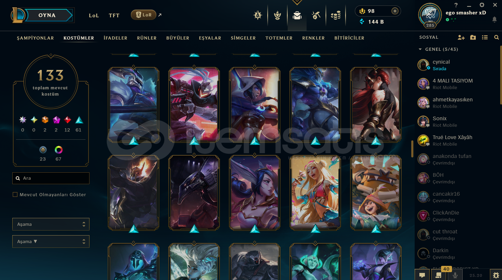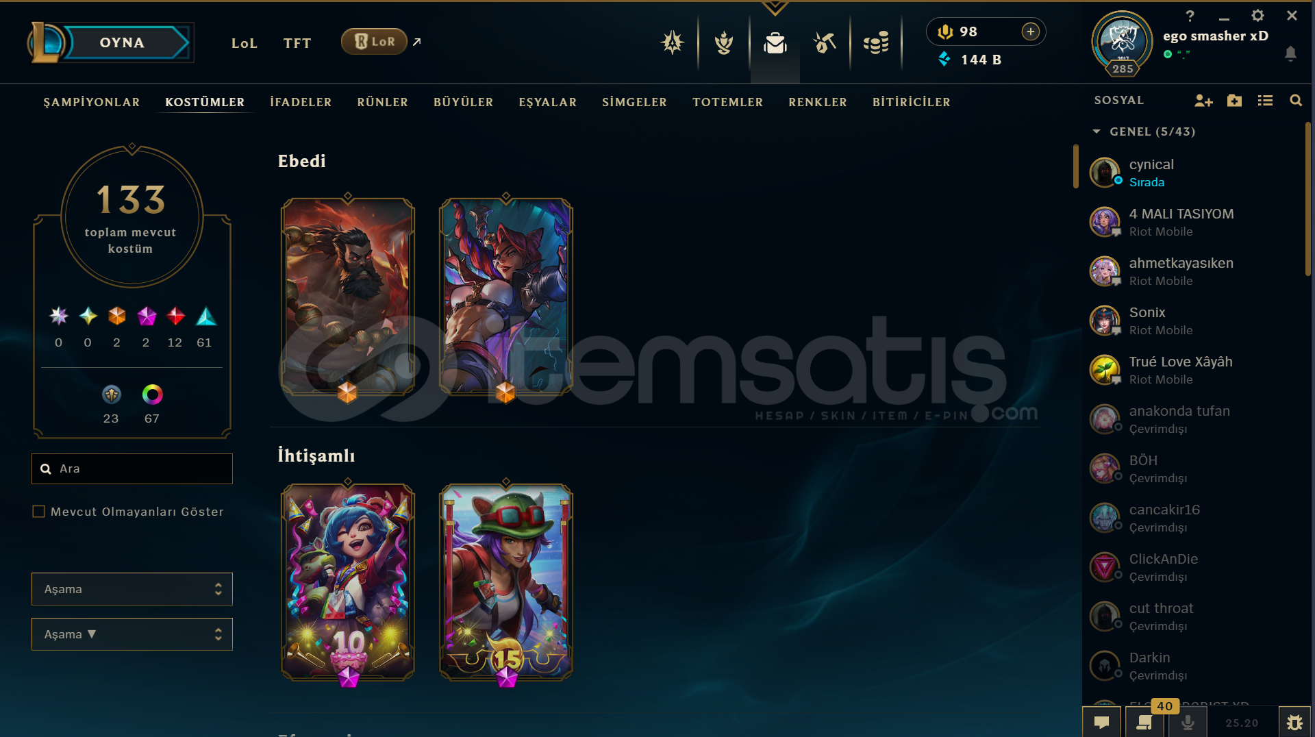 Tüm şampiyonlar açık144k mavi özganimette 38 hextech sandıkgelen lp +25 giden -19katarina tüm renkler açık hatıra hariçtakdir seviyesi 4alıcısına hayırlı olsun
