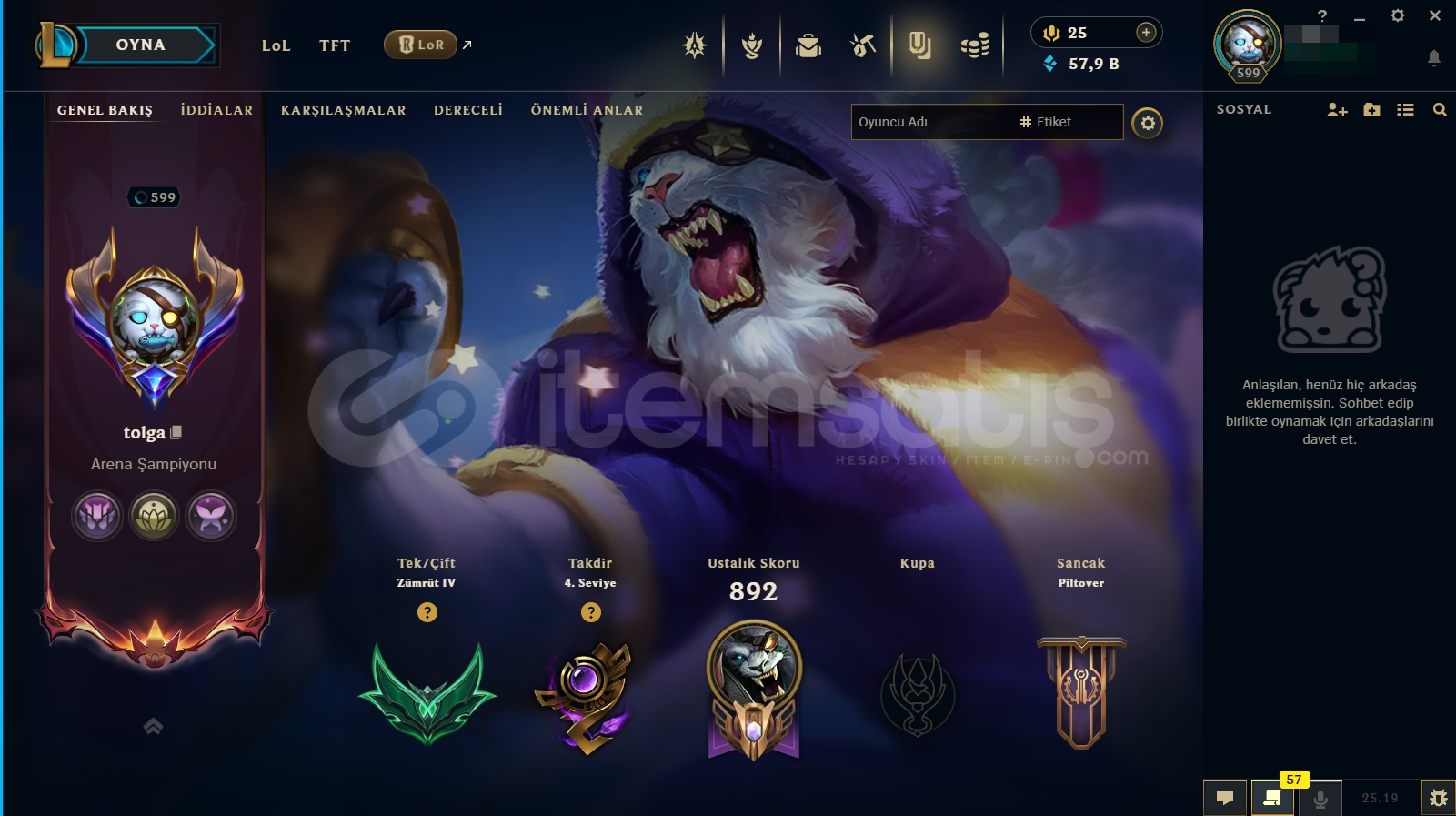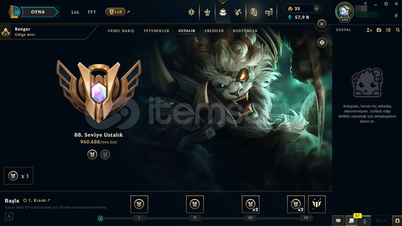 🌙 PRESTİJ RENGAR TR HESABI | ZÜMRÜT 4 | 1 MİLYON USTALIK PUANI 🌙💥 Hesap Özellikleri: • 171 Şampiyon • 310 Kostüm (nadir ve koleksiyonluk) • 109 Renk Paketi • 391 Profil İkonu • 39 Totem Görünümü • 269 İfade⚔️ Öne Çıkanlar:1 Milyon ustalık puanlı Rengar OTPKeyif odaklı hesap, sadece OTP çarı için uygundurSkin Hero Li...